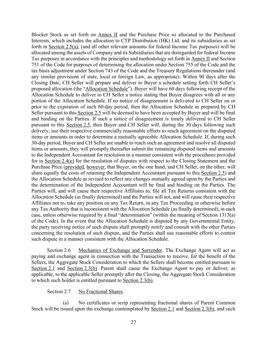 27 Blocker Stock as set forth on Annex II and the Purchase Price so allocated to the Purchased Interests, which includes the allocation to CTP Distribution (HK) Ltd. and its subsidiaries as set forth in Section 2.5(a), (and all other relevant amounts for federal Income Tax purposes) will be allocated among the assets of Company and its Subsidiaries that are disregarded for federal Income Tax purposes in accordance with the principles and methodology set forth in Annex II and Section 751 of the Code for purposes of determining the allocation under Section 755 of the Code and the tax basis adjustment under Section 743 of the Code and the Treasury Regulations thereunder (and any similar provisions of state, local or foreign Law, as appropriate). Within 90 days after the Closing Date, CH Seller will prepare and deliver to Buyer a schedule setting forth CH Seller’s proposed allocation (the “Allocation Schedule”). Buyer will have 60 days following receipt of the Allocation Schedule to deliver to CH Seller a notice stating that Buyer disagrees with all or any portion of the Allocation Schedule. If no notice of disagreement is delivered to CH Seller on or prior to the expiration of such 60-day period, then the Allocation Schedule as prepared by CH Seller pursuant to this Section 2.5 will be deemed to have been accepted by Buyer and will be final and binding on the Parties. If such a notice of disagreement is timely delivered to CH Seller pursuant to this Section 2.5, then Buyer and CH Seller will, during the 30 days following such delivery, use their respective commercially reasonable efforts to reach agreement on the disputed items or amounts in order to determine a mutually agreeable Allocation Schedule. If, during such 30-day period, Buyer and CH Seller are unable to reach such an agreement and resolve all disputed items or amounts, they will promptly thereafter submit the remaining disputed items and amounts to the Independent Accountant for resolution in a manner consistent with the procedures provided for in Section 2.4(e) for the resolution of disputes with respect to the Closing Statement and the Purchase Price (provided, however, that Buyer, on the one hand, and CH Seller, on the other, will share equally the costs of retaining the Independent Accountant pursuant to this Section 2.5) and the Allocation Schedule as revised to reflect any changes mutually agreed upon by the Parties and the determination of the Independent Accountant will be final and binding on the Parties. The Parties will, and will cause their respective Affiliates to, file all Tax Returns consistent with the Allocation Schedule (as finally determined) and the Parties will not, and will cause their respective Affiliates not to, take any position on any Tax Return, in any Tax Proceeding or otherwise before any Tax Authority that is inconsistent with the Allocation Schedule (as finally determined), in each case, unless otherwise required by a final “determination” (within the meaning of Section 1313(a) of the Code). In the event that the Allocation Schedule is disputed by any Governmental Entity, the party receiving notice of such dispute shall promptly notify and consult with the other Parties concerning the resolution of such dispute, and the Parties shall use reasonable efforts to contest such dispute in a manner consistent with the Allocation Schedule. Section 2.6 Mechanics of Exchange and Surrender. The Exchange Agent will act as paying and exchange agent in connection with the Transaction to receive, for the benefit of the Sellers, the Aggregate Stock Consideration to which the Sellers shall become entitled pursuant to Section 2.1 and Section 2.3(b). Parent shall cause the Exchange Agent to pay or deliver, as applicable, to the applicable Seller promptly after the Closing, the Aggregate Stock Consideration to which such holder is entitled pursuant to Section 2.3(b). Section 2.7 No Fractional Shares. (a) No certificates or scrip representing fractional shares of Parent Common Stock will be issued upon the exchange contemplated by Section 2.1 and Section 2.3(b), and such
