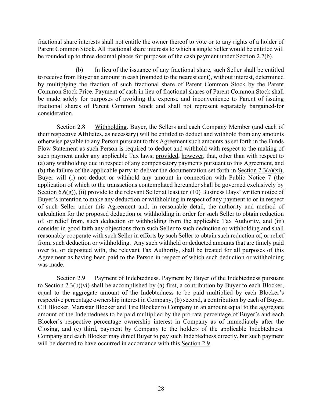 28 fractional share interests shall not entitle the owner thereof to vote or to any rights of a holder of Parent Common Stock. All fractional share interests to which a single Seller would be entitled will be rounded up to three decimal places for purposes of the cash payment under Section 2.7(b). (b) In lieu of the issuance of any fractional share, such Seller shall be entitled to receive from Buyer an amount in cash (rounded to the nearest cent), without interest, determined by multiplying the fraction of such fractional share of Parent Common Stock by the Parent Common Stock Price. Payment of cash in lieu of fractional shares of Parent Common Stock shall be made solely for purposes of avoiding the expense and inconvenience to Parent of issuing fractional shares of Parent Common Stock and shall not represent separately bargained-for consideration. Section 2.8 Withholding. Buyer, the Sellers and each Company Member (and each of their respective Affiliates, as necessary) will be entitled to deduct and withhold from any amounts otherwise payable to any Person pursuant to this Agreement such amounts as set forth in the Funds Flow Statement as such Person is required to deduct and withhold with respect to the making of such payment under any applicable Tax laws; provided, however, that, other than with respect to (a) any withholding due in respect of any compensatory payments pursuant to this Agreement, and (b) the failure of the applicable party to deliver the documentation set forth in Section 2.3(a)(xi), Buyer will (i) not deduct or withhold any amount in connection with Public Notice 7 (the application of which to the transactions contemplated hereunder shall be governed exclusively by Section 6.6(g)), (ii) provide to the relevant Seller at least ten (10) Business Days’ written notice of Buyer’s intention to make any deduction or withholding in respect of any payment to or in respect of such Seller under this Agreement and, in reasonable detail, the authority and method of calculation for the proposed deduction or withholding in order for such Seller to obtain reduction of, or relief from, such deduction or withholding from the applicable Tax Authority, and (iii) consider in good faith any objections from such Seller to such deduction or withholding and shall reasonably cooperate with such Seller in efforts by such Seller to obtain such reduction of, or relief from, such deduction or withholding. Any such withheld or deducted amounts that are timely paid over to, or deposited with, the relevant Tax Authority, shall be treated for all purposes of this Agreement as having been paid to the Person in respect of which such deduction or withholding was made. Section 2.9 Payment of Indebtedness. Payment by Buyer of the Indebtedness pursuant to Section 2.3(b)(vi) shall be accomplished by (a) first, a contribution by Buyer to each Blocker, equal to the aggregate amount of the Indebtedness to be paid multiplied by each Blocker’s respective percentage ownership interest in Company, (b) second, a contribution by each of Buyer, CH Blocker, Marastar Blocker and Tire Blocker to Company in an amount equal to the aggregate amount of the Indebtedness to be paid multiplied by the pro rata percentage of Buyer’s and each Blocker’s respective percentage ownership interest in Company as of immediately after the Closing, and (c) third, payment by Company to the holders of the applicable Indebtedness. Company and each Blocker may direct Buyer to pay such Indebtedness directly, but such payment will be deemed to have occurred in accordance with this Section 2.9.