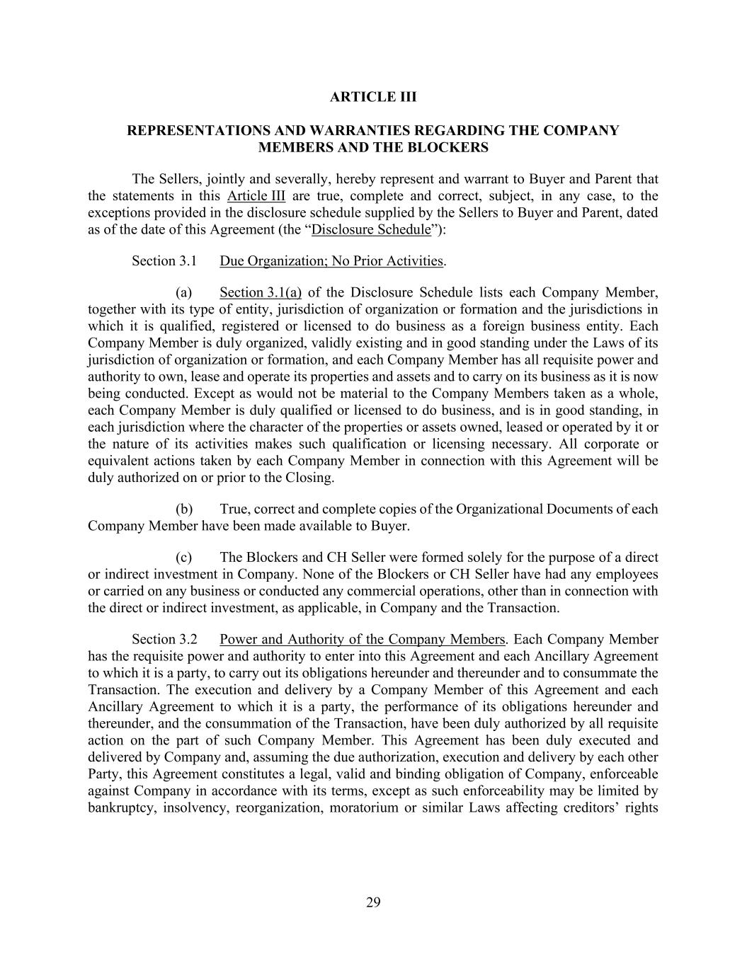 29 ARTICLE III REPRESENTATIONS AND WARRANTIES REGARDING THE COMPANY MEMBERS AND THE BLOCKERS The Sellers, jointly and severally, hereby represent and warrant to Buyer and Parent that the statements in this Article III are true, complete and correct, subject, in any case, to the exceptions provided in the disclosure schedule supplied by the Sellers to Buyer and Parent, dated as of the date of this Agreement (the “Disclosure Schedule”): Section 3.1 Due Organization; No Prior Activities. (a) Section 3.1(a) of the Disclosure Schedule lists each Company Member, together with its type of entity, jurisdiction of organization or formation and the jurisdictions in which it is qualified, registered or licensed to do business as a foreign business entity. Each Company Member is duly organized, validly existing and in good standing under the Laws of its jurisdiction of organization or formation, and each Company Member has all requisite power and authority to own, lease and operate its properties and assets and to carry on its business as it is now being conducted. Except as would not be material to the Company Members taken as a whole, each Company Member is duly qualified or licensed to do business, and is in good standing, in each jurisdiction where the character of the properties or assets owned, leased or operated by it or the nature of its activities makes such qualification or licensing necessary. All corporate or equivalent actions taken by each Company Member in connection with this Agreement will be duly authorized on or prior to the Closing. (b) True, correct and complete copies of the Organizational Documents of each Company Member have been made available to Buyer. (c) The Blockers and CH Seller were formed solely for the purpose of a direct or indirect investment in Company. None of the Blockers or CH Seller have had any employees or carried on any business or conducted any commercial operations, other than in connection with the direct or indirect investment, as applicable, in Company and the Transaction. Section 3.2 Power and Authority of the Company Members. Each Company Member has the requisite power and authority to enter into this Agreement and each Ancillary Agreement to which it is a party, to carry out its obligations hereunder and thereunder and to consummate the Transaction. The execution and delivery by a Company Member of this Agreement and each Ancillary Agreement to which it is a party, the performance of its obligations hereunder and thereunder, and the consummation of the Transaction, have been duly authorized by all requisite action on the part of such Company Member. This Agreement has been duly executed and delivered by Company and, assuming the due authorization, execution and delivery by each other Party, this Agreement constitutes a legal, valid and binding obligation of Company, enforceable against Company in accordance with its terms, except as such enforceability may be limited by bankruptcy, insolvency, reorganization, moratorium or similar Laws affecting creditors’ rights