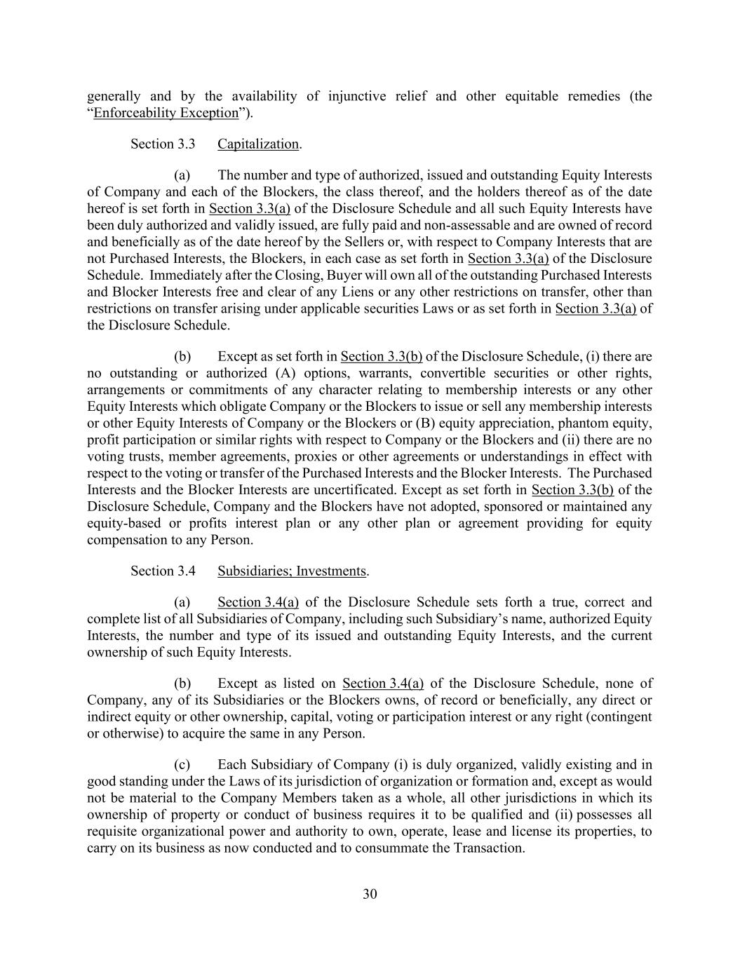30 generally and by the availability of injunctive relief and other equitable remedies (the “Enforceability Exception”). Section 3.3 Capitalization. (a) The number and type of authorized, issued and outstanding Equity Interests of Company and each of the Blockers, the class thereof, and the holders thereof as of the date hereof is set forth in Section 3.3(a) of the Disclosure Schedule and all such Equity Interests have been duly authorized and validly issued, are fully paid and non-assessable and are owned of record and beneficially as of the date hereof by the Sellers or, with respect to Company Interests that are not Purchased Interests, the Blockers, in each case as set forth in Section 3.3(a) of the Disclosure Schedule. Immediately after the Closing, Buyer will own all of the outstanding Purchased Interests and Blocker Interests free and clear of any Liens or any other restrictions on transfer, other than restrictions on transfer arising under applicable securities Laws or as set forth in Section 3.3(a) of the Disclosure Schedule. (b) Except as set forth in Section 3.3(b) of the Disclosure Schedule, (i) there are no outstanding or authorized (A) options, warrants, convertible securities or other rights, arrangements or commitments of any character relating to membership interests or any other Equity Interests which obligate Company or the Blockers to issue or sell any membership interests or other Equity Interests of Company or the Blockers or (B) equity appreciation, phantom equity, profit participation or similar rights with respect to Company or the Blockers and (ii) there are no voting trusts, member agreements, proxies or other agreements or understandings in effect with respect to the voting or transfer of the Purchased Interests and the Blocker Interests. The Purchased Interests and the Blocker Interests are uncertificated. Except as set forth in Section 3.3(b) of the Disclosure Schedule, Company and the Blockers have not adopted, sponsored or maintained any equity-based or profits interest plan or any other plan or agreement providing for equity compensation to any Person. Section 3.4 Subsidiaries; Investments. (a) Section 3.4(a) of the Disclosure Schedule sets forth a true, correct and complete list of all Subsidiaries of Company, including such Subsidiary’s name, authorized Equity Interests, the number and type of its issued and outstanding Equity Interests, and the current ownership of such Equity Interests. (b) Except as listed on Section 3.4(a) of the Disclosure Schedule, none of Company, any of its Subsidiaries or the Blockers owns, of record or beneficially, any direct or indirect equity or other ownership, capital, voting or participation interest or any right (contingent or otherwise) to acquire the same in any Person. (c) Each Subsidiary of Company (i) is duly organized, validly existing and in good standing under the Laws of its jurisdiction of organization or formation and, except as would not be material to the Company Members taken as a whole, all other jurisdictions in which its ownership of property or conduct of business requires it to be qualified and (ii) possesses all requisite organizational power and authority to own, operate, lease and license its properties, to carry on its business as now conducted and to consummate the Transaction.