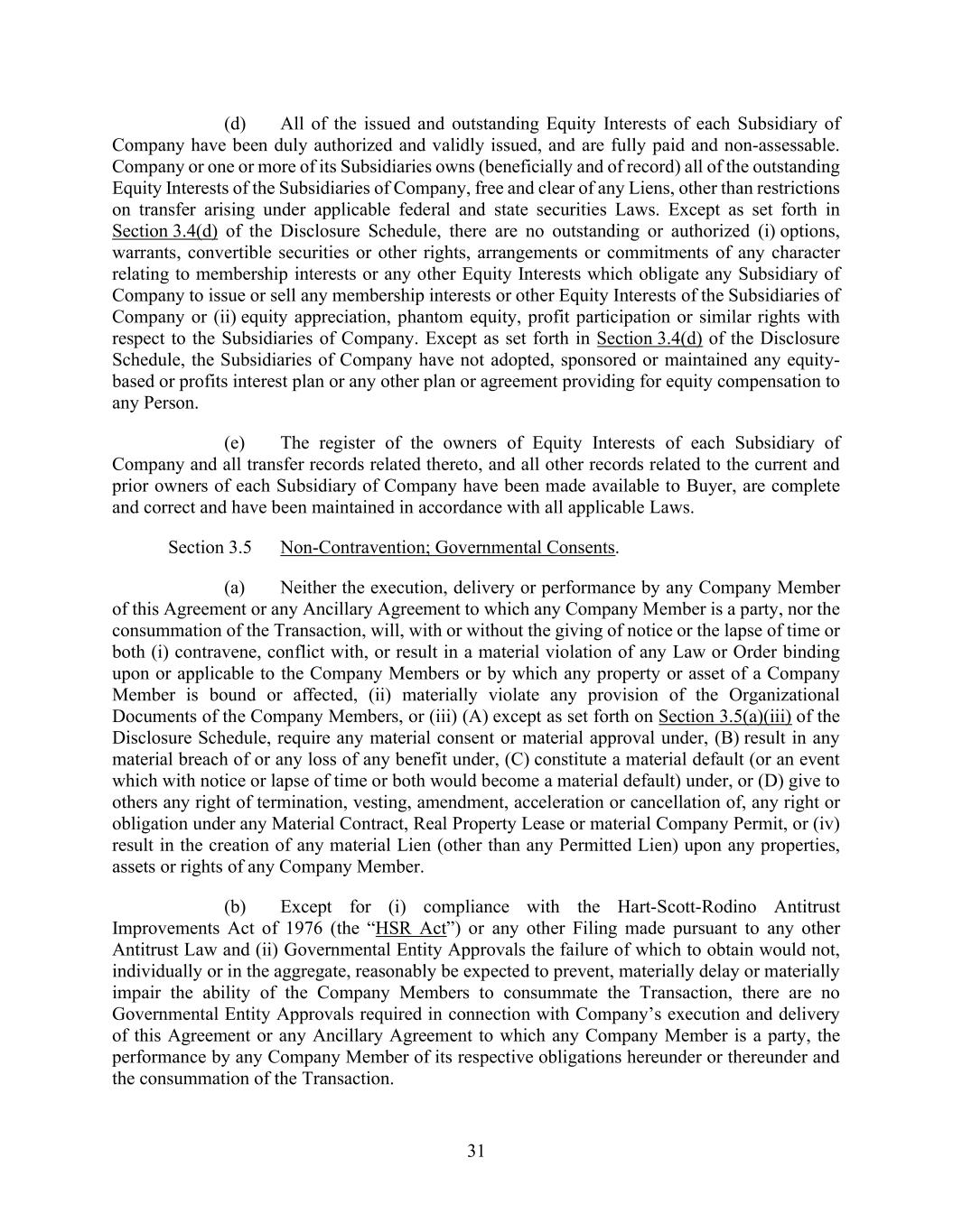 31 (d) All of the issued and outstanding Equity Interests of each Subsidiary of Company have been duly authorized and validly issued, and are fully paid and non-assessable. Company or one or more of its Subsidiaries owns (beneficially and of record) all of the outstanding Equity Interests of the Subsidiaries of Company, free and clear of any Liens, other than restrictions on transfer arising under applicable federal and state securities Laws. Except as set forth in Section 3.4(d) of the Disclosure Schedule, there are no outstanding or authorized (i) options, warrants, convertible securities or other rights, arrangements or commitments of any character relating to membership interests or any other Equity Interests which obligate any Subsidiary of Company to issue or sell any membership interests or other Equity Interests of the Subsidiaries of Company or (ii) equity appreciation, phantom equity, profit participation or similar rights with respect to the Subsidiaries of Company. Except as set forth in Section 3.4(d) of the Disclosure Schedule, the Subsidiaries of Company have not adopted, sponsored or maintained any equity- based or profits interest plan or any other plan or agreement providing for equity compensation to any Person. (e) The register of the owners of Equity Interests of each Subsidiary of Company and all transfer records related thereto, and all other records related to the current and prior owners of each Subsidiary of Company have been made available to Buyer, are complete and correct and have been maintained in accordance with all applicable Laws. Section 3.5 Non-Contravention; Governmental Consents. (a) Neither the execution, delivery or performance by any Company Member of this Agreement or any Ancillary Agreement to which any Company Member is a party, nor the consummation of the Transaction, will, with or without the giving of notice or the lapse of time or both (i) contravene, conflict with, or result in a material violation of any Law or Order binding upon or applicable to the Company Members or by which any property or asset of a Company Member is bound or affected, (ii) materially violate any provision of the Organizational Documents of the Company Members, or (iii) (A) except as set forth on Section 3.5(a)(iii) of the Disclosure Schedule, require any material consent or material approval under, (B) result in any material breach of or any loss of any benefit under, (C) constitute a material default (or an event which with notice or lapse of time or both would become a material default) under, or (D) give to others any right of termination, vesting, amendment, acceleration or cancellation of, any right or obligation under any Material Contract, Real Property Lease or material Company Permit, or (iv) result in the creation of any material Lien (other than any Permitted Lien) upon any properties, assets or rights of any Company Member. (b) Except for (i) compliance with the Hart-Scott-Rodino Antitrust Improvements Act of 1976 (the “HSR Act”) or any other Filing made pursuant to any other Antitrust Law and (ii) Governmental Entity Approvals the failure of which to obtain would not, individually or in the aggregate, reasonably be expected to prevent, materially delay or materially impair the ability of the Company Members to consummate the Transaction, there are no Governmental Entity Approvals required in connection with Company’s execution and delivery of this Agreement or any Ancillary Agreement to which any Company Member is a party, the performance by any Company Member of its respective obligations hereunder or thereunder and the consummation of the Transaction.