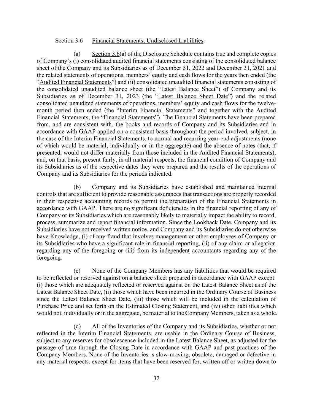 32 Section 3.6 Financial Statements; Undisclosed Liabilities. (a) Section 3.6(a) of the Disclosure Schedule contains true and complete copies of Company’s (i) consolidated audited financial statements consisting of the consolidated balance sheet of the Company and its Subsidiaries as of December 31, 2022 and December 31, 2021 and the related statements of operations, members’ equity and cash flows for the years then ended (the “Audited Financial Statements”) and (ii) consolidated unaudited financial statements consisting of the consolidated unaudited balance sheet (the “Latest Balance Sheet”) of Company and its Subsidiaries as of December 31, 2023 (the “Latest Balance Sheet Date”) and the related consolidated unaudited statements of operations, members’ equity and cash flows for the twelve- month period then ended (the “Interim Financial Statements” and together with the Audited Financial Statements, the “Financial Statements”). The Financial Statements have been prepared from, and are consistent with, the books and records of Company and its Subsidiaries and in accordance with GAAP applied on a consistent basis throughout the period involved, subject, in the case of the Interim Financial Statements, to normal and recurring year-end adjustments (none of which would be material, individually or in the aggregate) and the absence of notes (that, if presented, would not differ materially from those included in the Audited Financial Statements), and, on that basis, present fairly, in all material respects, the financial condition of Company and its Subsidiaries as of the respective dates they were prepared and the results of the operations of Company and its Subsidiaries for the periods indicated. (b) Company and its Subsidiaries have established and maintained internal controls that are sufficient to provide reasonable assurances that transactions are properly recorded in their respective accounting records to permit the preparation of the Financial Statements in accordance with GAAP. There are no significant deficiencies in the financial reporting of any of Company or its Subsidiaries which are reasonably likely to materially impact the ability to record, process, summarize and report financial information. Since the Lookback Date, Company and its Subsidiaries have not received written notice, and Company and its Subsidiaries do not otherwise have Knowledge, (i) of any fraud that involves management or other employees of Company or its Subsidiaries who have a significant role in financial reporting, (ii) of any claim or allegation regarding any of the foregoing or (iii) from its independent accountants regarding any of the foregoing. (c) None of the Company Members has any liabilities that would be required to be reflected or reserved against on a balance sheet prepared in accordance with GAAP except: (i) those which are adequately reflected or reserved against on the Latest Balance Sheet as of the Latest Balance Sheet Date, (ii) those which have been incurred in the Ordinary Course of Business since the Latest Balance Sheet Date, (iii) those which will be included in the calculation of Purchase Price and set forth on the Estimated Closing Statement, and (iv) other liabilities which would not, individually or in the aggregate, be material to the Company Members, taken as a whole. (d) All of the Inventories of the Company and its Subsidiaries, whether or not reflected in the Interim Financial Statements, are usable in the Ordinary Course of Business, subject to any reserves for obsolescence included in the Latest Balance Sheet, as adjusted for the passage of time through the Closing Date in accordance with GAAP and past practices of the Company Members. None of the Inventories is slow-moving, obsolete, damaged or defective in any material respects, except for items that have been reserved for, written off or written down to