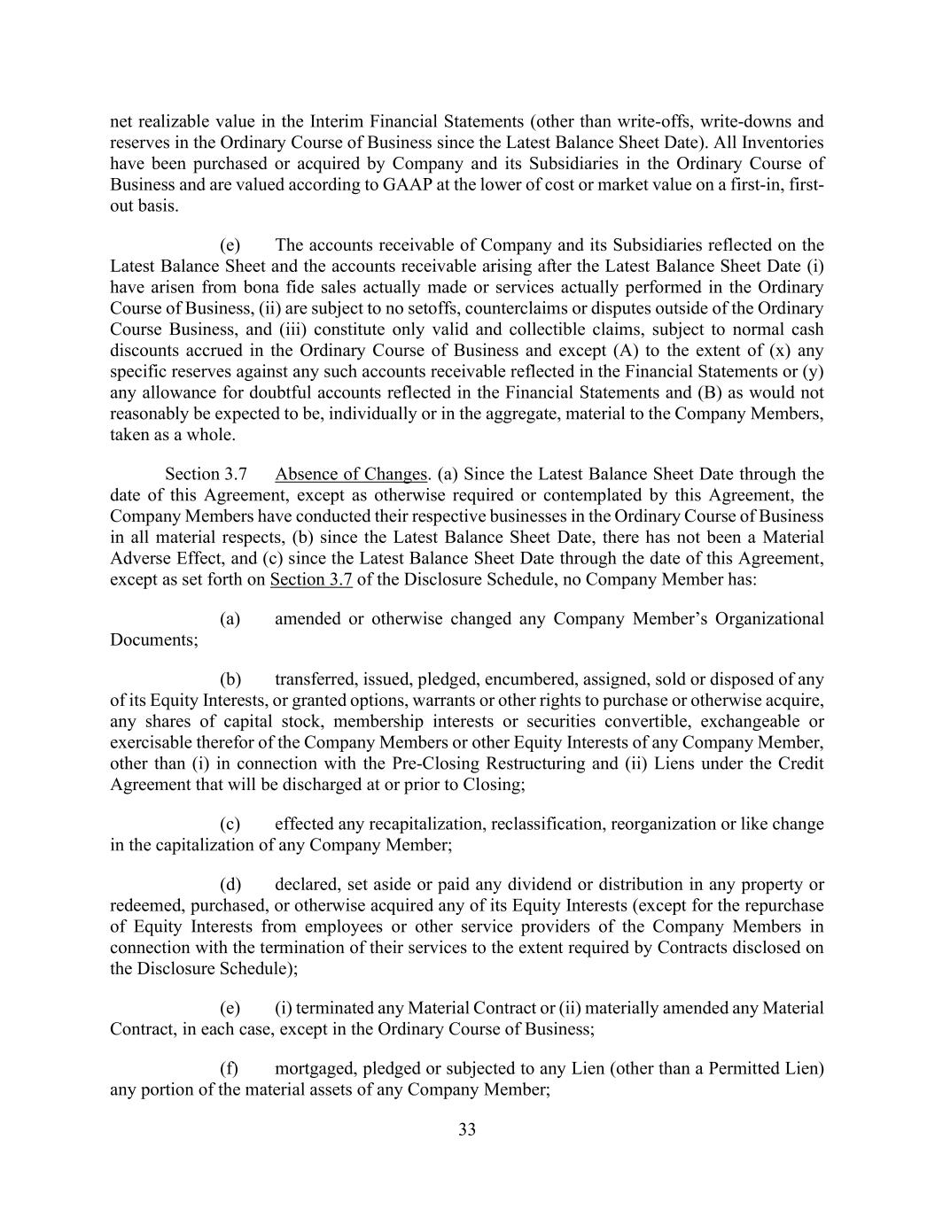 33 net realizable value in the Interim Financial Statements (other than write-offs, write-downs and reserves in the Ordinary Course of Business since the Latest Balance Sheet Date). All Inventories have been purchased or acquired by Company and its Subsidiaries in the Ordinary Course of Business and are valued according to GAAP at the lower of cost or market value on a first-in, first- out basis. (e) The accounts receivable of Company and its Subsidiaries reflected on the Latest Balance Sheet and the accounts receivable arising after the Latest Balance Sheet Date (i) have arisen from bona fide sales actually made or services actually performed in the Ordinary Course of Business, (ii) are subject to no setoffs, counterclaims or disputes outside of the Ordinary Course Business, and (iii) constitute only valid and collectible claims, subject to normal cash discounts accrued in the Ordinary Course of Business and except (A) to the extent of (x) any specific reserves against any such accounts receivable reflected in the Financial Statements or (y) any allowance for doubtful accounts reflected in the Financial Statements and (B) as would not reasonably be expected to be, individually or in the aggregate, material to the Company Members, taken as a whole. Section 3.7 Absence of Changes. (a) Since the Latest Balance Sheet Date through the date of this Agreement, except as otherwise required or contemplated by this Agreement, the Company Members have conducted their respective businesses in the Ordinary Course of Business in all material respects, (b) since the Latest Balance Sheet Date, there has not been a Material Adverse Effect, and (c) since the Latest Balance Sheet Date through the date of this Agreement, except as set forth on Section 3.7 of the Disclosure Schedule, no Company Member has: (a) amended or otherwise changed any Company Member’s Organizational Documents; (b) transferred, issued, pledged, encumbered, assigned, sold or disposed of any of its Equity Interests, or granted options, warrants or other rights to purchase or otherwise acquire, any shares of capital stock, membership interests or securities convertible, exchangeable or exercisable therefor of the Company Members or other Equity Interests of any Company Member, other than (i) in connection with the Pre-Closing Restructuring and (ii) Liens under the Credit Agreement that will be discharged at or prior to Closing; (c) effected any recapitalization, reclassification, reorganization or like change in the capitalization of any Company Member; (d) declared, set aside or paid any dividend or distribution in any property or redeemed, purchased, or otherwise acquired any of its Equity Interests (except for the repurchase of Equity Interests from employees or other service providers of the Company Members in connection with the termination of their services to the extent required by Contracts disclosed on the Disclosure Schedule); (e) (i) terminated any Material Contract or (ii) materially amended any Material Contract, in each case, except in the Ordinary Course of Business; (f) mortgaged, pledged or subjected to any Lien (other than a Permitted Lien) any portion of the material assets of any Company Member;