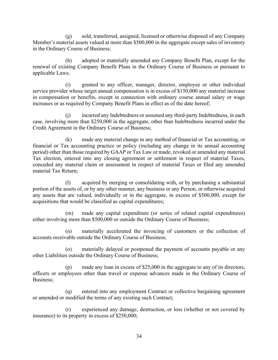 34 (g) sold, transferred, assigned, licensed or otherwise disposed of any Company Member’s material assets valued at more than $500,000 in the aggregate except sales of inventory in the Ordinary Course of Business; (h) adopted or materially amended any Company Benefit Plan, except for the renewal of existing Company Benefit Plans in the Ordinary Course of Business or pursuant to applicable Laws; (i) granted to any officer, manager, director, employee or other individual service provider whose target annual compensation is in excess of $150,000 any material increase in compensation or benefits, except in connection with ordinary course annual salary or wage increases or as required by Company Benefit Plans in effect as of the date hereof; (j) incurred any Indebtedness or assumed any third-party Indebtedness, in each case, involving more than $250,000 in the aggregate, other than Indebtedness incurred under the Credit Agreement in the Ordinary Course of Business; (k) made any material change in any method of financial or Tax accounting, or financial or Tax accounting practice or policy (including any change in its annual accounting period) other than those required by GAAP or Tax Law or made, revoked or amended any material Tax election, entered into any closing agreement or settlement in respect of material Taxes, conceded any material claim or assessment in respect of material Taxes or filed any amended material Tax Return; (l) acquired by merging or consolidating with, or by purchasing a substantial portion of the assets of, or by any other manner, any business or any Person, or otherwise acquired any assets that are valued, individually or in the aggregate, in excess of $500,000, except for acquisitions that would be classified as capital expenditures; (m) made any capital expenditure (or series of related capital expenditures) either involving more than $500,000 or outside the Ordinary Course of Business; (n) materially accelerated the invoicing of customers or the collection of accounts receivable outside the Ordinary Course of Business; (o) materially delayed or postponed the payment of accounts payable or any other Liabilities outside the Ordinary Course of Business; (p) made any loan in excess of $25,000 in the aggregate to any of its directors, officers or employees other than travel or expense advances made in the Ordinary Course of Business; (q) entered into any employment Contract or collective bargaining agreement or amended or modified the terms of any existing such Contract; (r) experienced any damage, destruction, or loss (whether or not covered by insurance) to its property in excess of $250,000;
