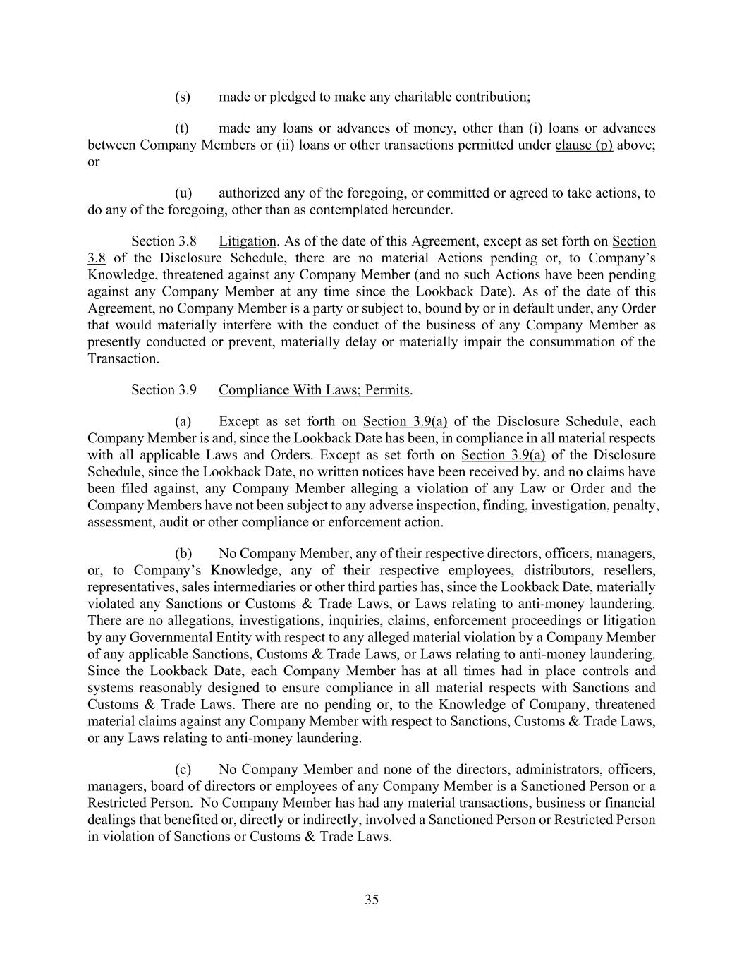 35 (s) made or pledged to make any charitable contribution; (t) made any loans or advances of money, other than (i) loans or advances between Company Members or (ii) loans or other transactions permitted under clause (p) above; or (u) authorized any of the foregoing, or committed or agreed to take actions, to do any of the foregoing, other than as contemplated hereunder. Section 3.8 Litigation. As of the date of this Agreement, except as set forth on Section 3.8 of the Disclosure Schedule, there are no material Actions pending or, to Company’s Knowledge, threatened against any Company Member (and no such Actions have been pending against any Company Member at any time since the Lookback Date). As of the date of this Agreement, no Company Member is a party or subject to, bound by or in default under, any Order that would materially interfere with the conduct of the business of any Company Member as presently conducted or prevent, materially delay or materially impair the consummation of the Transaction. Section 3.9 Compliance With Laws; Permits. (a) Except as set forth on Section 3.9(a) of the Disclosure Schedule, each Company Member is and, since the Lookback Date has been, in compliance in all material respects with all applicable Laws and Orders. Except as set forth on Section 3.9(a) of the Disclosure Schedule, since the Lookback Date, no written notices have been received by, and no claims have been filed against, any Company Member alleging a violation of any Law or Order and the Company Members have not been subject to any adverse inspection, finding, investigation, penalty, assessment, audit or other compliance or enforcement action. (b) No Company Member, any of their respective directors, officers, managers, or, to Company’s Knowledge, any of their respective employees, distributors, resellers, representatives, sales intermediaries or other third parties has, since the Lookback Date, materially violated any Sanctions or Customs & Trade Laws, or Laws relating to anti-money laundering. There are no allegations, investigations, inquiries, claims, enforcement proceedings or litigation by any Governmental Entity with respect to any alleged material violation by a Company Member of any applicable Sanctions, Customs & Trade Laws, or Laws relating to anti-money laundering. Since the Lookback Date, each Company Member has at all times had in place controls and systems reasonably designed to ensure compliance in all material respects with Sanctions and Customs & Trade Laws. There are no pending or, to the Knowledge of Company, threatened material claims against any Company Member with respect to Sanctions, Customs & Trade Laws, or any Laws relating to anti-money laundering. (c) No Company Member and none of the directors, administrators, officers, managers, board of directors or employees of any Company Member is a Sanctioned Person or a Restricted Person. No Company Member has had any material transactions, business or financial dealings that benefited or, directly or indirectly, involved a Sanctioned Person or Restricted Person in violation of Sanctions or Customs & Trade Laws.