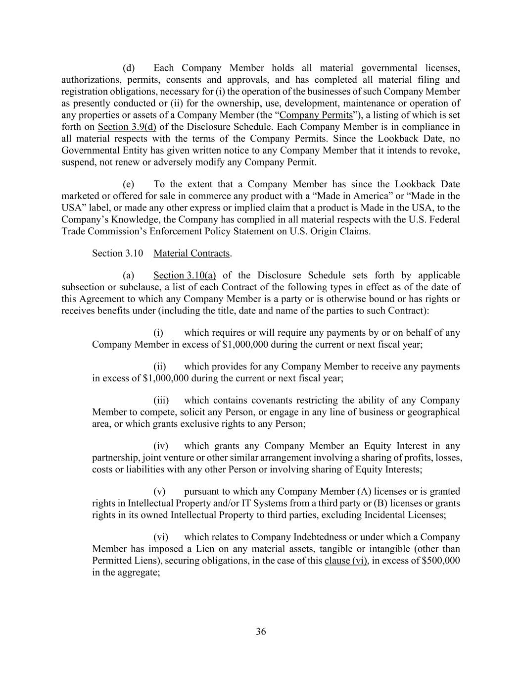 36 (d) Each Company Member holds all material governmental licenses, authorizations, permits, consents and approvals, and has completed all material filing and registration obligations, necessary for (i) the operation of the businesses of such Company Member as presently conducted or (ii) for the ownership, use, development, maintenance or operation of any properties or assets of a Company Member (the “Company Permits”), a listing of which is set forth on Section 3.9(d) of the Disclosure Schedule. Each Company Member is in compliance in all material respects with the terms of the Company Permits. Since the Lookback Date, no Governmental Entity has given written notice to any Company Member that it intends to revoke, suspend, not renew or adversely modify any Company Permit. (e) To the extent that a Company Member has since the Lookback Date marketed or offered for sale in commerce any product with a “Made in America” or “Made in the USA” label, or made any other express or implied claim that a product is Made in the USA, to the Company’s Knowledge, the Company has complied in all material respects with the U.S. Federal Trade Commission’s Enforcement Policy Statement on U.S. Origin Claims. Section 3.10 Material Contracts. (a) Section 3.10(a) of the Disclosure Schedule sets forth by applicable subsection or subclause, a list of each Contract of the following types in effect as of the date of this Agreement to which any Company Member is a party or is otherwise bound or has rights or receives benefits under (including the title, date and name of the parties to such Contract): (i) which requires or will require any payments by or on behalf of any Company Member in excess of $1,000,000 during the current or next fiscal year; (ii) which provides for any Company Member to receive any payments in excess of $1,000,000 during the current or next fiscal year; (iii) which contains covenants restricting the ability of any Company Member to compete, solicit any Person, or engage in any line of business or geographical area, or which grants exclusive rights to any Person; (iv) which grants any Company Member an Equity Interest in any partnership, joint venture or other similar arrangement involving a sharing of profits, losses, costs or liabilities with any other Person or involving sharing of Equity Interests; (v) pursuant to which any Company Member (A) licenses or is granted rights in Intellectual Property and/or IT Systems from a third party or (B) licenses or grants rights in its owned Intellectual Property to third parties, excluding Incidental Licenses; (vi) which relates to Company Indebtedness or under which a Company Member has imposed a Lien on any material assets, tangible or intangible (other than Permitted Liens), securing obligations, in the case of this clause (vi), in excess of $500,000 in the aggregate;