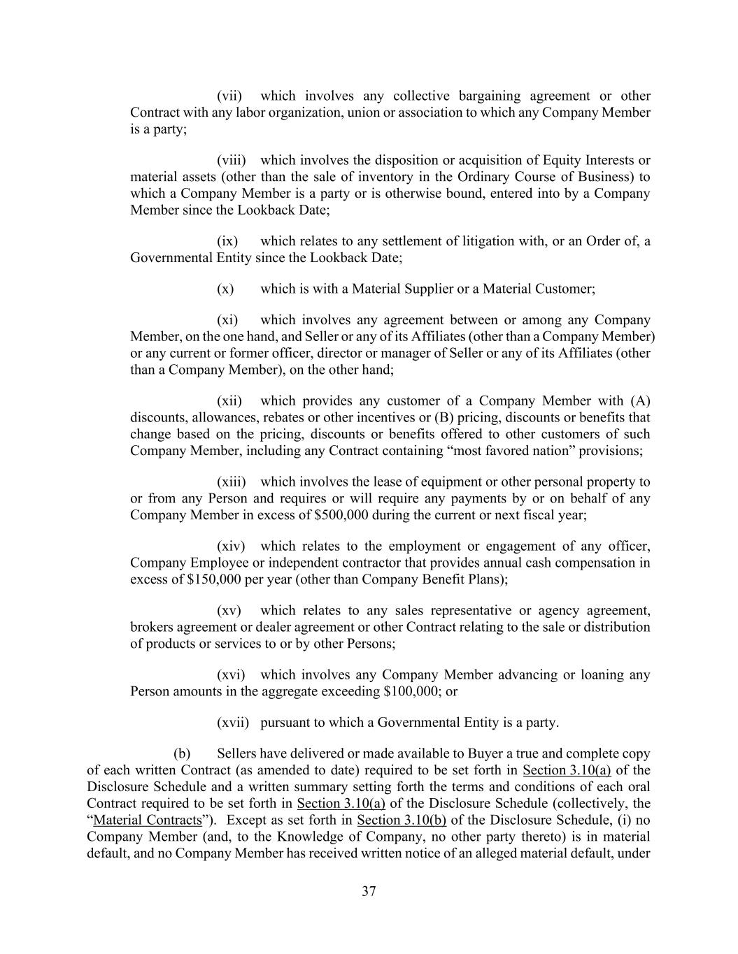 37 (vii) which involves any collective bargaining agreement or other Contract with any labor organization, union or association to which any Company Member is a party; (viii) which involves the disposition or acquisition of Equity Interests or material assets (other than the sale of inventory in the Ordinary Course of Business) to which a Company Member is a party or is otherwise bound, entered into by a Company Member since the Lookback Date; (ix) which relates to any settlement of litigation with, or an Order of, a Governmental Entity since the Lookback Date; (x) which is with a Material Supplier or a Material Customer; (xi) which involves any agreement between or among any Company Member, on the one hand, and Seller or any of its Affiliates (other than a Company Member) or any current or former officer, director or manager of Seller or any of its Affiliates (other than a Company Member), on the other hand; (xii) which provides any customer of a Company Member with (A) discounts, allowances, rebates or other incentives or (B) pricing, discounts or benefits that change based on the pricing, discounts or benefits offered to other customers of such Company Member, including any Contract containing “most favored nation” provisions; (xiii) which involves the lease of equipment or other personal property to or from any Person and requires or will require any payments by or on behalf of any Company Member in excess of $500,000 during the current or next fiscal year; (xiv) which relates to the employment or engagement of any officer, Company Employee or independent contractor that provides annual cash compensation in excess of $150,000 per year (other than Company Benefit Plans); (xv) which relates to any sales representative or agency agreement, brokers agreement or dealer agreement or other Contract relating to the sale or distribution of products or services to or by other Persons; (xvi) which involves any Company Member advancing or loaning any Person amounts in the aggregate exceeding $100,000; or (xvii) pursuant to which a Governmental Entity is a party. (b) Sellers have delivered or made available to Buyer a true and complete copy of each written Contract (as amended to date) required to be set forth in Section 3.10(a) of the Disclosure Schedule and a written summary setting forth the terms and conditions of each oral Contract required to be set forth in Section 3.10(a) of the Disclosure Schedule (collectively, the “Material Contracts”). Except as set forth in Section 3.10(b) of the Disclosure Schedule, (i) no Company Member (and, to the Knowledge of Company, no other party thereto) is in material default, and no Company Member has received written notice of an alleged material default, under