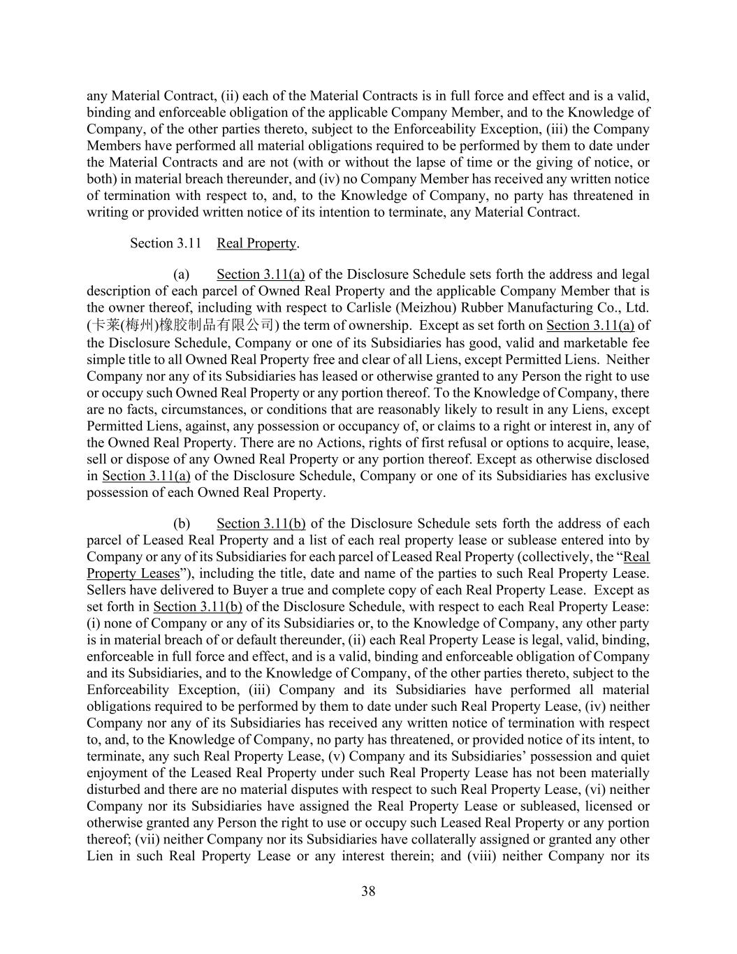 38 any Material Contract, (ii) each of the Material Contracts is in full force and effect and is a valid, binding and enforceable obligation of the applicable Company Member, and to the Knowledge of Company, of the other parties thereto, subject to the Enforceability Exception, (iii) the Company Members have performed all material obligations required to be performed by them to date under the Material Contracts and are not (with or without the lapse of time or the giving of notice, or both) in material breach thereunder, and (iv) no Company Member has received any written notice of termination with respect to, and, to the Knowledge of Company, no party has threatened in writing or provided written notice of its intention to terminate, any Material Contract. Section 3.11 Real Property. (a) Section 3.11(a) of the Disclosure Schedule sets forth the address and legal description of each parcel of Owned Real Property and the applicable Company Member that is the owner thereof, including with respect to Carlisle (Meizhou) Rubber Manufacturing Co., Ltd. (卡莱(梅州)橡胶制品有限公司) the term of ownership. Except as set forth on Section 3.11(a) of the Disclosure Schedule, Company or one of its Subsidiaries has good, valid and marketable fee simple title to all Owned Real Property free and clear of all Liens, except Permitted Liens. Neither Company nor any of its Subsidiaries has leased or otherwise granted to any Person the right to use or occupy such Owned Real Property or any portion thereof. To the Knowledge of Company, there are no facts, circumstances, or conditions that are reasonably likely to result in any Liens, except Permitted Liens, against, any possession or occupancy of, or claims to a right or interest in, any of the Owned Real Property. There are no Actions, rights of first refusal or options to acquire, lease, sell or dispose of any Owned Real Property or any portion thereof. Except as otherwise disclosed in Section 3.11(a) of the Disclosure Schedule, Company or one of its Subsidiaries has exclusive possession of each Owned Real Property. (b) Section 3.11(b) of the Disclosure Schedule sets forth the address of each parcel of Leased Real Property and a list of each real property lease or sublease entered into by Company or any of its Subsidiaries for each parcel of Leased Real Property (collectively, the “Real Property Leases”), including the title, date and name of the parties to such Real Property Lease. Sellers have delivered to Buyer a true and complete copy of each Real Property Lease. Except as set forth in Section 3.11(b) of the Disclosure Schedule, with respect to each Real Property Lease: (i) none of Company or any of its Subsidiaries or, to the Knowledge of Company, any other party is in material breach of or default thereunder, (ii) each Real Property Lease is legal, valid, binding, enforceable in full force and effect, and is a valid, binding and enforceable obligation of Company and its Subsidiaries, and to the Knowledge of Company, of the other parties thereto, subject to the Enforceability Exception, (iii) Company and its Subsidiaries have performed all material obligations required to be performed by them to date under such Real Property Lease, (iv) neither Company nor any of its Subsidiaries has received any written notice of termination with respect to, and, to the Knowledge of Company, no party has threatened, or provided notice of its intent, to terminate, any such Real Property Lease, (v) Company and its Subsidiaries’ possession and quiet enjoyment of the Leased Real Property under such Real Property Lease has not been materially disturbed and there are no material disputes with respect to such Real Property Lease, (vi) neither Company nor its Subsidiaries have assigned the Real Property Lease or subleased, licensed or otherwise granted any Person the right to use or occupy such Leased Real Property or any portion thereof; (vii) neither Company nor its Subsidiaries have collaterally assigned or granted any other Lien in such Real Property Lease or any interest therein; and (viii) neither Company nor its