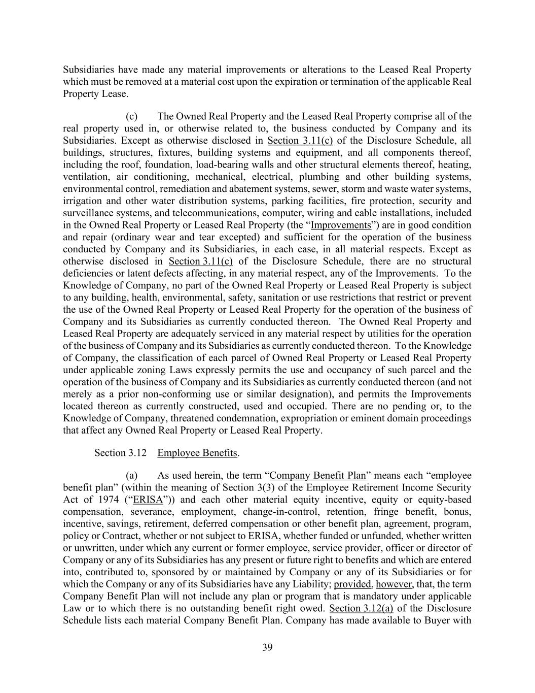 39 Subsidiaries have made any material improvements or alterations to the Leased Real Property which must be removed at a material cost upon the expiration or termination of the applicable Real Property Lease. (c) The Owned Real Property and the Leased Real Property comprise all of the real property used in, or otherwise related to, the business conducted by Company and its Subsidiaries. Except as otherwise disclosed in Section 3.11(c) of the Disclosure Schedule, all buildings, structures, fixtures, building systems and equipment, and all components thereof, including the roof, foundation, load-bearing walls and other structural elements thereof, heating, ventilation, air conditioning, mechanical, electrical, plumbing and other building systems, environmental control, remediation and abatement systems, sewer, storm and waste water systems, irrigation and other water distribution systems, parking facilities, fire protection, security and surveillance systems, and telecommunications, computer, wiring and cable installations, included in the Owned Real Property or Leased Real Property (the “Improvements”) are in good condition and repair (ordinary wear and tear excepted) and sufficient for the operation of the business conducted by Company and its Subsidiaries, in each case, in all material respects. Except as otherwise disclosed in Section 3.11(c) of the Disclosure Schedule, there are no structural deficiencies or latent defects affecting, in any material respect, any of the Improvements. To the Knowledge of Company, no part of the Owned Real Property or Leased Real Property is subject to any building, health, environmental, safety, sanitation or use restrictions that restrict or prevent the use of the Owned Real Property or Leased Real Property for the operation of the business of Company and its Subsidiaries as currently conducted thereon. The Owned Real Property and Leased Real Property are adequately serviced in any material respect by utilities for the operation of the business of Company and its Subsidiaries as currently conducted thereon. To the Knowledge of Company, the classification of each parcel of Owned Real Property or Leased Real Property under applicable zoning Laws expressly permits the use and occupancy of such parcel and the operation of the business of Company and its Subsidiaries as currently conducted thereon (and not merely as a prior non-conforming use or similar designation), and permits the Improvements located thereon as currently constructed, used and occupied. There are no pending or, to the Knowledge of Company, threatened condemnation, expropriation or eminent domain proceedings that affect any Owned Real Property or Leased Real Property. Section 3.12 Employee Benefits. (a) As used herein, the term “Company Benefit Plan” means each “employee benefit plan” (within the meaning of Section 3(3) of the Employee Retirement Income Security Act of 1974 (“ERISA”)) and each other material equity incentive, equity or equity-based compensation, severance, employment, change-in-control, retention, fringe benefit, bonus, incentive, savings, retirement, deferred compensation or other benefit plan, agreement, program, policy or Contract, whether or not subject to ERISA, whether funded or unfunded, whether written or unwritten, under which any current or former employee, service provider, officer or director of Company or any of its Subsidiaries has any present or future right to benefits and which are entered into, contributed to, sponsored by or maintained by Company or any of its Subsidiaries or for which the Company or any of its Subsidiaries have any Liability; provided, however, that, the term Company Benefit Plan will not include any plan or program that is mandatory under applicable Law or to which there is no outstanding benefit right owed. Section 3.12(a) of the Disclosure Schedule lists each material Company Benefit Plan. Company has made available to Buyer with