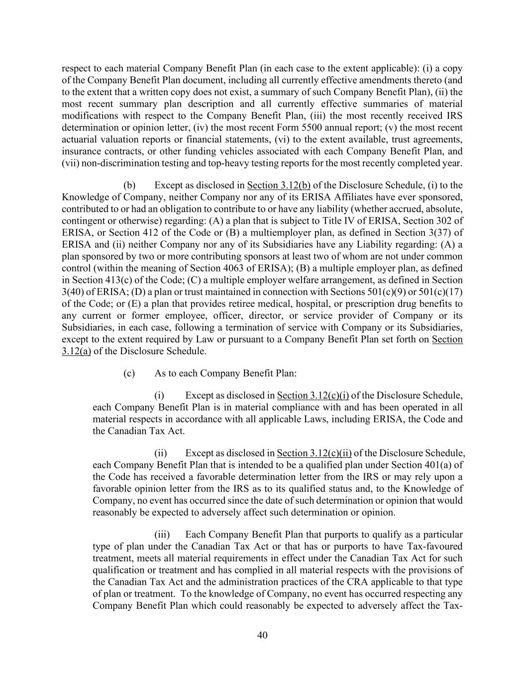 40 respect to each material Company Benefit Plan (in each case to the extent applicable): (i) a copy of the Company Benefit Plan document, including all currently effective amendments thereto (and to the extent that a written copy does not exist, a summary of such Company Benefit Plan), (ii) the most recent summary plan description and all currently effective summaries of material modifications with respect to the Company Benefit Plan, (iii) the most recently received IRS determination or opinion letter, (iv) the most recent Form 5500 annual report; (v) the most recent actuarial valuation reports or financial statements, (vi) to the extent available, trust agreements, insurance contracts, or other funding vehicles associated with each Company Benefit Plan, and (vii) non-discrimination testing and top-heavy testing reports for the most recently completed year. (b) Except as disclosed in Section 3.12(b) of the Disclosure Schedule, (i) to the Knowledge of Company, neither Company nor any of its ERISA Affiliates have ever sponsored, contributed to or had an obligation to contribute to or have any liability (whether accrued, absolute, contingent or otherwise) regarding: (A) a plan that is subject to Title IV of ERISA, Section 302 of ERISA, or Section 412 of the Code or (B) a multiemployer plan, as defined in Section 3(37) of ERISA and (ii) neither Company nor any of its Subsidiaries have any Liability regarding: (A) a plan sponsored by two or more contributing sponsors at least two of whom are not under common control (within the meaning of Section 4063 of ERISA); (B) a multiple employer plan, as defined in Section 413(c) of the Code; (C) a multiple employer welfare arrangement, as defined in Section 3(40) of ERISA; (D) a plan or trust maintained in connection with Sections 501(c)(9) or 501(c)(17) of the Code; or (E) a plan that provides retiree medical, hospital, or prescription drug benefits to any current or former employee, officer, director, or service provider of Company or its Subsidiaries, in each case, following a termination of service with Company or its Subsidiaries, except to the extent required by Law or pursuant to a Company Benefit Plan set forth on Section 3.12(a) of the Disclosure Schedule. (c) As to each Company Benefit Plan: (i) Except as disclosed in Section 3.12(c)(i) of the Disclosure Schedule, each Company Benefit Plan is in material compliance with and has been operated in all material respects in accordance with all applicable Laws, including ERISA, the Code and the Canadian Tax Act. (ii) Except as disclosed in Section 3.12(c)(ii) of the Disclosure Schedule, each Company Benefit Plan that is intended to be a qualified plan under Section 401(a) of the Code has received a favorable determination letter from the IRS or may rely upon a favorable opinion letter from the IRS as to its qualified status and, to the Knowledge of Company, no event has occurred since the date of such determination or opinion that would reasonably be expected to adversely affect such determination or opinion. (iii) Each Company Benefit Plan that purports to qualify as a particular type of plan under the Canadian Tax Act or that has or purports to have Tax-favoured treatment, meets all material requirements in effect under the Canadian Tax Act for such qualification or treatment and has complied in all material respects with the provisions of the Canadian Tax Act and the administration practices of the CRA applicable to that type of plan or treatment. To the knowledge of Company, no event has occurred respecting any Company Benefit Plan which could reasonably be expected to adversely affect the Tax-