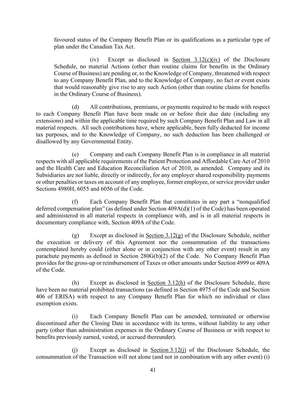 41 favoured status of the Company Benefit Plan or its qualifications as a particular type of plan under the Canadian Tax Act. (iv) Except as disclosed in Section 3.12(c)(iv) of the Disclosure Schedule, no material Actions (other than routine claims for benefits in the Ordinary Course of Business) are pending or, to the Knowledge of Company, threatened with respect to any Company Benefit Plan, and to the Knowledge of Company, no fact or event exists that would reasonably give rise to any such Action (other than routine claims for benefits in the Ordinary Course of Business). (d) All contributions, premiums, or payments required to be made with respect to each Company Benefit Plan have been made on or before their due date (including any extensions) and within the applicable time required by such Company Benefit Plan and Law in all material respects. All such contributions have, where applicable, been fully deducted for income tax purposes, and to the Knowledge of Company, no such deduction has been challenged or disallowed by any Governmental Entity. (e) Company and each Company Benefit Plan is in compliance in all material respects with all applicable requirements of the Patient Protection and Affordable Care Act of 2010 and the Health Care and Education Reconciliation Act of 2010, as amended. Company and its Subsidiaries are not liable, directly or indirectly, for any employer shared responsibility payments or other penalties or taxes on account of any employee, former employee, or service provider under Sections 4980H, 6055 and 6056 of the Code. (f) Each Company Benefit Plan that constitutes in any part a “nonqualified deferred compensation plan” (as defined under Section 409A(d)(1) of the Code) has been operated and administered in all material respects in compliance with, and is in all material respects in documentary compliance with, Section 409A of the Code. (g) Except as disclosed in Section 3.12(g) of the Disclosure Schedule, neither the execution or delivery of this Agreement nor the consummation of the transactions contemplated hereby could (either alone or in conjunction with any other event) result in any parachute payments as defined in Section 280G(b)(2) of the Code. No Company Benefit Plan provides for the gross-up or reimbursement of Taxes or other amounts under Section 4999 or 409A of the Code. (h) Except as disclosed in Section 3.12(h) of the Disclosure Schedule, there have been no material prohibited transactions (as defined in Section 4975 of the Code and Section 406 of ERISA) with respect to any Company Benefit Plan for which no individual or class exemption exists. (i) Each Company Benefit Plan can be amended, terminated or otherwise discontinued after the Closing Date in accordance with its terms, without liability to any other party (other than administration expenses in the Ordinary Course of Business or with respect to benefits previously earned, vested, or accrued thereunder). (j) Except as disclosed in Section 3.12(j) of the Disclosure Schedule, the consummation of the Transaction will not alone (and not in combination with any other event) (i)