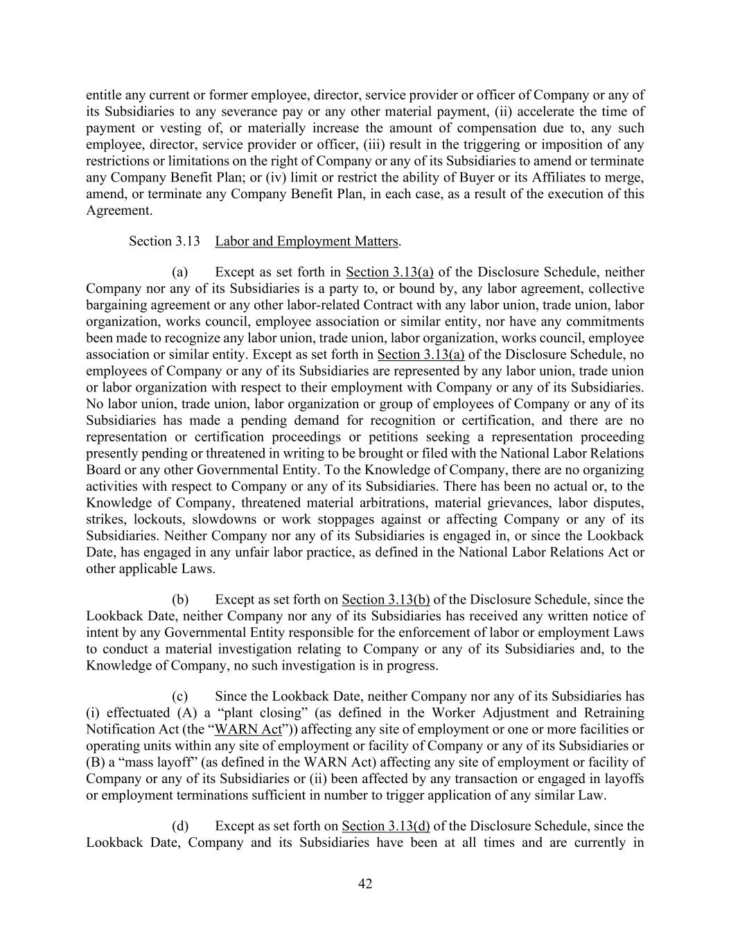 42 entitle any current or former employee, director, service provider or officer of Company or any of its Subsidiaries to any severance pay or any other material payment, (ii) accelerate the time of payment or vesting of, or materially increase the amount of compensation due to, any such employee, director, service provider or officer, (iii) result in the triggering or imposition of any restrictions or limitations on the right of Company or any of its Subsidiaries to amend or terminate any Company Benefit Plan; or (iv) limit or restrict the ability of Buyer or its Affiliates to merge, amend, or terminate any Company Benefit Plan, in each case, as a result of the execution of this Agreement. Section 3.13 Labor and Employment Matters. (a) Except as set forth in Section 3.13(a) of the Disclosure Schedule, neither Company nor any of its Subsidiaries is a party to, or bound by, any labor agreement, collective bargaining agreement or any other labor-related Contract with any labor union, trade union, labor organization, works council, employee association or similar entity, nor have any commitments been made to recognize any labor union, trade union, labor organization, works council, employee association or similar entity. Except as set forth in Section 3.13(a) of the Disclosure Schedule, no employees of Company or any of its Subsidiaries are represented by any labor union, trade union or labor organization with respect to their employment with Company or any of its Subsidiaries. No labor union, trade union, labor organization or group of employees of Company or any of its Subsidiaries has made a pending demand for recognition or certification, and there are no representation or certification proceedings or petitions seeking a representation proceeding presently pending or threatened in writing to be brought or filed with the National Labor Relations Board or any other Governmental Entity. To the Knowledge of Company, there are no organizing activities with respect to Company or any of its Subsidiaries. There has been no actual or, to the Knowledge of Company, threatened material arbitrations, material grievances, labor disputes, strikes, lockouts, slowdowns or work stoppages against or affecting Company or any of its Subsidiaries. Neither Company nor any of its Subsidiaries is engaged in, or since the Lookback Date, has engaged in any unfair labor practice, as defined in the National Labor Relations Act or other applicable Laws. (b) Except as set forth on Section 3.13(b) of the Disclosure Schedule, since the Lookback Date, neither Company nor any of its Subsidiaries has received any written notice of intent by any Governmental Entity responsible for the enforcement of labor or employment Laws to conduct a material investigation relating to Company or any of its Subsidiaries and, to the Knowledge of Company, no such investigation is in progress. (c) Since the Lookback Date, neither Company nor any of its Subsidiaries has (i) effectuated (A) a “plant closing” (as defined in the Worker Adjustment and Retraining Notification Act (the “WARN Act”)) affecting any site of employment or one or more facilities or operating units within any site of employment or facility of Company or any of its Subsidiaries or (B) a “mass layoff” (as defined in the WARN Act) affecting any site of employment or facility of Company or any of its Subsidiaries or (ii) been affected by any transaction or engaged in layoffs or employment terminations sufficient in number to trigger application of any similar Law. (d) Except as set forth on Section 3.13(d) of the Disclosure Schedule, since the Lookback Date, Company and its Subsidiaries have been at all times and are currently in