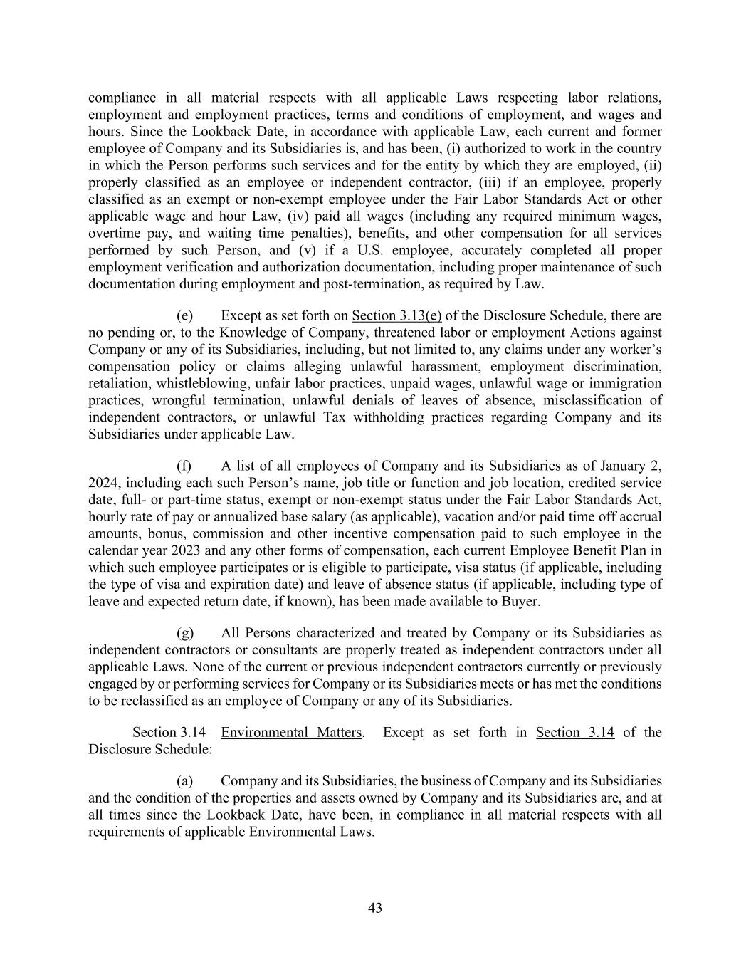 43 compliance in all material respects with all applicable Laws respecting labor relations, employment and employment practices, terms and conditions of employment, and wages and hours. Since the Lookback Date, in accordance with applicable Law, each current and former employee of Company and its Subsidiaries is, and has been, (i) authorized to work in the country in which the Person performs such services and for the entity by which they are employed, (ii) properly classified as an employee or independent contractor, (iii) if an employee, properly classified as an exempt or non-exempt employee under the Fair Labor Standards Act or other applicable wage and hour Law, (iv) paid all wages (including any required minimum wages, overtime pay, and waiting time penalties), benefits, and other compensation for all services performed by such Person, and (v) if a U.S. employee, accurately completed all proper employment verification and authorization documentation, including proper maintenance of such documentation during employment and post-termination, as required by Law. (e) Except as set forth on Section 3.13(e) of the Disclosure Schedule, there are no pending or, to the Knowledge of Company, threatened labor or employment Actions against Company or any of its Subsidiaries, including, but not limited to, any claims under any worker’s compensation policy or claims alleging unlawful harassment, employment discrimination, retaliation, whistleblowing, unfair labor practices, unpaid wages, unlawful wage or immigration practices, wrongful termination, unlawful denials of leaves of absence, misclassification of independent contractors, or unlawful Tax withholding practices regarding Company and its Subsidiaries under applicable Law. (f) A list of all employees of Company and its Subsidiaries as of January 2, 2024, including each such Person’s name, job title or function and job location, credited service date, full- or part-time status, exempt or non-exempt status under the Fair Labor Standards Act, hourly rate of pay or annualized base salary (as applicable), vacation and/or paid time off accrual amounts, bonus, commission and other incentive compensation paid to such employee in the calendar year 2023 and any other forms of compensation, each current Employee Benefit Plan in which such employee participates or is eligible to participate, visa status (if applicable, including the type of visa and expiration date) and leave of absence status (if applicable, including type of leave and expected return date, if known), has been made available to Buyer. (g) All Persons characterized and treated by Company or its Subsidiaries as independent contractors or consultants are properly treated as independent contractors under all applicable Laws. None of the current or previous independent contractors currently or previously engaged by or performing services for Company or its Subsidiaries meets or has met the conditions to be reclassified as an employee of Company or any of its Subsidiaries. Section 3.14 Environmental Matters. Except as set forth in Section 3.14 of the Disclosure Schedule: (a) Company and its Subsidiaries, the business of Company and its Subsidiaries and the condition of the properties and assets owned by Company and its Subsidiaries are, and at all times since the Lookback Date, have been, in compliance in all material respects with all requirements of applicable Environmental Laws.
