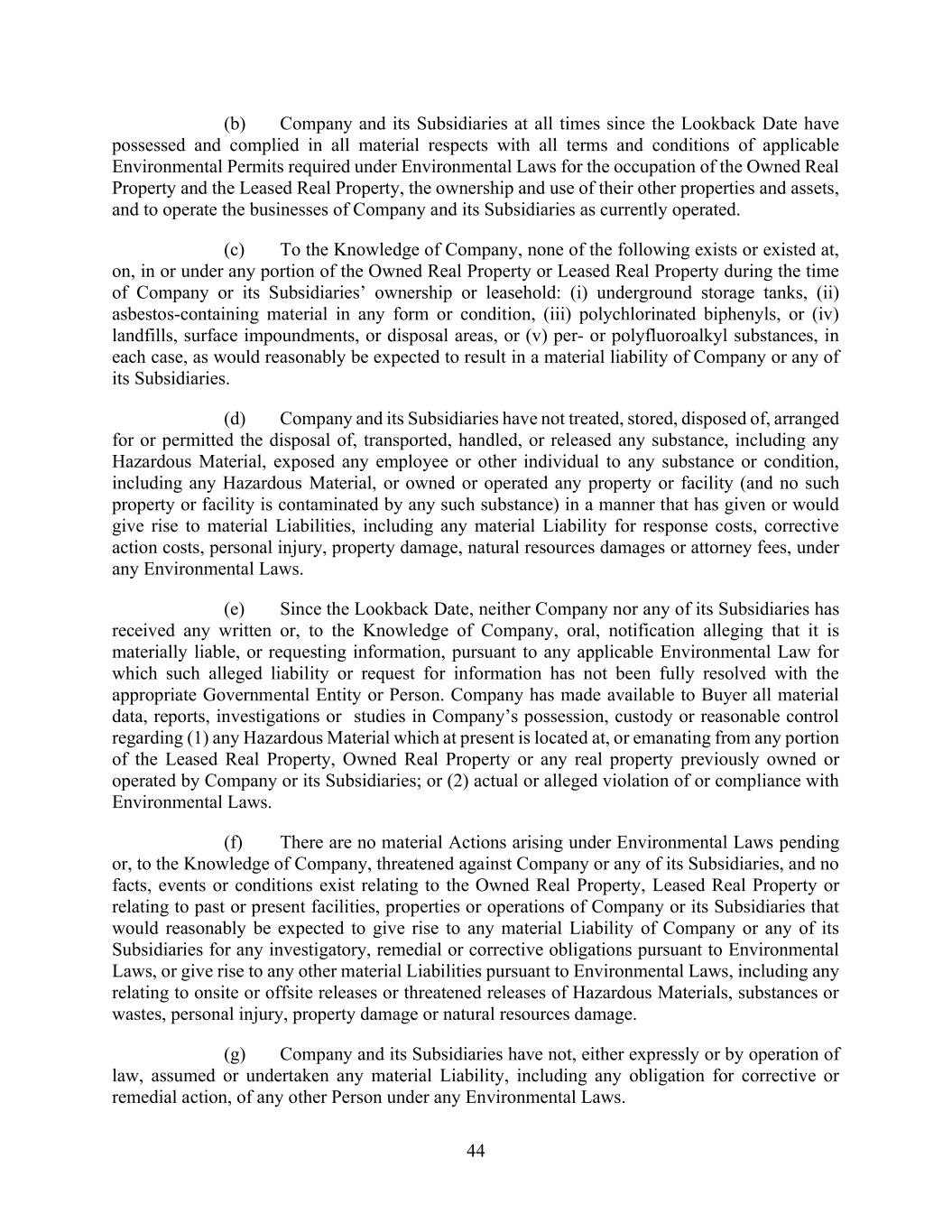 44 (b) Company and its Subsidiaries at all times since the Lookback Date have possessed and complied in all material respects with all terms and conditions of applicable Environmental Permits required under Environmental Laws for the occupation of the Owned Real Property and the Leased Real Property, the ownership and use of their other properties and assets, and to operate the businesses of Company and its Subsidiaries as currently operated. (c) To the Knowledge of Company, none of the following exists or existed at, on, in or under any portion of the Owned Real Property or Leased Real Property during the time of Company or its Subsidiaries’ ownership or leasehold: (i) underground storage tanks, (ii) asbestos-containing material in any form or condition, (iii) polychlorinated biphenyls, or (iv) landfills, surface impoundments, or disposal areas, or (v) per- or polyfluoroalkyl substances, in each case, as would reasonably be expected to result in a material liability of Company or any of its Subsidiaries. (d) Company and its Subsidiaries have not treated, stored, disposed of, arranged for or permitted the disposal of, transported, handled, or released any substance, including any Hazardous Material, exposed any employee or other individual to any substance or condition, including any Hazardous Material, or owned or operated any property or facility (and no such property or facility is contaminated by any such substance) in a manner that has given or would give rise to material Liabilities, including any material Liability for response costs, corrective action costs, personal injury, property damage, natural resources damages or attorney fees, under any Environmental Laws. (e) Since the Lookback Date, neither Company nor any of its Subsidiaries has received any written or, to the Knowledge of Company, oral, notification alleging that it is materially liable, or requesting information, pursuant to any applicable Environmental Law for which such alleged liability or request for information has not been fully resolved with the appropriate Governmental Entity or Person. Company has made available to Buyer all material data, reports, investigations or studies in Company’s possession, custody or reasonable control regarding (1) any Hazardous Material which at present is located at, or emanating from any portion of the Leased Real Property, Owned Real Property or any real property previously owned or operated by Company or its Subsidiaries; or (2) actual or alleged violation of or compliance with Environmental Laws. (f) There are no material Actions arising under Environmental Laws pending or, to the Knowledge of Company, threatened against Company or any of its Subsidiaries, and no facts, events or conditions exist relating to the Owned Real Property, Leased Real Property or relating to past or present facilities, properties or operations of Company or its Subsidiaries that would reasonably be expected to give rise to any material Liability of Company or any of its Subsidiaries for any investigatory, remedial or corrective obligations pursuant to Environmental Laws, or give rise to any other material Liabilities pursuant to Environmental Laws, including any relating to onsite or offsite releases or threatened releases of Hazardous Materials, substances or wastes, personal injury, property damage or natural resources damage. (g) Company and its Subsidiaries have not, either expressly or by operation of law, assumed or undertaken any material Liability, including any obligation for corrective or remedial action, of any other Person under any Environmental Laws.