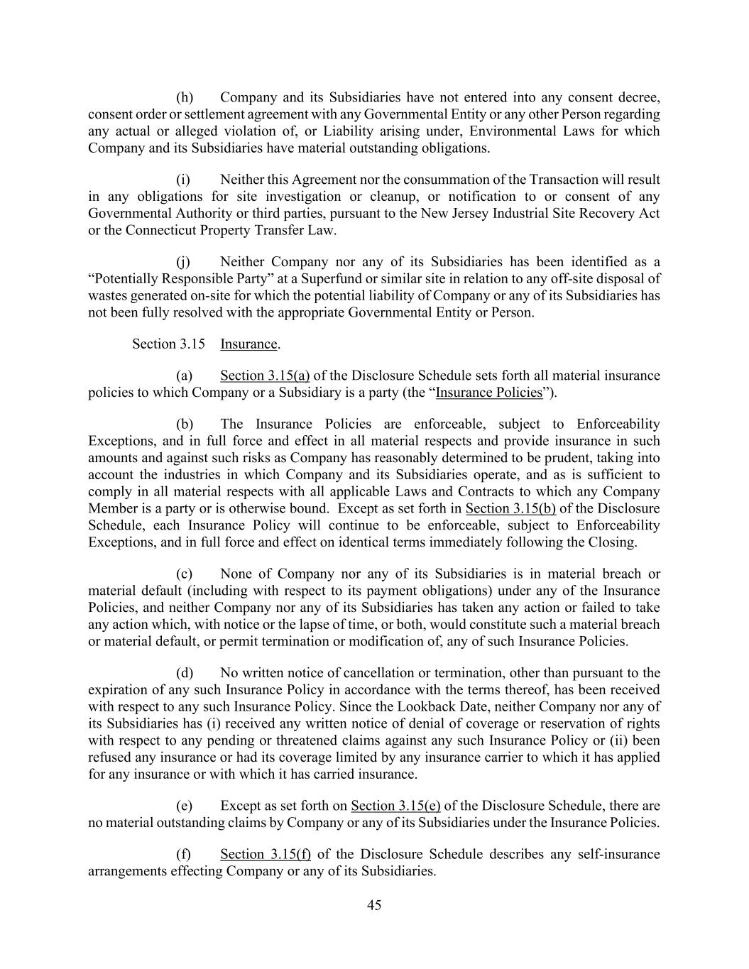 45 (h) Company and its Subsidiaries have not entered into any consent decree, consent order or settlement agreement with any Governmental Entity or any other Person regarding any actual or alleged violation of, or Liability arising under, Environmental Laws for which Company and its Subsidiaries have material outstanding obligations. (i) Neither this Agreement nor the consummation of the Transaction will result in any obligations for site investigation or cleanup, or notification to or consent of any Governmental Authority or third parties, pursuant to the New Jersey Industrial Site Recovery Act or the Connecticut Property Transfer Law. (j) Neither Company nor any of its Subsidiaries has been identified as a “Potentially Responsible Party” at a Superfund or similar site in relation to any off-site disposal of wastes generated on-site for which the potential liability of Company or any of its Subsidiaries has not been fully resolved with the appropriate Governmental Entity or Person. Section 3.15 Insurance. (a) Section 3.15(a) of the Disclosure Schedule sets forth all material insurance policies to which Company or a Subsidiary is a party (the “Insurance Policies”). (b) The Insurance Policies are enforceable, subject to Enforceability Exceptions, and in full force and effect in all material respects and provide insurance in such amounts and against such risks as Company has reasonably determined to be prudent, taking into account the industries in which Company and its Subsidiaries operate, and as is sufficient to comply in all material respects with all applicable Laws and Contracts to which any Company Member is a party or is otherwise bound. Except as set forth in Section 3.15(b) of the Disclosure Schedule, each Insurance Policy will continue to be enforceable, subject to Enforceability Exceptions, and in full force and effect on identical terms immediately following the Closing. (c) None of Company nor any of its Subsidiaries is in material breach or material default (including with respect to its payment obligations) under any of the Insurance Policies, and neither Company nor any of its Subsidiaries has taken any action or failed to take any action which, with notice or the lapse of time, or both, would constitute such a material breach or material default, or permit termination or modification of, any of such Insurance Policies. (d) No written notice of cancellation or termination, other than pursuant to the expiration of any such Insurance Policy in accordance with the terms thereof, has been received with respect to any such Insurance Policy. Since the Lookback Date, neither Company nor any of its Subsidiaries has (i) received any written notice of denial of coverage or reservation of rights with respect to any pending or threatened claims against any such Insurance Policy or (ii) been refused any insurance or had its coverage limited by any insurance carrier to which it has applied for any insurance or with which it has carried insurance. (e) Except as set forth on Section 3.15(e) of the Disclosure Schedule, there are no material outstanding claims by Company or any of its Subsidiaries under the Insurance Policies. (f) Section 3.15(f) of the Disclosure Schedule describes any self-insurance arrangements effecting Company or any of its Subsidiaries.