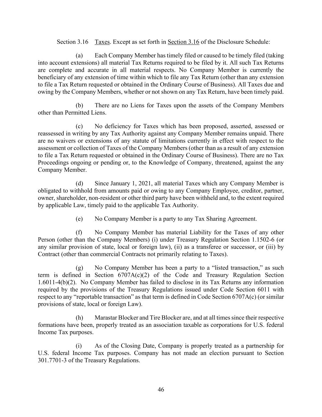 46 Section 3.16 Taxes. Except as set forth in Section 3.16 of the Disclosure Schedule: (a) Each Company Member has timely filed or caused to be timely filed (taking into account extensions) all material Tax Returns required to be filed by it. All such Tax Returns are complete and accurate in all material respects. No Company Member is currently the beneficiary of any extension of time within which to file any Tax Return (other than any extension to file a Tax Return requested or obtained in the Ordinary Course of Business). All Taxes due and owing by the Company Members, whether or not shown on any Tax Return, have been timely paid. (b) There are no Liens for Taxes upon the assets of the Company Members other than Permitted Liens. (c) No deficiency for Taxes which has been proposed, asserted, assessed or reassessed in writing by any Tax Authority against any Company Member remains unpaid. There are no waivers or extensions of any statute of limitations currently in effect with respect to the assessment or collection of Taxes of the Company Members (other than as a result of any extension to file a Tax Return requested or obtained in the Ordinary Course of Business). There are no Tax Proceedings ongoing or pending or, to the Knowledge of Company, threatened, against the any Company Member. (d) Since January 1, 2021, all material Taxes which any Company Member is obligated to withhold from amounts paid or owing to any Company Employee, creditor, partner, owner, shareholder, non-resident or other third party have been withheld and, to the extent required by applicable Law, timely paid to the applicable Tax Authority. (e) No Company Member is a party to any Tax Sharing Agreement. (f) No Company Member has material Liability for the Taxes of any other Person (other than the Company Members) (i) under Treasury Regulation Section 1.1502-6 (or any similar provision of state, local or foreign law), (ii) as a transferee or successor, or (iii) by Contract (other than commercial Contracts not primarily relating to Taxes). (g) No Company Member has been a party to a “listed transaction,” as such term is defined in Section 6707A(c)(2) of the Code and Treasury Regulation Section 1.6011-4(b)(2). No Company Member has failed to disclose in its Tax Returns any information required by the provisions of the Treasury Regulations issued under Code Section 6011 with respect to any “reportable transaction” as that term is defined in Code Section 6707A(c) (or similar provisions of state, local or foreign Law). (h) Marastar Blocker and Tire Blocker are, and at all times since their respective formations have been, properly treated as an association taxable as corporations for U.S. federal Income Tax purposes. (i) As of the Closing Date, Company is properly treated as a partnership for U.S. federal Income Tax purposes. Company has not made an election pursuant to Section 301.7701-3 of the Treasury Regulations.