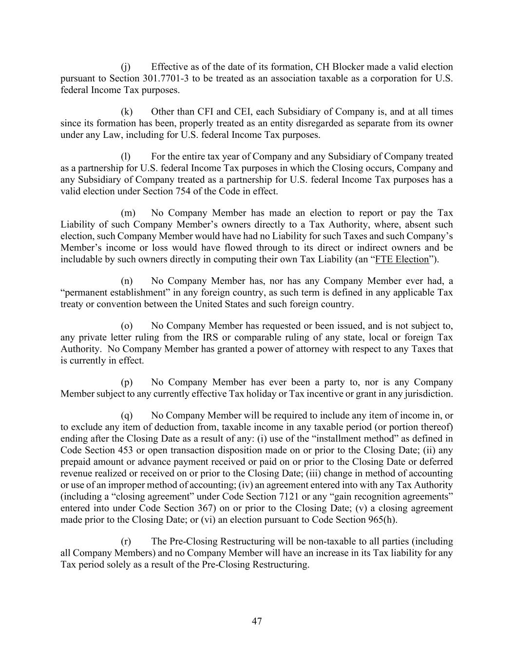 47 (j) Effective as of the date of its formation, CH Blocker made a valid election pursuant to Section 301.7701-3 to be treated as an association taxable as a corporation for U.S. federal Income Tax purposes. (k) Other than CFI and CEI, each Subsidiary of Company is, and at all times since its formation has been, properly treated as an entity disregarded as separate from its owner under any Law, including for U.S. federal Income Tax purposes. (l) For the entire tax year of Company and any Subsidiary of Company treated as a partnership for U.S. federal Income Tax purposes in which the Closing occurs, Company and any Subsidiary of Company treated as a partnership for U.S. federal Income Tax purposes has a valid election under Section 754 of the Code in effect. (m) No Company Member has made an election to report or pay the Tax Liability of such Company Member’s owners directly to a Tax Authority, where, absent such election, such Company Member would have had no Liability for such Taxes and such Company’s Member’s income or loss would have flowed through to its direct or indirect owners and be includable by such owners directly in computing their own Tax Liability (an “FTE Election”). (n) No Company Member has, nor has any Company Member ever had, a “permanent establishment” in any foreign country, as such term is defined in any applicable Tax treaty or convention between the United States and such foreign country. (o) No Company Member has requested or been issued, and is not subject to, any private letter ruling from the IRS or comparable ruling of any state, local or foreign Tax Authority. No Company Member has granted a power of attorney with respect to any Taxes that is currently in effect. (p) No Company Member has ever been a party to, nor is any Company Member subject to any currently effective Tax holiday or Tax incentive or grant in any jurisdiction. (q) No Company Member will be required to include any item of income in, or to exclude any item of deduction from, taxable income in any taxable period (or portion thereof) ending after the Closing Date as a result of any: (i) use of the “installment method” as defined in Code Section 453 or open transaction disposition made on or prior to the Closing Date; (ii) any prepaid amount or advance payment received or paid on or prior to the Closing Date or deferred revenue realized or received on or prior to the Closing Date; (iii) change in method of accounting or use of an improper method of accounting; (iv) an agreement entered into with any Tax Authority (including a “closing agreement” under Code Section 7121 or any “gain recognition agreements” entered into under Code Section 367) on or prior to the Closing Date; (v) a closing agreement made prior to the Closing Date; or (vi) an election pursuant to Code Section 965(h). (r) The Pre-Closing Restructuring will be non-taxable to all parties (including all Company Members) and no Company Member will have an increase in its Tax liability for any Tax period solely as a result of the Pre-Closing Restructuring.