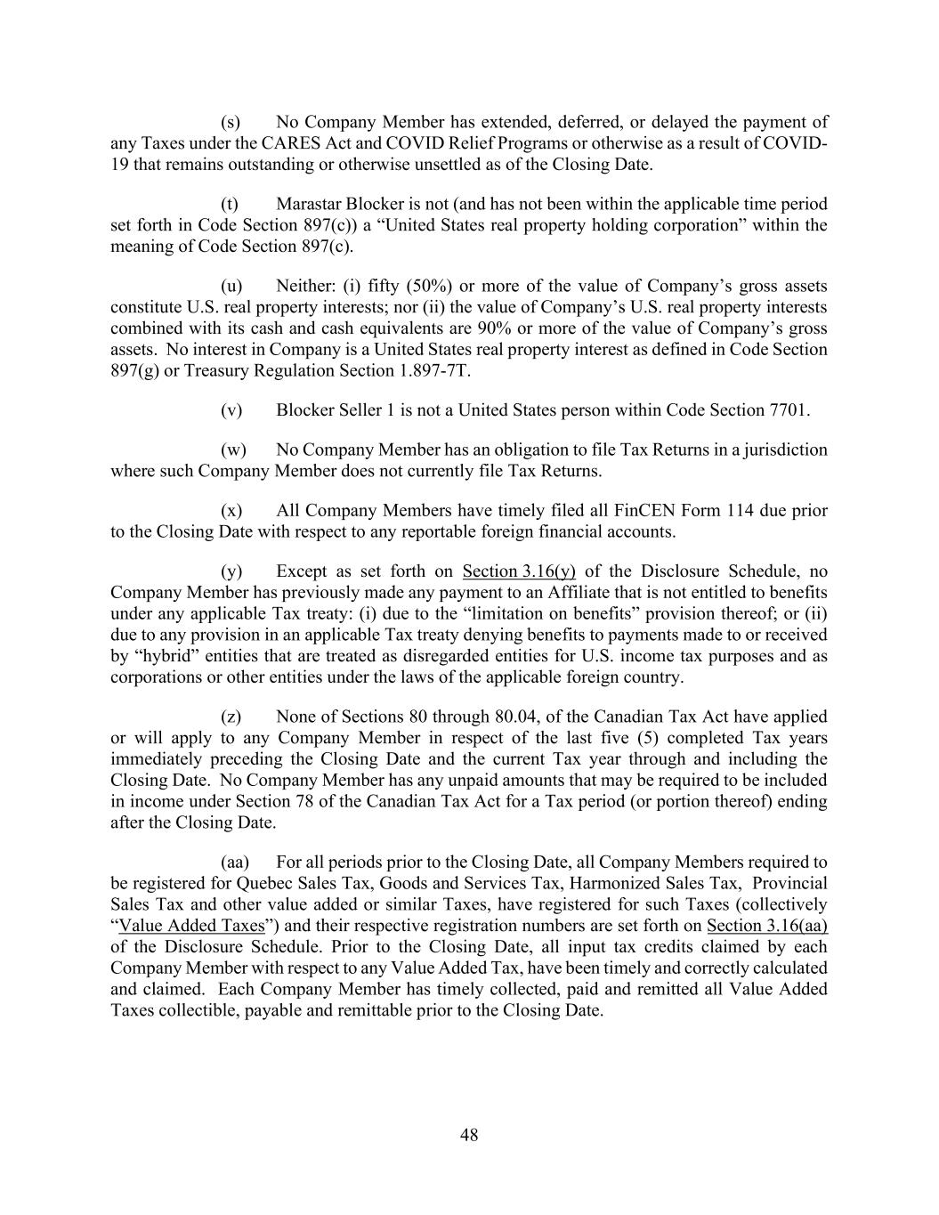 48 (s) No Company Member has extended, deferred, or delayed the payment of any Taxes under the CARES Act and COVID Relief Programs or otherwise as a result of COVID- 19 that remains outstanding or otherwise unsettled as of the Closing Date. (t) Marastar Blocker is not (and has not been within the applicable time period set forth in Code Section 897(c)) a “United States real property holding corporation” within the meaning of Code Section 897(c). (u) Neither: (i) fifty (50%) or more of the value of Company’s gross assets constitute U.S. real property interests; nor (ii) the value of Company’s U.S. real property interests combined with its cash and cash equivalents are 90% or more of the value of Company’s gross assets. No interest in Company is a United States real property interest as defined in Code Section 897(g) or Treasury Regulation Section 1.897-7T. (v) Blocker Seller 1 is not a United States person within Code Section 7701. (w) No Company Member has an obligation to file Tax Returns in a jurisdiction where such Company Member does not currently file Tax Returns. (x) All Company Members have timely filed all FinCEN Form 114 due prior to the Closing Date with respect to any reportable foreign financial accounts. (y) Except as set forth on Section 3.16(y) of the Disclosure Schedule, no Company Member has previously made any payment to an Affiliate that is not entitled to benefits under any applicable Tax treaty: (i) due to the “limitation on benefits” provision thereof; or (ii) due to any provision in an applicable Tax treaty denying benefits to payments made to or received by “hybrid” entities that are treated as disregarded entities for U.S. income tax purposes and as corporations or other entities under the laws of the applicable foreign country. (z) None of Sections 80 through 80.04, of the Canadian Tax Act have applied or will apply to any Company Member in respect of the last five (5) completed Tax years immediately preceding the Closing Date and the current Tax year through and including the Closing Date. No Company Member has any unpaid amounts that may be required to be included in income under Section 78 of the Canadian Tax Act for a Tax period (or portion thereof) ending after the Closing Date. (aa) For all periods prior to the Closing Date, all Company Members required to be registered for Quebec Sales Tax, Goods and Services Tax, Harmonized Sales Tax, Provincial Sales Tax and other value added or similar Taxes, have registered for such Taxes (collectively “Value Added Taxes”) and their respective registration numbers are set forth on Section 3.16(aa) of the Disclosure Schedule. Prior to the Closing Date, all input tax credits claimed by each Company Member with respect to any Value Added Tax, have been timely and correctly calculated and claimed. Each Company Member has timely collected, paid and remitted all Value Added Taxes collectible, payable and remittable prior to the Closing Date.