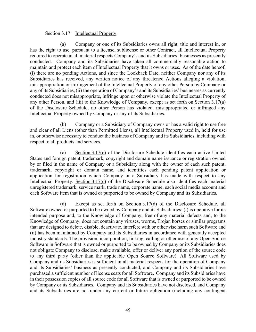 49 Section 3.17 Intellectual Property. (a) Company or one of its Subsidiaries owns all right, title and interest in, or has the right to use, pursuant to a license, sublicense or other Contract, all Intellectual Property required to operate in all material respects Company’s and its Subsidiaries’ businesses as presently conducted. Company and its Subsidiaries have taken all commercially reasonable action to maintain and protect each item of Intellectual Property that it owns or uses. As of the date hereof, (i) there are no pending Actions, and since the Lookback Date, neither Company nor any of its Subsidiaries has received, any written notice of any threatened Actions alleging a violation, misappropriation or infringement of the Intellectual Property of any other Person by Company or any of its Subsidiaries, (ii) the operation of Company’s and its Subsidiaries’ businesses as currently conducted does not misappropriate, infringe upon or otherwise violate the Intellectual Property of any other Person, and (iii) to the Knowledge of Company, except as set forth on Section 3.17(a) of the Disclosure Schedule, no other Person has violated, misappropriated or infringed any Intellectual Property owned by Company or any of its Subsidiaries. (b) Company or a Subsidiary of Company owns or has a valid right to use free and clear of all Liens (other than Permitted Liens), all Intellectual Property used in, held for use in, or otherwise necessary to conduct the business of Company and its Subsidiaries, including with respect to all products and services. (c) Section 3.17(c) of the Disclosure Schedule identifies each active United States and foreign patent, trademark, copyright and domain name issuance or registration owned by or filed in the name of Company or a Subsidiary along with the owner of each such patent, trademark, copyright or domain name, and identifies each pending patent application or application for registration which Company or a Subsidiary has made with respect to any Intellectual Property. Section 3.17(c) of the Disclosure Schedule also identifies each material unregistered trademark, service mark, trade name, corporate name, each social media account and each Software item that is owned or purported to be owned by Company and its Subsidiaries. (d) Except as set forth on Section 3.17(d) of the Disclosure Schedule, all Software owned or purported to be owned by Company and its Subsidiaries: (i) is operative for its intended purpose and, to the Knowledge of Company, free of any material defects and, to the Knowledge of Company, does not contain any viruses, worms, Trojan horses or similar programs that are designed to delete, disable, deactivate, interfere with or otherwise harm such Software and (ii) has been maintained by Company and its Subsidiaries in accordance with generally accepted industry standards. The provision, incorporation, linking, calling or other use of any Open Source Software in Software that is owned or purported to be owned by Company or its Subsidiaries does not obligate Company to disclose, make available, offer or deliver any portion of the source code to any third party (other than the applicable Open Source Software). All Software used by Company and its Subsidiaries is sufficient in all material respects for the operation of Company and its Subsidiaries’ business as presently conducted, and Company and its Subsidiaries have purchased a sufficient number of license seats for all Software. Company and its Subsidiaries have in their possession copies of all source code for all Software that is owned or purported to be owned by Company or its Subsidiaries. Company and its Subsidiaries have not disclosed, and Company and its Subsidiaries are not under any current or future obligation (including any contingent