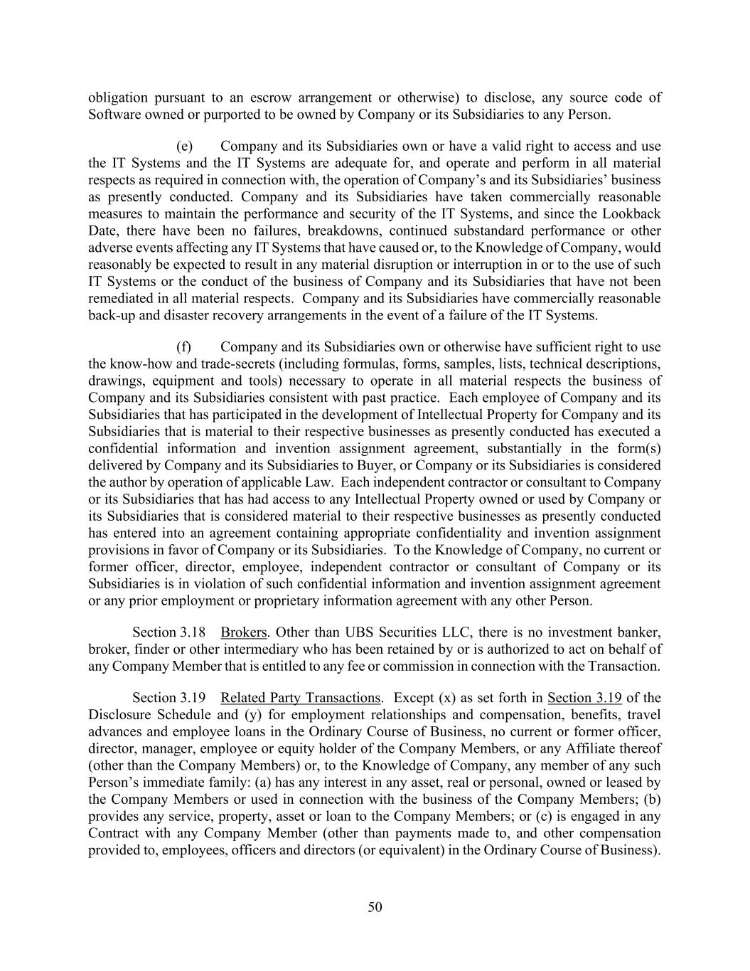 50 obligation pursuant to an escrow arrangement or otherwise) to disclose, any source code of Software owned or purported to be owned by Company or its Subsidiaries to any Person. (e) Company and its Subsidiaries own or have a valid right to access and use the IT Systems and the IT Systems are adequate for, and operate and perform in all material respects as required in connection with, the operation of Company’s and its Subsidiaries’ business as presently conducted. Company and its Subsidiaries have taken commercially reasonable measures to maintain the performance and security of the IT Systems, and since the Lookback Date, there have been no failures, breakdowns, continued substandard performance or other adverse events affecting any IT Systems that have caused or, to the Knowledge of Company, would reasonably be expected to result in any material disruption or interruption in or to the use of such IT Systems or the conduct of the business of Company and its Subsidiaries that have not been remediated in all material respects. Company and its Subsidiaries have commercially reasonable back-up and disaster recovery arrangements in the event of a failure of the IT Systems. (f) Company and its Subsidiaries own or otherwise have sufficient right to use the know-how and trade-secrets (including formulas, forms, samples, lists, technical descriptions, drawings, equipment and tools) necessary to operate in all material respects the business of Company and its Subsidiaries consistent with past practice. Each employee of Company and its Subsidiaries that has participated in the development of Intellectual Property for Company and its Subsidiaries that is material to their respective businesses as presently conducted has executed a confidential information and invention assignment agreement, substantially in the form(s) delivered by Company and its Subsidiaries to Buyer, or Company or its Subsidiaries is considered the author by operation of applicable Law. Each independent contractor or consultant to Company or its Subsidiaries that has had access to any Intellectual Property owned or used by Company or its Subsidiaries that is considered material to their respective businesses as presently conducted has entered into an agreement containing appropriate confidentiality and invention assignment provisions in favor of Company or its Subsidiaries. To the Knowledge of Company, no current or former officer, director, employee, independent contractor or consultant of Company or its Subsidiaries is in violation of such confidential information and invention assignment agreement or any prior employment or proprietary information agreement with any other Person. Section 3.18 Brokers. Other than UBS Securities LLC, there is no investment banker, broker, finder or other intermediary who has been retained by or is authorized to act on behalf of any Company Member that is entitled to any fee or commission in connection with the Transaction. Section 3.19 Related Party Transactions. Except (x) as set forth in Section 3.19 of the Disclosure Schedule and (y) for employment relationships and compensation, benefits, travel advances and employee loans in the Ordinary Course of Business, no current or former officer, director, manager, employee or equity holder of the Company Members, or any Affiliate thereof (other than the Company Members) or, to the Knowledge of Company, any member of any such Person’s immediate family: (a) has any interest in any asset, real or personal, owned or leased by the Company Members or used in connection with the business of the Company Members; (b) provides any service, property, asset or loan to the Company Members; or (c) is engaged in any Contract with any Company Member (other than payments made to, and other compensation provided to, employees, officers and directors (or equivalent) in the Ordinary Course of Business).