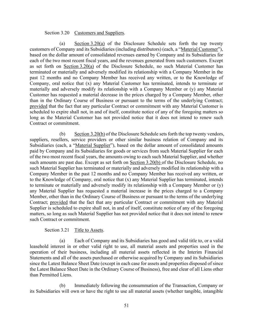 51 Section 3.20 Customers and Suppliers. (a) Section 3.20(a) of the Disclosure Schedule sets forth the top twenty customers of Company and its Subsidiaries (including distributors) (each, a “Material Customer”), based on the dollar amount of consolidated revenues earned by Company and its Subsidiaries for each of the two most recent fiscal years, and the revenues generated from such customers. Except as set forth on Section 3.20(a) of the Disclosure Schedule, no such Material Customer has terminated or materially and adversely modified its relationship with a Company Member in the past 12 months and no Company Member has received any written, or to the Knowledge of Company, oral notice that (x) any Material Customer has terminated, intends to terminate or materially and adversely modify its relationship with a Company Member or (y) any Material Customer has requested a material decrease in the prices charged by a Company Member, other than in the Ordinary Course of Business or pursuant to the terms of the underlying Contract; provided that the fact that any particular Contract or commitment with any Material Customer is scheduled to expire shall not, in and of itself, constitute notice of any of the foregoing matters so long as the Material Customer has not provided notice that it does not intend to renew such Contract or commitment. (b) Section 3.20(b) of the Disclosure Schedule sets forth the top twenty vendors, suppliers, resellers, service providers or other similar business relation of Company and its Subsidiaries (each, a “Material Supplier”), based on the dollar amount of consolidated amounts paid by Company and its Subsidiaries for goods or services from such Material Supplier for each of the two most recent fiscal years, the amounts owing to each such Material Supplier, and whether such amounts are past due. Except as set forth on Section 3.20(b) of the Disclosure Schedule, no such Material Supplier has terminated or materially and adversely modified its relationship with a Company Member in the past 12 months and no Company Member has received any written, or to the Knowledge of Company, oral notice that (x) any Material Supplier has terminated, intends to terminate or materially and adversely modify its relationship with a Company Member or (y) any Material Supplier has requested a material increase in the prices charged to a Company Member, other than in the Ordinary Course of Business or pursuant to the terms of the underlying Contract; provided that the fact that any particular Contract or commitment with any Material Supplier is scheduled to expire shall not, in and of itself, constitute notice of any of the foregoing matters, so long as such Material Supplier has not provided notice that it does not intend to renew such Contract or commitment. Section 3.21 Title to Assets. (a) Each of Company and its Subsidiaries has good and valid title to, or a valid leasehold interest in or other valid right to use, all material assets and properties used in the operation of their business, including all material assets reflected in the Interim Financial Statements and all of the assets purchased or otherwise acquired by Company and its Subsidiaries since the Latest Balance Sheet Date (except in each case for assets and properties disposed of since the Latest Balance Sheet Date in the Ordinary Course of Business), free and clear of all Liens other than Permitted Liens. (b) Immediately following the consummation of the Transaction, Company or its Subsidiaries will own or have the right to use all material assets (whether tangible, intangible