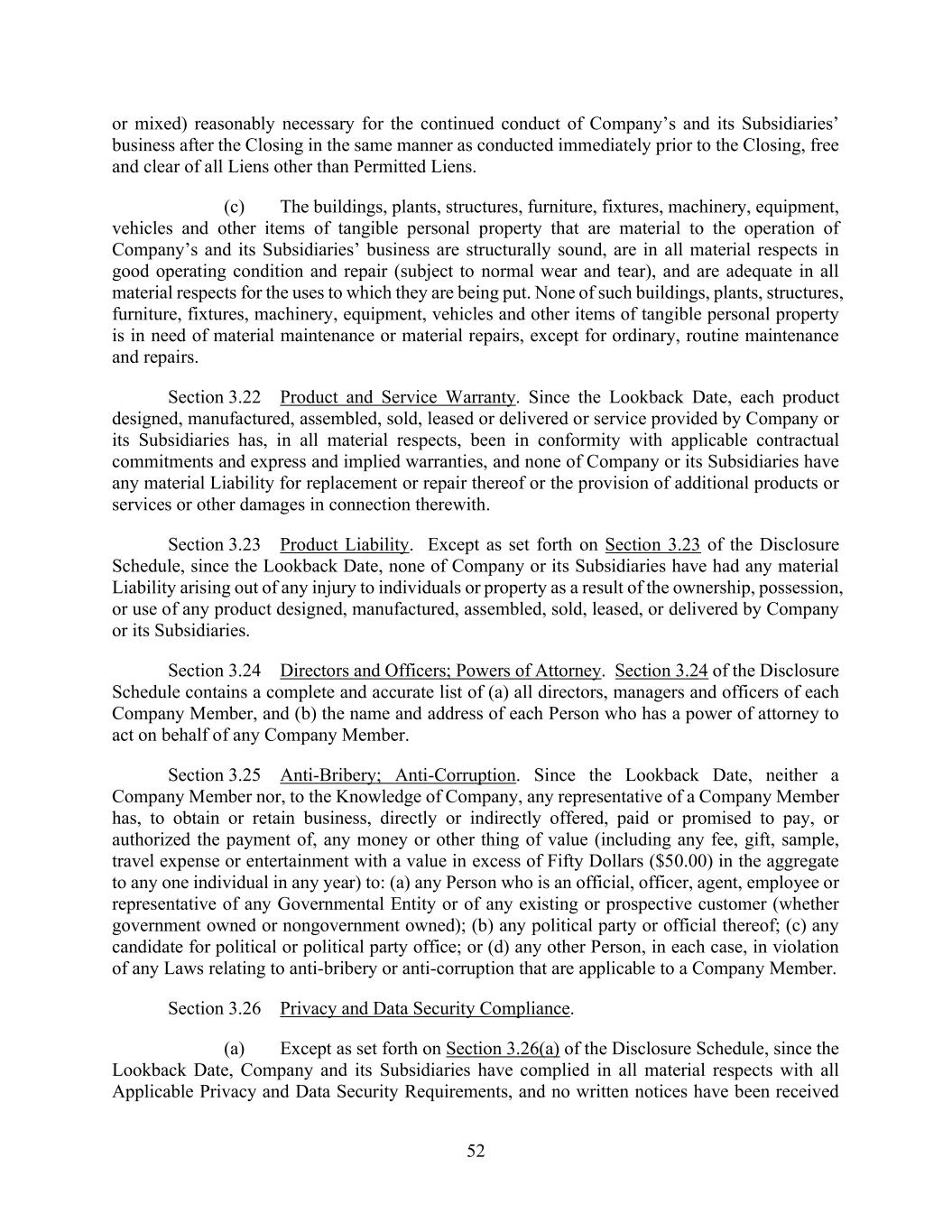 52 or mixed) reasonably necessary for the continued conduct of Company’s and its Subsidiaries’ business after the Closing in the same manner as conducted immediately prior to the Closing, free and clear of all Liens other than Permitted Liens. (c) The buildings, plants, structures, furniture, fixtures, machinery, equipment, vehicles and other items of tangible personal property that are material to the operation of Company’s and its Subsidiaries’ business are structurally sound, are in all material respects in good operating condition and repair (subject to normal wear and tear), and are adequate in all material respects for the uses to which they are being put. None of such buildings, plants, structures, furniture, fixtures, machinery, equipment, vehicles and other items of tangible personal property is in need of material maintenance or material repairs, except for ordinary, routine maintenance and repairs. Section 3.22 Product and Service Warranty. Since the Lookback Date, each product designed, manufactured, assembled, sold, leased or delivered or service provided by Company or its Subsidiaries has, in all material respects, been in conformity with applicable contractual commitments and express and implied warranties, and none of Company or its Subsidiaries have any material Liability for replacement or repair thereof or the provision of additional products or services or other damages in connection therewith. Section 3.23 Product Liability. Except as set forth on Section 3.23 of the Disclosure Schedule, since the Lookback Date, none of Company or its Subsidiaries have had any material Liability arising out of any injury to individuals or property as a result of the ownership, possession, or use of any product designed, manufactured, assembled, sold, leased, or delivered by Company or its Subsidiaries. Section 3.24 Directors and Officers; Powers of Attorney. Section 3.24 of the Disclosure Schedule contains a complete and accurate list of (a) all directors, managers and officers of each Company Member, and (b) the name and address of each Person who has a power of attorney to act on behalf of any Company Member. Section 3.25 Anti-Bribery; Anti-Corruption. Since the Lookback Date, neither a Company Member nor, to the Knowledge of Company, any representative of a Company Member has, to obtain or retain business, directly or indirectly offered, paid or promised to pay, or authorized the payment of, any money or other thing of value (including any fee, gift, sample, travel expense or entertainment with a value in excess of Fifty Dollars ($50.00) in the aggregate to any one individual in any year) to: (a) any Person who is an official, officer, agent, employee or representative of any Governmental Entity or of any existing or prospective customer (whether government owned or nongovernment owned); (b) any political party or official thereof; (c) any candidate for political or political party office; or (d) any other Person, in each case, in violation of any Laws relating to anti-bribery or anti-corruption that are applicable to a Company Member. Section 3.26 Privacy and Data Security Compliance. (a) Except as set forth on Section 3.26(a) of the Disclosure Schedule, since the Lookback Date, Company and its Subsidiaries have complied in all material respects with all Applicable Privacy and Data Security Requirements, and no written notices have been received