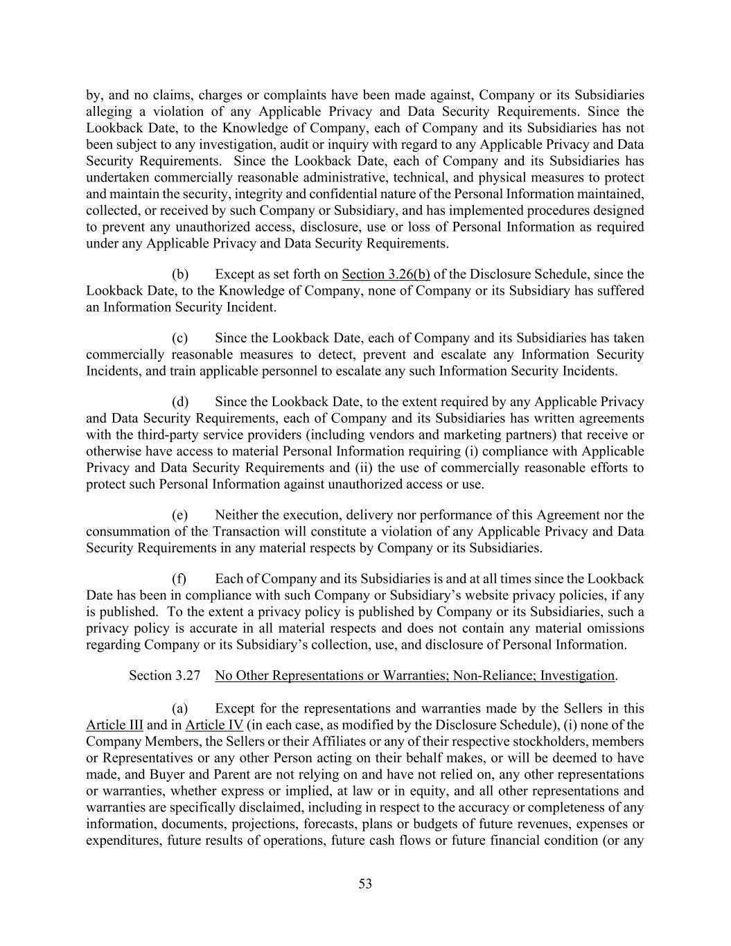 53 by, and no claims, charges or complaints have been made against, Company or its Subsidiaries alleging a violation of any Applicable Privacy and Data Security Requirements. Since the Lookback Date, to the Knowledge of Company, each of Company and its Subsidiaries has not been subject to any investigation, audit or inquiry with regard to any Applicable Privacy and Data Security Requirements. Since the Lookback Date, each of Company and its Subsidiaries has undertaken commercially reasonable administrative, technical, and physical measures to protect and maintain the security, integrity and confidential nature of the Personal Information maintained, collected, or received by such Company or Subsidiary, and has implemented procedures designed to prevent any unauthorized access, disclosure, use or loss of Personal Information as required under any Applicable Privacy and Data Security Requirements. (b) Except as set forth on Section 3.26(b) of the Disclosure Schedule, since the Lookback Date, to the Knowledge of Company, none of Company or its Subsidiary has suffered an Information Security Incident. (c) Since the Lookback Date, each of Company and its Subsidiaries has taken commercially reasonable measures to detect, prevent and escalate any Information Security Incidents, and train applicable personnel to escalate any such Information Security Incidents. (d) Since the Lookback Date, to the extent required by any Applicable Privacy and Data Security Requirements, each of Company and its Subsidiaries has written agreements with the third-party service providers (including vendors and marketing partners) that receive or otherwise have access to material Personal Information requiring (i) compliance with Applicable Privacy and Data Security Requirements and (ii) the use of commercially reasonable efforts to protect such Personal Information against unauthorized access or use. (e) Neither the execution, delivery nor performance of this Agreement nor the consummation of the Transaction will constitute a violation of any Applicable Privacy and Data Security Requirements in any material respects by Company or its Subsidiaries. (f) Each of Company and its Subsidiaries is and at all times since the Lookback Date has been in compliance with such Company or Subsidiary’s website privacy policies, if any is published. To the extent a privacy policy is published by Company or its Subsidiaries, such a privacy policy is accurate in all material respects and does not contain any material omissions regarding Company or its Subsidiary’s collection, use, and disclosure of Personal Information. Section 3.27 No Other Representations or Warranties; Non-Reliance; Investigation. (a) Except for the representations and warranties made by the Sellers in this Article III and in Article IV (in each case, as modified by the Disclosure Schedule), (i) none of the Company Members, the Sellers or their Affiliates or any of their respective stockholders, members or Representatives or any other Person acting on their behalf makes, or will be deemed to have made, and Buyer and Parent are not relying on and have not relied on, any other representations or warranties, whether express or implied, at law or in equity, and all other representations and warranties are specifically disclaimed, including in respect to the accuracy or completeness of any information, documents, projections, forecasts, plans or budgets of future revenues, expenses or expenditures, future results of operations, future cash flows or future financial condition (or any