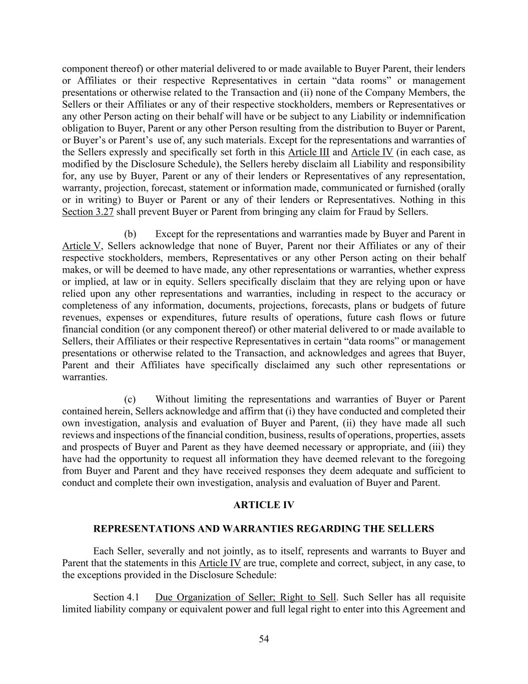 54 component thereof) or other material delivered to or made available to Buyer Parent, their lenders or Affiliates or their respective Representatives in certain “data rooms” or management presentations or otherwise related to the Transaction and (ii) none of the Company Members, the Sellers or their Affiliates or any of their respective stockholders, members or Representatives or any other Person acting on their behalf will have or be subject to any Liability or indemnification obligation to Buyer, Parent or any other Person resulting from the distribution to Buyer or Parent, or Buyer’s or Parent’s use of, any such materials. Except for the representations and warranties of the Sellers expressly and specifically set forth in this Article III and Article IV (in each case, as modified by the Disclosure Schedule), the Sellers hereby disclaim all Liability and responsibility for, any use by Buyer, Parent or any of their lenders or Representatives of any representation, warranty, projection, forecast, statement or information made, communicated or furnished (orally or in writing) to Buyer or Parent or any of their lenders or Representatives. Nothing in this Section 3.27 shall prevent Buyer or Parent from bringing any claim for Fraud by Sellers. (b) Except for the representations and warranties made by Buyer and Parent in Article V, Sellers acknowledge that none of Buyer, Parent nor their Affiliates or any of their respective stockholders, members, Representatives or any other Person acting on their behalf makes, or will be deemed to have made, any other representations or warranties, whether express or implied, at law or in equity. Sellers specifically disclaim that they are relying upon or have relied upon any other representations and warranties, including in respect to the accuracy or completeness of any information, documents, projections, forecasts, plans or budgets of future revenues, expenses or expenditures, future results of operations, future cash flows or future financial condition (or any component thereof) or other material delivered to or made available to Sellers, their Affiliates or their respective Representatives in certain “data rooms” or management presentations or otherwise related to the Transaction, and acknowledges and agrees that Buyer, Parent and their Affiliates have specifically disclaimed any such other representations or warranties. (c) Without limiting the representations and warranties of Buyer or Parent contained herein, Sellers acknowledge and affirm that (i) they have conducted and completed their own investigation, analysis and evaluation of Buyer and Parent, (ii) they have made all such reviews and inspections of the financial condition, business, results of operations, properties, assets and prospects of Buyer and Parent as they have deemed necessary or appropriate, and (iii) they have had the opportunity to request all information they have deemed relevant to the foregoing from Buyer and Parent and they have received responses they deem adequate and sufficient to conduct and complete their own investigation, analysis and evaluation of Buyer and Parent. ARTICLE IV REPRESENTATIONS AND WARRANTIES REGARDING THE SELLERS Each Seller, severally and not jointly, as to itself, represents and warrants to Buyer and Parent that the statements in this Article IV are true, complete and correct, subject, in any case, to the exceptions provided in the Disclosure Schedule: Section 4.1 Due Organization of Seller; Right to Sell. Such Seller has all requisite limited liability company or equivalent power and full legal right to enter into this Agreement and