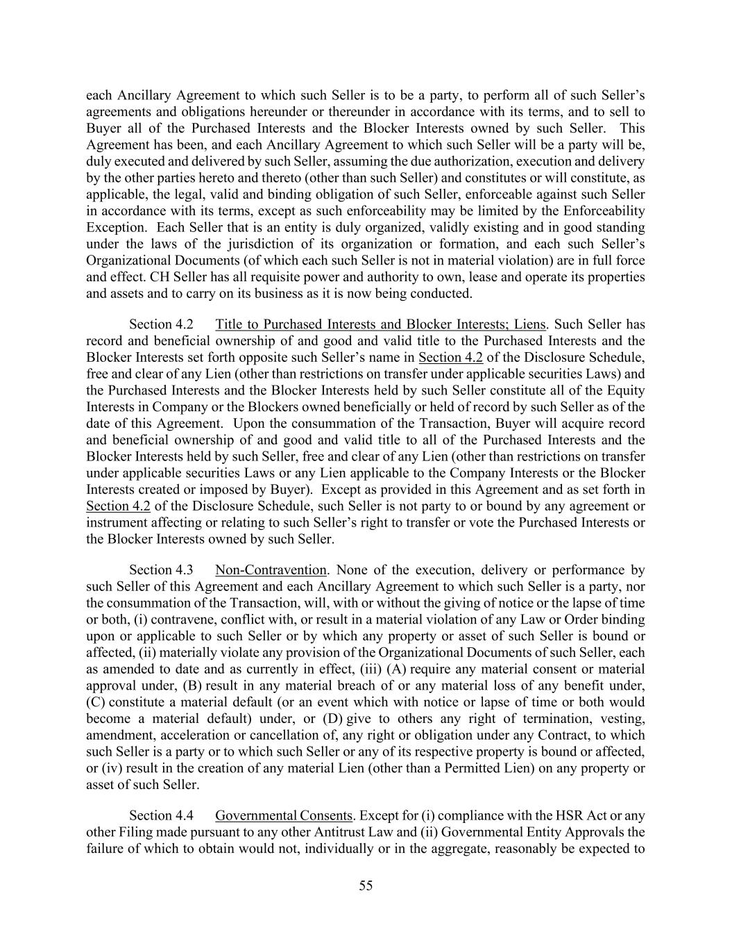 55 each Ancillary Agreement to which such Seller is to be a party, to perform all of such Seller’s agreements and obligations hereunder or thereunder in accordance with its terms, and to sell to Buyer all of the Purchased Interests and the Blocker Interests owned by such Seller. This Agreement has been, and each Ancillary Agreement to which such Seller will be a party will be, duly executed and delivered by such Seller, assuming the due authorization, execution and delivery by the other parties hereto and thereto (other than such Seller) and constitutes or will constitute, as applicable, the legal, valid and binding obligation of such Seller, enforceable against such Seller in accordance with its terms, except as such enforceability may be limited by the Enforceability Exception. Each Seller that is an entity is duly organized, validly existing and in good standing under the laws of the jurisdiction of its organization or formation, and each such Seller’s Organizational Documents (of which each such Seller is not in material violation) are in full force and effect. CH Seller has all requisite power and authority to own, lease and operate its properties and assets and to carry on its business as it is now being conducted. Section 4.2 Title to Purchased Interests and Blocker Interests; Liens. Such Seller has record and beneficial ownership of and good and valid title to the Purchased Interests and the Blocker Interests set forth opposite such Seller’s name in Section 4.2 of the Disclosure Schedule, free and clear of any Lien (other than restrictions on transfer under applicable securities Laws) and the Purchased Interests and the Blocker Interests held by such Seller constitute all of the Equity Interests in Company or the Blockers owned beneficially or held of record by such Seller as of the date of this Agreement. Upon the consummation of the Transaction, Buyer will acquire record and beneficial ownership of and good and valid title to all of the Purchased Interests and the Blocker Interests held by such Seller, free and clear of any Lien (other than restrictions on transfer under applicable securities Laws or any Lien applicable to the Company Interests or the Blocker Interests created or imposed by Buyer). Except as provided in this Agreement and as set forth in Section 4.2 of the Disclosure Schedule, such Seller is not party to or bound by any agreement or instrument affecting or relating to such Seller’s right to transfer or vote the Purchased Interests or the Blocker Interests owned by such Seller. Section 4.3 Non-Contravention. None of the execution, delivery or performance by such Seller of this Agreement and each Ancillary Agreement to which such Seller is a party, nor the consummation of the Transaction, will, with or without the giving of notice or the lapse of time or both, (i) contravene, conflict with, or result in a material violation of any Law or Order binding upon or applicable to such Seller or by which any property or asset of such Seller is bound or affected, (ii) materially violate any provision of the Organizational Documents of such Seller, each as amended to date and as currently in effect, (iii) (A) require any material consent or material approval under, (B) result in any material breach of or any material loss of any benefit under, (C) constitute a material default (or an event which with notice or lapse of time or both would become a material default) under, or (D) give to others any right of termination, vesting, amendment, acceleration or cancellation of, any right or obligation under any Contract, to which such Seller is a party or to which such Seller or any of its respective property is bound or affected, or (iv) result in the creation of any material Lien (other than a Permitted Lien) on any property or asset of such Seller. Section 4.4 Governmental Consents. Except for (i) compliance with the HSR Act or any other Filing made pursuant to any other Antitrust Law and (ii) Governmental Entity Approvals the failure of which to obtain would not, individually or in the aggregate, reasonably be expected to