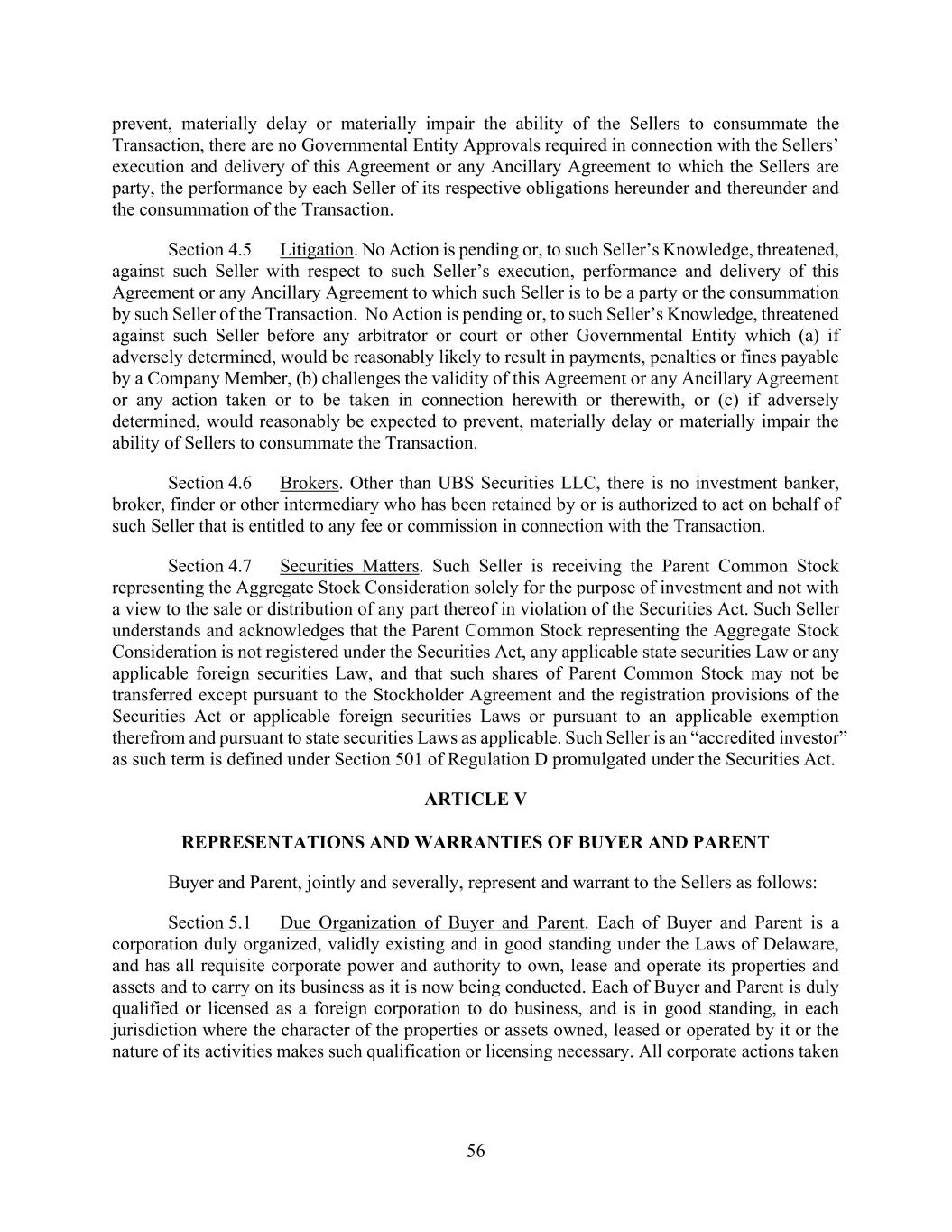 56 prevent, materially delay or materially impair the ability of the Sellers to consummate the Transaction, there are no Governmental Entity Approvals required in connection with the Sellers’ execution and delivery of this Agreement or any Ancillary Agreement to which the Sellers are party, the performance by each Seller of its respective obligations hereunder and thereunder and the consummation of the Transaction. Section 4.5 Litigation. No Action is pending or, to such Seller’s Knowledge, threatened, against such Seller with respect to such Seller’s execution, performance and delivery of this Agreement or any Ancillary Agreement to which such Seller is to be a party or the consummation by such Seller of the Transaction. No Action is pending or, to such Seller’s Knowledge, threatened against such Seller before any arbitrator or court or other Governmental Entity which (a) if adversely determined, would be reasonably likely to result in payments, penalties or fines payable by a Company Member, (b) challenges the validity of this Agreement or any Ancillary Agreement or any action taken or to be taken in connection herewith or therewith, or (c) if adversely determined, would reasonably be expected to prevent, materially delay or materially impair the ability of Sellers to consummate the Transaction. Section 4.6 Brokers. Other than UBS Securities LLC, there is no investment banker, broker, finder or other intermediary who has been retained by or is authorized to act on behalf of such Seller that is entitled to any fee or commission in connection with the Transaction. Section 4.7 Securities Matters. Such Seller is receiving the Parent Common Stock representing the Aggregate Stock Consideration solely for the purpose of investment and not with a view to the sale or distribution of any part thereof in violation of the Securities Act. Such Seller understands and acknowledges that the Parent Common Stock representing the Aggregate Stock Consideration is not registered under the Securities Act, any applicable state securities Law or any applicable foreign securities Law, and that such shares of Parent Common Stock may not be transferred except pursuant to the Stockholder Agreement and the registration provisions of the Securities Act or applicable foreign securities Laws or pursuant to an applicable exemption therefrom and pursuant to state securities Laws as applicable. Such Seller is an “accredited investor” as such term is defined under Section 501 of Regulation D promulgated under the Securities Act. ARTICLE V REPRESENTATIONS AND WARRANTIES OF BUYER AND PARENT Buyer and Parent, jointly and severally, represent and warrant to the Sellers as follows: Section 5.1 Due Organization of Buyer and Parent. Each of Buyer and Parent is a corporation duly organized, validly existing and in good standing under the Laws of Delaware, and has all requisite corporate power and authority to own, lease and operate its properties and assets and to carry on its business as it is now being conducted. Each of Buyer and Parent is duly qualified or licensed as a foreign corporation to do business, and is in good standing, in each jurisdiction where the character of the properties or assets owned, leased or operated by it or the nature of its activities makes such qualification or licensing necessary. All corporate actions taken