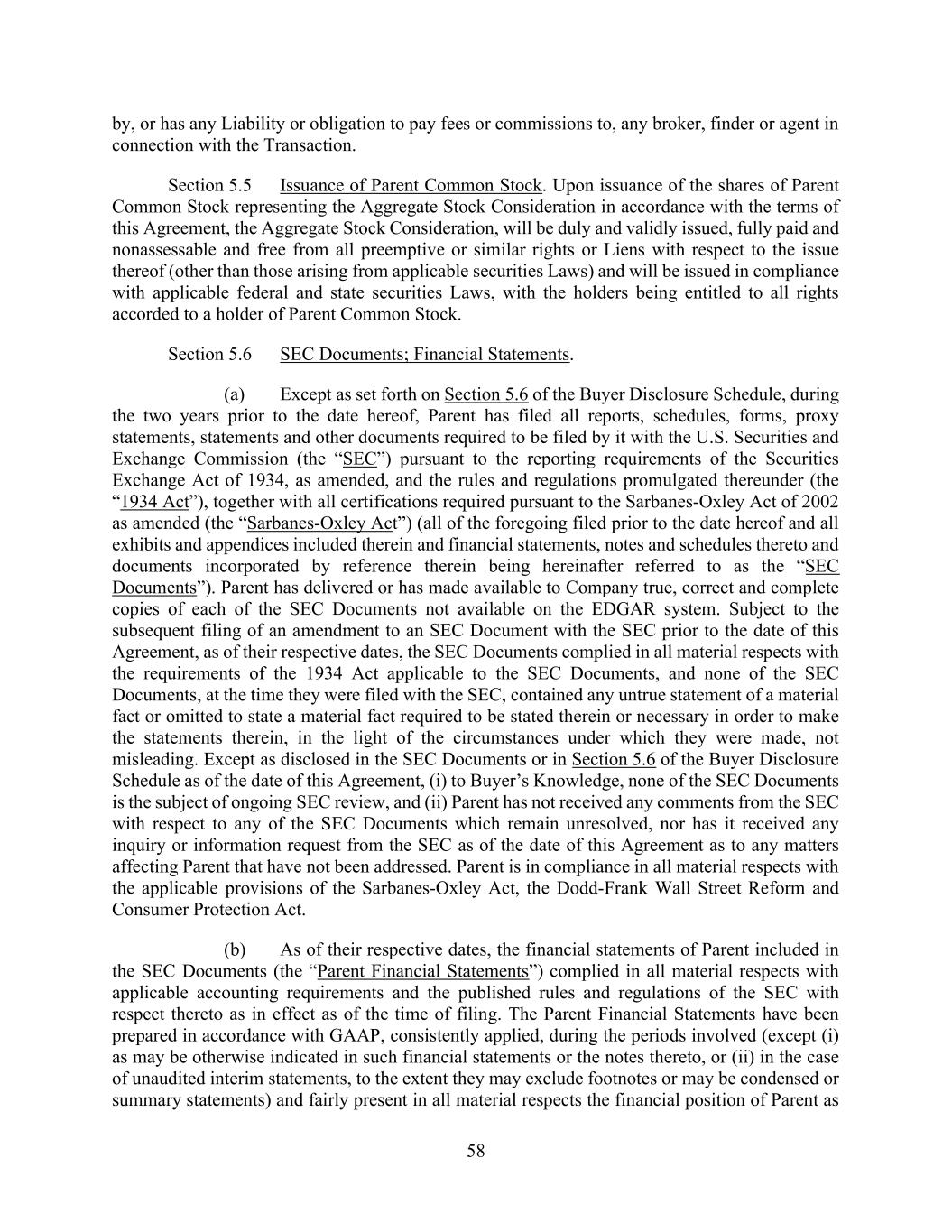 58 by, or has any Liability or obligation to pay fees or commissions to, any broker, finder or agent in connection with the Transaction. Section 5.5 Issuance of Parent Common Stock. Upon issuance of the shares of Parent Common Stock representing the Aggregate Stock Consideration in accordance with the terms of this Agreement, the Aggregate Stock Consideration, will be duly and validly issued, fully paid and nonassessable and free from all preemptive or similar rights or Liens with respect to the issue thereof (other than those arising from applicable securities Laws) and will be issued in compliance with applicable federal and state securities Laws, with the holders being entitled to all rights accorded to a holder of Parent Common Stock. Section 5.6 SEC Documents; Financial Statements. (a) Except as set forth on Section 5.6 of the Buyer Disclosure Schedule, during the two years prior to the date hereof, Parent has filed all reports, schedules, forms, proxy statements, statements and other documents required to be filed by it with the U.S. Securities and Exchange Commission (the “SEC”) pursuant to the reporting requirements of the Securities Exchange Act of 1934, as amended, and the rules and regulations promulgated thereunder (the “1934 Act”), together with all certifications required pursuant to the Sarbanes-Oxley Act of 2002 as amended (the “Sarbanes-Oxley Act”) (all of the foregoing filed prior to the date hereof and all exhibits and appendices included therein and financial statements, notes and schedules thereto and documents incorporated by reference therein being hereinafter referred to as the “SEC Documents”). Parent has delivered or has made available to Company true, correct and complete copies of each of the SEC Documents not available on the EDGAR system. Subject to the subsequent filing of an amendment to an SEC Document with the SEC prior to the date of this Agreement, as of their respective dates, the SEC Documents complied in all material respects with the requirements of the 1934 Act applicable to the SEC Documents, and none of the SEC Documents, at the time they were filed with the SEC, contained any untrue statement of a material fact or omitted to state a material fact required to be stated therein or necessary in order to make the statements therein, in the light of the circumstances under which they were made, not misleading. Except as disclosed in the SEC Documents or in Section 5.6 of the Buyer Disclosure Schedule as of the date of this Agreement, (i) to Buyer’s Knowledge, none of the SEC Documents is the subject of ongoing SEC review, and (ii) Parent has not received any comments from the SEC with respect to any of the SEC Documents which remain unresolved, nor has it received any inquiry or information request from the SEC as of the date of this Agreement as to any matters affecting Parent that have not been addressed. Parent is in compliance in all material respects with the applicable provisions of the Sarbanes-Oxley Act, the Dodd-Frank Wall Street Reform and Consumer Protection Act. (b) As of their respective dates, the financial statements of Parent included in the SEC Documents (the “Parent Financial Statements”) complied in all material respects with applicable accounting requirements and the published rules and regulations of the SEC with respect thereto as in effect as of the time of filing. The Parent Financial Statements have been prepared in accordance with GAAP, consistently applied, during the periods involved (except (i) as may be otherwise indicated in such financial statements or the notes thereto, or (ii) in the case of unaudited interim statements, to the extent they may exclude footnotes or may be condensed or summary statements) and fairly present in all material respects the financial position of Parent as