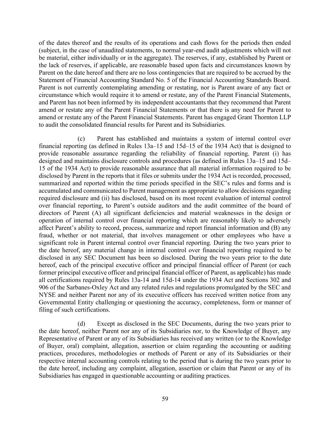 59 of the dates thereof and the results of its operations and cash flows for the periods then ended (subject, in the case of unaudited statements, to normal year-end audit adjustments which will not be material, either individually or in the aggregate). The reserves, if any, established by Parent or the lack of reserves, if applicable, are reasonable based upon facts and circumstances known by Parent on the date hereof and there are no loss contingencies that are required to be accrued by the Statement of Financial Accounting Standard No. 5 of the Financial Accounting Standards Board. Parent is not currently contemplating amending or restating, nor is Parent aware of any fact or circumstance which would require it to amend or restate, any of the Parent Financial Statements, and Parent has not been informed by its independent accountants that they recommend that Parent amend or restate any of the Parent Financial Statements or that there is any need for Parent to amend or restate any of the Parent Financial Statements. Parent has engaged Grant Thornton LLP to audit the consolidated financial results for Parent and its Subsidiaries. (c) Parent has established and maintains a system of internal control over financial reporting (as defined in Rules 13a–15 and 15d–15 of the 1934 Act) that is designed to provide reasonable assurance regarding the reliability of financial reporting. Parent (i) has designed and maintains disclosure controls and procedures (as defined in Rules 13a–15 and 15d– 15 of the 1934 Act) to provide reasonable assurance that all material information required to be disclosed by Parent in the reports that it files or submits under the 1934 Act is recorded, processed, summarized and reported within the time periods specified in the SEC’s rules and forms and is accumulated and communicated to Parent management as appropriate to allow decisions regarding required disclosure and (ii) has disclosed, based on its most recent evaluation of internal control over financial reporting, to Parent’s outside auditors and the audit committee of the board of directors of Parent (A) all significant deficiencies and material weaknesses in the design or operation of internal control over financial reporting which are reasonably likely to adversely affect Parent’s ability to record, process, summarize and report financial information and (B) any fraud, whether or not material, that involves management or other employees who have a significant role in Parent internal control over financial reporting. During the two years prior to the date hereof, any material change in internal control over financial reporting required to be disclosed in any SEC Document has been so disclosed. During the two years prior to the date hereof, each of the principal executive officer and principal financial officer of Parent (or each former principal executive officer and principal financial officer of Parent, as applicable) has made all certifications required by Rules 13a-14 and 15d-14 under the 1934 Act and Sections 302 and 906 of the Sarbanes-Oxley Act and any related rules and regulations promulgated by the SEC and NYSE and neither Parent nor any of its executive officers has received written notice from any Governmental Entity challenging or questioning the accuracy, completeness, form or manner of filing of such certifications. (d) Except as disclosed in the SEC Documents, during the two years prior to the date hereof, neither Parent nor any of its Subsidiaries nor, to the Knowledge of Buyer, any Representative of Parent or any of its Subsidiaries has received any written (or to the Knowledge of Buyer, oral) complaint, allegation, assertion or claim regarding the accounting or auditing practices, procedures, methodologies or methods of Parent or any of its Subsidiaries or their respective internal accounting controls relating to the period that is during the two years prior to the date hereof, including any complaint, allegation, assertion or claim that Parent or any of its Subsidiaries has engaged in questionable accounting or auditing practices.