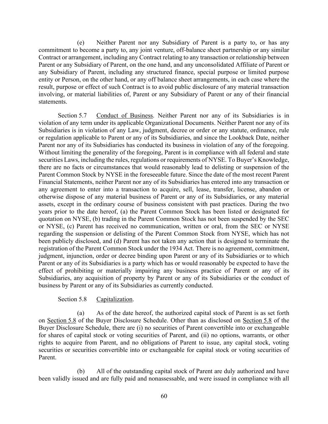 60 (e) Neither Parent nor any Subsidiary of Parent is a party to, or has any commitment to become a party to, any joint venture, off-balance sheet partnership or any similar Contract or arrangement, including any Contract relating to any transaction or relationship between Parent or any Subsidiary of Parent, on the one hand, and any unconsolidated Affiliate of Parent or any Subsidiary of Parent, including any structured finance, special purpose or limited purpose entity or Person, on the other hand, or any off balance sheet arrangements, in each case where the result, purpose or effect of such Contract is to avoid public disclosure of any material transaction involving, or material liabilities of, Parent or any Subsidiary of Parent or any of their financial statements. Section 5.7 Conduct of Business. Neither Parent nor any of its Subsidiaries is in violation of any term under its applicable Organizational Documents. Neither Parent nor any of its Subsidiaries is in violation of any Law, judgment, decree or order or any statute, ordinance, rule or regulation applicable to Parent or any of its Subsidiaries, and since the Lookback Date, neither Parent nor any of its Subsidiaries has conducted its business in violation of any of the foregoing. Without limiting the generality of the foregoing, Parent is in compliance with all federal and state securities Laws, including the rules, regulations or requirements of NYSE. To Buyer’s Knowledge, there are no facts or circumstances that would reasonably lead to delisting or suspension of the Parent Common Stock by NYSE in the foreseeable future. Since the date of the most recent Parent Financial Statements, neither Parent nor any of its Subsidiaries has entered into any transaction or any agreement to enter into a transaction to acquire, sell, lease, transfer, license, abandon or otherwise dispose of any material business of Parent or any of its Subsidiaries, or any material assets, except in the ordinary course of business consistent with past practices. During the two years prior to the date hereof, (a) the Parent Common Stock has been listed or designated for quotation on NYSE, (b) trading in the Parent Common Stock has not been suspended by the SEC or NYSE, (c) Parent has received no communication, written or oral, from the SEC or NYSE regarding the suspension or delisting of the Parent Common Stock from NYSE, which has not been publicly disclosed, and (d) Parent has not taken any action that is designed to terminate the registration of the Parent Common Stock under the 1934 Act. There is no agreement, commitment, judgment, injunction, order or decree binding upon Parent or any of its Subsidiaries or to which Parent or any of its Subsidiaries is a party which has or would reasonably be expected to have the effect of prohibiting or materially impairing any business practice of Parent or any of its Subsidiaries, any acquisition of property by Parent or any of its Subsidiaries or the conduct of business by Parent or any of its Subsidiaries as currently conducted. Section 5.8 Capitalization. (a) As of the date hereof, the authorized capital stock of Parent is as set forth on Section 5.8 of the Buyer Disclosure Schedule. Other than as disclosed on Section 5.8 of the Buyer Disclosure Schedule, there are (i) no securities of Parent convertible into or exchangeable for shares of capital stock or voting securities of Parent, and (ii) no options, warrants, or other rights to acquire from Parent, and no obligations of Parent to issue, any capital stock, voting securities or securities convertible into or exchangeable for capital stock or voting securities of Parent. (b) All of the outstanding capital stock of Parent are duly authorized and have been validly issued and are fully paid and nonassessable, and were issued in compliance with all