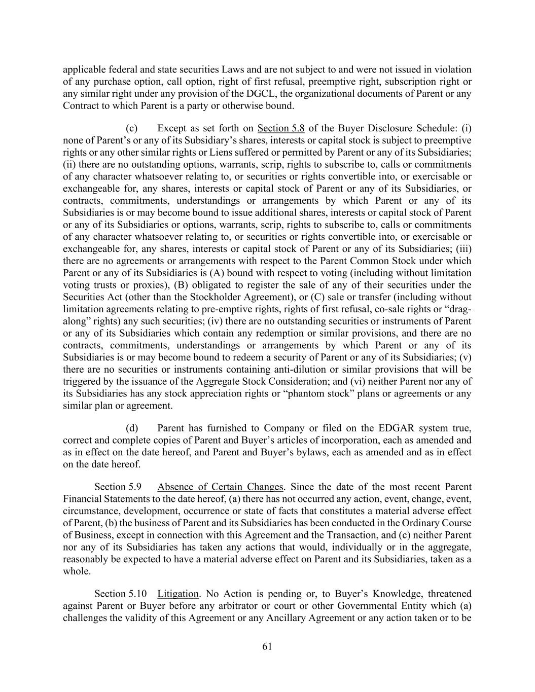 61 applicable federal and state securities Laws and are not subject to and were not issued in violation of any purchase option, call option, right of first refusal, preemptive right, subscription right or any similar right under any provision of the DGCL, the organizational documents of Parent or any Contract to which Parent is a party or otherwise bound. (c) Except as set forth on Section 5.8 of the Buyer Disclosure Schedule: (i) none of Parent’s or any of its Subsidiary’s shares, interests or capital stock is subject to preemptive rights or any other similar rights or Liens suffered or permitted by Parent or any of its Subsidiaries; (ii) there are no outstanding options, warrants, scrip, rights to subscribe to, calls or commitments of any character whatsoever relating to, or securities or rights convertible into, or exercisable or exchangeable for, any shares, interests or capital stock of Parent or any of its Subsidiaries, or contracts, commitments, understandings or arrangements by which Parent or any of its Subsidiaries is or may become bound to issue additional shares, interests or capital stock of Parent or any of its Subsidiaries or options, warrants, scrip, rights to subscribe to, calls or commitments of any character whatsoever relating to, or securities or rights convertible into, or exercisable or exchangeable for, any shares, interests or capital stock of Parent or any of its Subsidiaries; (iii) there are no agreements or arrangements with respect to the Parent Common Stock under which Parent or any of its Subsidiaries is (A) bound with respect to voting (including without limitation voting trusts or proxies), (B) obligated to register the sale of any of their securities under the Securities Act (other than the Stockholder Agreement), or (C) sale or transfer (including without limitation agreements relating to pre-emptive rights, rights of first refusal, co-sale rights or “drag- along” rights) any such securities; (iv) there are no outstanding securities or instruments of Parent or any of its Subsidiaries which contain any redemption or similar provisions, and there are no contracts, commitments, understandings or arrangements by which Parent or any of its Subsidiaries is or may become bound to redeem a security of Parent or any of its Subsidiaries; (v) there are no securities or instruments containing anti-dilution or similar provisions that will be triggered by the issuance of the Aggregate Stock Consideration; and (vi) neither Parent nor any of its Subsidiaries has any stock appreciation rights or “phantom stock” plans or agreements or any similar plan or agreement. (d) Parent has furnished to Company or filed on the EDGAR system true, correct and complete copies of Parent and Buyer’s articles of incorporation, each as amended and as in effect on the date hereof, and Parent and Buyer’s bylaws, each as amended and as in effect on the date hereof. Section 5.9 Absence of Certain Changes. Since the date of the most recent Parent Financial Statements to the date hereof, (a) there has not occurred any action, event, change, event, circumstance, development, occurrence or state of facts that constitutes a material adverse effect of Parent, (b) the business of Parent and its Subsidiaries has been conducted in the Ordinary Course of Business, except in connection with this Agreement and the Transaction, and (c) neither Parent nor any of its Subsidiaries has taken any actions that would, individually or in the aggregate, reasonably be expected to have a material adverse effect on Parent and its Subsidiaries, taken as a whole. Section 5.10 Litigation. No Action is pending or, to Buyer’s Knowledge, threatened against Parent or Buyer before any arbitrator or court or other Governmental Entity which (a) challenges the validity of this Agreement or any Ancillary Agreement or any action taken or to be