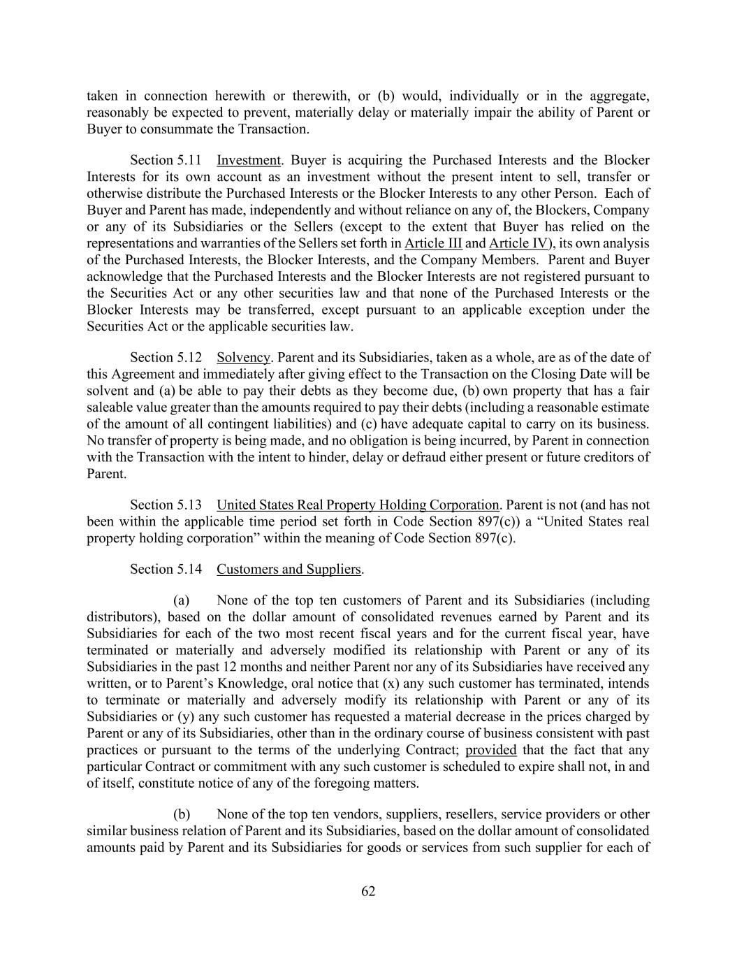 62 taken in connection herewith or therewith, or (b) would, individually or in the aggregate, reasonably be expected to prevent, materially delay or materially impair the ability of Parent or Buyer to consummate the Transaction. Section 5.11 Investment. Buyer is acquiring the Purchased Interests and the Blocker Interests for its own account as an investment without the present intent to sell, transfer or otherwise distribute the Purchased Interests or the Blocker Interests to any other Person. Each of Buyer and Parent has made, independently and without reliance on any of, the Blockers, Company or any of its Subsidiaries or the Sellers (except to the extent that Buyer has relied on the representations and warranties of the Sellers set forth in Article III and Article IV), its own analysis of the Purchased Interests, the Blocker Interests, and the Company Members. Parent and Buyer acknowledge that the Purchased Interests and the Blocker Interests are not registered pursuant to the Securities Act or any other securities law and that none of the Purchased Interests or the Blocker Interests may be transferred, except pursuant to an applicable exception under the Securities Act or the applicable securities law. Section 5.12 Solvency. Parent and its Subsidiaries, taken as a whole, are as of the date of this Agreement and immediately after giving effect to the Transaction on the Closing Date will be solvent and (a) be able to pay their debts as they become due, (b) own property that has a fair saleable value greater than the amounts required to pay their debts (including a reasonable estimate of the amount of all contingent liabilities) and (c) have adequate capital to carry on its business. No transfer of property is being made, and no obligation is being incurred, by Parent in connection with the Transaction with the intent to hinder, delay or defraud either present or future creditors of Parent. Section 5.13 United States Real Property Holding Corporation. Parent is not (and has not been within the applicable time period set forth in Code Section 897(c)) a “United States real property holding corporation” within the meaning of Code Section 897(c). Section 5.14 Customers and Suppliers. (a) None of the top ten customers of Parent and its Subsidiaries (including distributors), based on the dollar amount of consolidated revenues earned by Parent and its Subsidiaries for each of the two most recent fiscal years and for the current fiscal year, have terminated or materially and adversely modified its relationship with Parent or any of its Subsidiaries in the past 12 months and neither Parent nor any of its Subsidiaries have received any written, or to Parent’s Knowledge, oral notice that (x) any such customer has terminated, intends to terminate or materially and adversely modify its relationship with Parent or any of its Subsidiaries or (y) any such customer has requested a material decrease in the prices charged by Parent or any of its Subsidiaries, other than in the ordinary course of business consistent with past practices or pursuant to the terms of the underlying Contract; provided that the fact that any particular Contract or commitment with any such customer is scheduled to expire shall not, in and of itself, constitute notice of any of the foregoing matters. (b) None of the top ten vendors, suppliers, resellers, service providers or other similar business relation of Parent and its Subsidiaries, based on the dollar amount of consolidated amounts paid by Parent and its Subsidiaries for goods or services from such supplier for each of