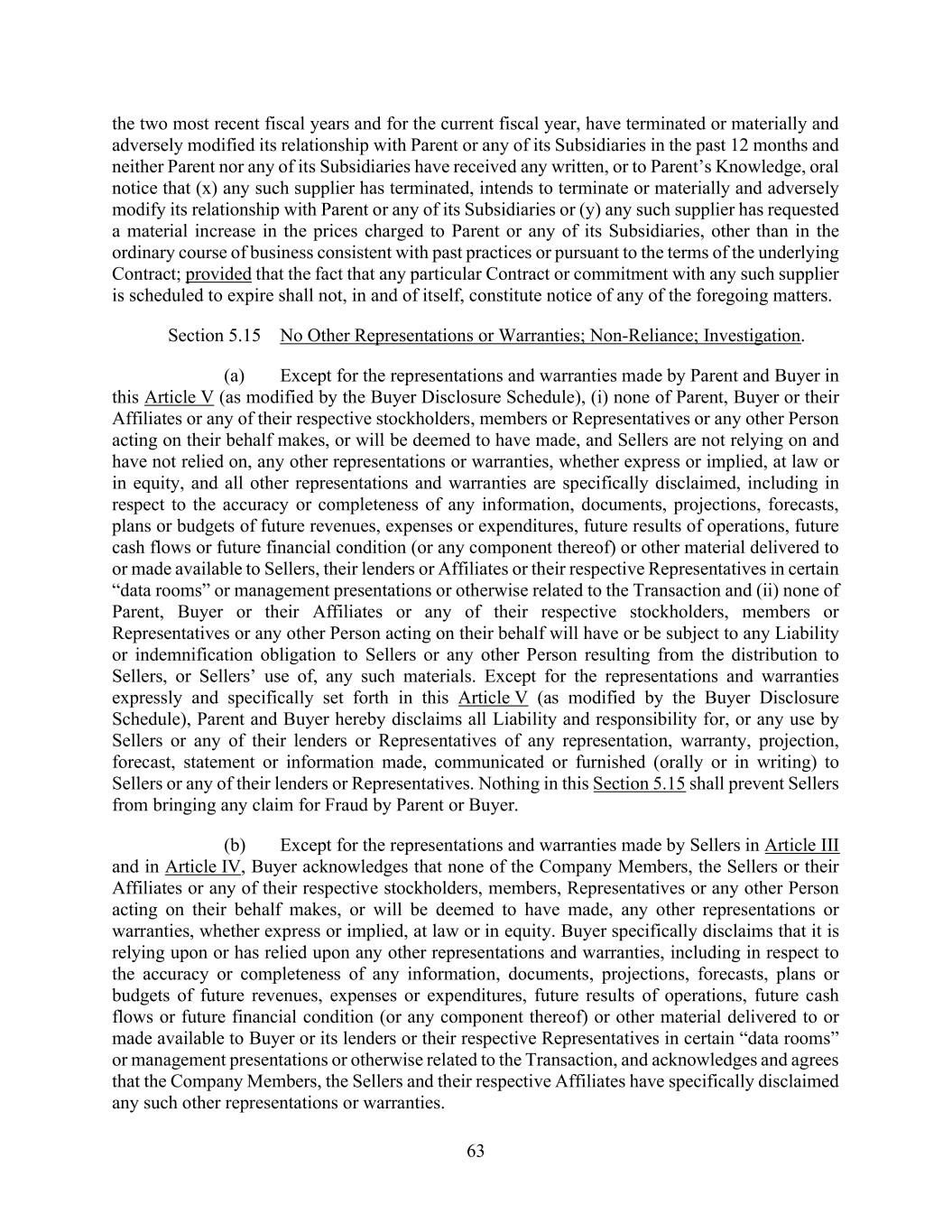 63 the two most recent fiscal years and for the current fiscal year, have terminated or materially and adversely modified its relationship with Parent or any of its Subsidiaries in the past 12 months and neither Parent nor any of its Subsidiaries have received any written, or to Parent’s Knowledge, oral notice that (x) any such supplier has terminated, intends to terminate or materially and adversely modify its relationship with Parent or any of its Subsidiaries or (y) any such supplier has requested a material increase in the prices charged to Parent or any of its Subsidiaries, other than in the ordinary course of business consistent with past practices or pursuant to the terms of the underlying Contract; provided that the fact that any particular Contract or commitment with any such supplier is scheduled to expire shall not, in and of itself, constitute notice of any of the foregoing matters. Section 5.15 No Other Representations or Warranties; Non-Reliance; Investigation. (a) Except for the representations and warranties made by Parent and Buyer in this Article V (as modified by the Buyer Disclosure Schedule), (i) none of Parent, Buyer or their Affiliates or any of their respective stockholders, members or Representatives or any other Person acting on their behalf makes, or will be deemed to have made, and Sellers are not relying on and have not relied on, any other representations or warranties, whether express or implied, at law or in equity, and all other representations and warranties are specifically disclaimed, including in respect to the accuracy or completeness of any information, documents, projections, forecasts, plans or budgets of future revenues, expenses or expenditures, future results of operations, future cash flows or future financial condition (or any component thereof) or other material delivered to or made available to Sellers, their lenders or Affiliates or their respective Representatives in certain “data rooms” or management presentations or otherwise related to the Transaction and (ii) none of Parent, Buyer or their Affiliates or any of their respective stockholders, members or Representatives or any other Person acting on their behalf will have or be subject to any Liability or indemnification obligation to Sellers or any other Person resulting from the distribution to Sellers, or Sellers’ use of, any such materials. Except for the representations and warranties expressly and specifically set forth in this Article V (as modified by the Buyer Disclosure Schedule), Parent and Buyer hereby disclaims all Liability and responsibility for, or any use by Sellers or any of their lenders or Representatives of any representation, warranty, projection, forecast, statement or information made, communicated or furnished (orally or in writing) to Sellers or any of their lenders or Representatives. Nothing in this Section 5.15 shall prevent Sellers from bringing any claim for Fraud by Parent or Buyer. (b) Except for the representations and warranties made by Sellers in Article III and in Article IV, Buyer acknowledges that none of the Company Members, the Sellers or their Affiliates or any of their respective stockholders, members, Representatives or any other Person acting on their behalf makes, or will be deemed to have made, any other representations or warranties, whether express or implied, at law or in equity. Buyer specifically disclaims that it is relying upon or has relied upon any other representations and warranties, including in respect to the accuracy or completeness of any information, documents, projections, forecasts, plans or budgets of future revenues, expenses or expenditures, future results of operations, future cash flows or future financial condition (or any component thereof) or other material delivered to or made available to Buyer or its lenders or their respective Representatives in certain “data rooms” or management presentations or otherwise related to the Transaction, and acknowledges and agrees that the Company Members, the Sellers and their respective Affiliates have specifically disclaimed any such other representations or warranties.
