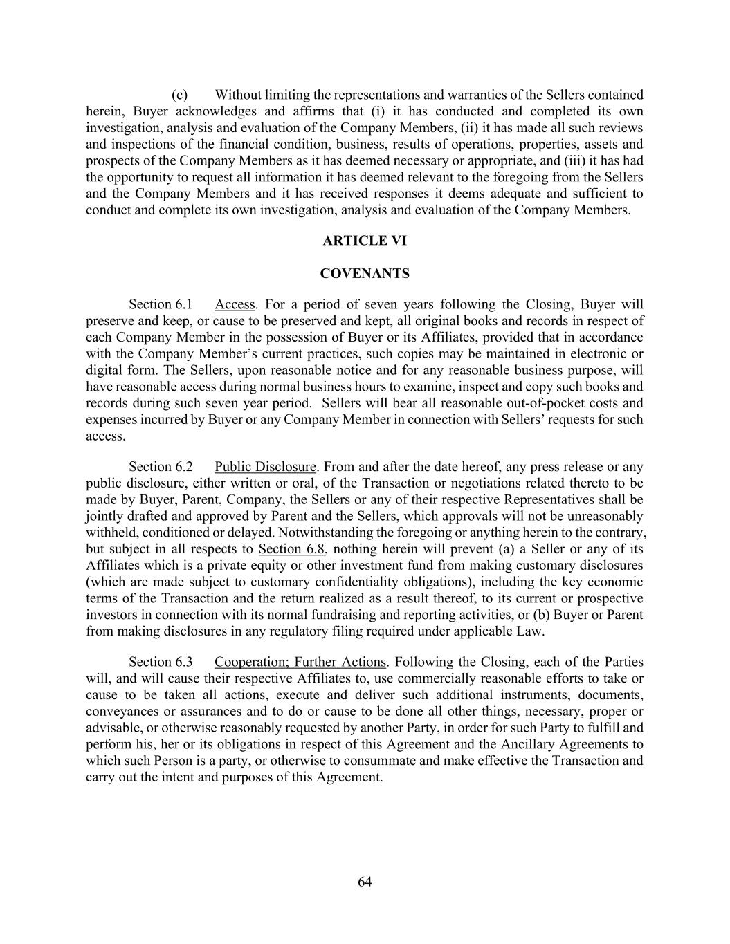 64 (c) Without limiting the representations and warranties of the Sellers contained herein, Buyer acknowledges and affirms that (i) it has conducted and completed its own investigation, analysis and evaluation of the Company Members, (ii) it has made all such reviews and inspections of the financial condition, business, results of operations, properties, assets and prospects of the Company Members as it has deemed necessary or appropriate, and (iii) it has had the opportunity to request all information it has deemed relevant to the foregoing from the Sellers and the Company Members and it has received responses it deems adequate and sufficient to conduct and complete its own investigation, analysis and evaluation of the Company Members. ARTICLE VI COVENANTS Section 6.1 Access. For a period of seven years following the Closing, Buyer will preserve and keep, or cause to be preserved and kept, all original books and records in respect of each Company Member in the possession of Buyer or its Affiliates, provided that in accordance with the Company Member’s current practices, such copies may be maintained in electronic or digital form. The Sellers, upon reasonable notice and for any reasonable business purpose, will have reasonable access during normal business hours to examine, inspect and copy such books and records during such seven year period. Sellers will bear all reasonable out-of-pocket costs and expenses incurred by Buyer or any Company Member in connection with Sellers’ requests for such access. Section 6.2 Public Disclosure. From and after the date hereof, any press release or any public disclosure, either written or oral, of the Transaction or negotiations related thereto to be made by Buyer, Parent, Company, the Sellers or any of their respective Representatives shall be jointly drafted and approved by Parent and the Sellers, which approvals will not be unreasonably withheld, conditioned or delayed. Notwithstanding the foregoing or anything herein to the contrary, but subject in all respects to Section 6.8, nothing herein will prevent (a) a Seller or any of its Affiliates which is a private equity or other investment fund from making customary disclosures (which are made subject to customary confidentiality obligations), including the key economic terms of the Transaction and the return realized as a result thereof, to its current or prospective investors in connection with its normal fundraising and reporting activities, or (b) Buyer or Parent from making disclosures in any regulatory filing required under applicable Law. Section 6.3 Cooperation; Further Actions. Following the Closing, each of the Parties will, and will cause their respective Affiliates to, use commercially reasonable efforts to take or cause to be taken all actions, execute and deliver such additional instruments, documents, conveyances or assurances and to do or cause to be done all other things, necessary, proper or advisable, or otherwise reasonably requested by another Party, in order for such Party to fulfill and perform his, her or its obligations in respect of this Agreement and the Ancillary Agreements to which such Person is a party, or otherwise to consummate and make effective the Transaction and carry out the intent and purposes of this Agreement.