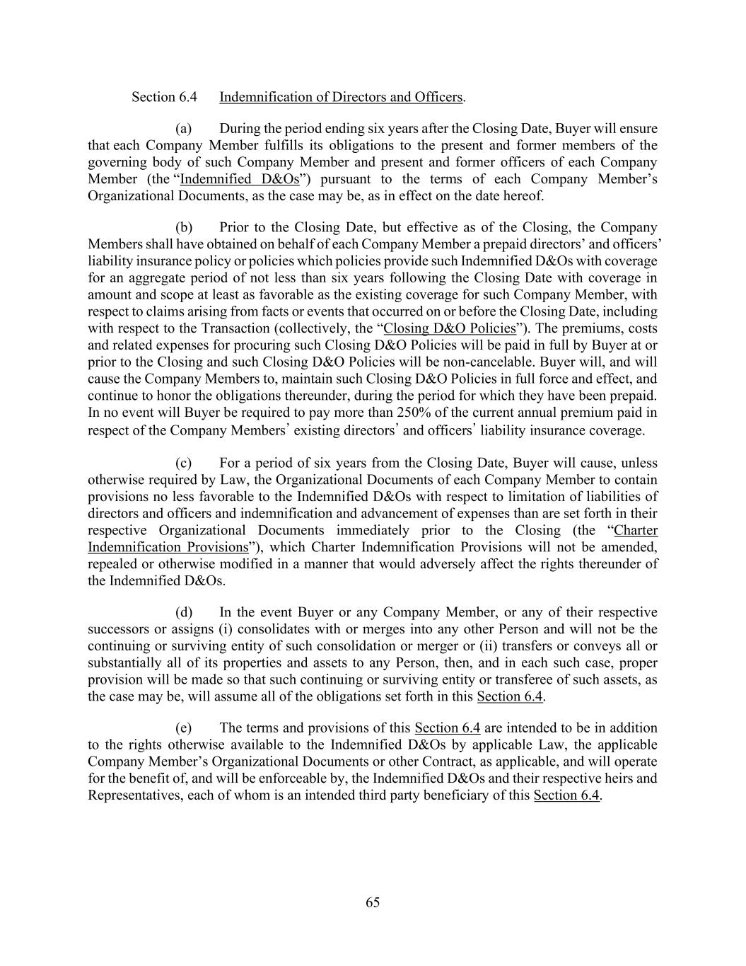 65 Section 6.4 Indemnification of Directors and Officers. (a) During the period ending six years after the Closing Date, Buyer will ensure that each Company Member fulfills its obligations to the present and former members of the governing body of such Company Member and present and former officers of each Company Member (the “Indemnified D&Os”) pursuant to the terms of each Company Member’s Organizational Documents, as the case may be, as in effect on the date hereof. (b) Prior to the Closing Date, but effective as of the Closing, the Company Members shall have obtained on behalf of each Company Member a prepaid directors’ and officers’ liability insurance policy or policies which policies provide such Indemnified D&Os with coverage for an aggregate period of not less than six years following the Closing Date with coverage in amount and scope at least as favorable as the existing coverage for such Company Member, with respect to claims arising from facts or events that occurred on or before the Closing Date, including with respect to the Transaction (collectively, the “Closing D&O Policies”). The premiums, costs and related expenses for procuring such Closing D&O Policies will be paid in full by Buyer at or prior to the Closing and such Closing D&O Policies will be non-cancelable. Buyer will, and will cause the Company Members to, maintain such Closing D&O Policies in full force and effect, and continue to honor the obligations thereunder, during the period for which they have been prepaid. In no event will Buyer be required to pay more than 250% of the current annual premium paid in respect of the Company Members’ existing directors’ and officers’ liability insurance coverage. (c) For a period of six years from the Closing Date, Buyer will cause, unless otherwise required by Law, the Organizational Documents of each Company Member to contain provisions no less favorable to the Indemnified D&Os with respect to limitation of liabilities of directors and officers and indemnification and advancement of expenses than are set forth in their respective Organizational Documents immediately prior to the Closing (the “Charter Indemnification Provisions”), which Charter Indemnification Provisions will not be amended, repealed or otherwise modified in a manner that would adversely affect the rights thereunder of the Indemnified D&Os. (d) In the event Buyer or any Company Member, or any of their respective successors or assigns (i) consolidates with or merges into any other Person and will not be the continuing or surviving entity of such consolidation or merger or (ii) transfers or conveys all or substantially all of its properties and assets to any Person, then, and in each such case, proper provision will be made so that such continuing or surviving entity or transferee of such assets, as the case may be, will assume all of the obligations set forth in this Section 6.4. (e) The terms and provisions of this Section 6.4 are intended to be in addition to the rights otherwise available to the Indemnified D&Os by applicable Law, the applicable Company Member’s Organizational Documents or other Contract, as applicable, and will operate for the benefit of, and will be enforceable by, the Indemnified D&Os and their respective heirs and Representatives, each of whom is an intended third party beneficiary of this Section 6.4.