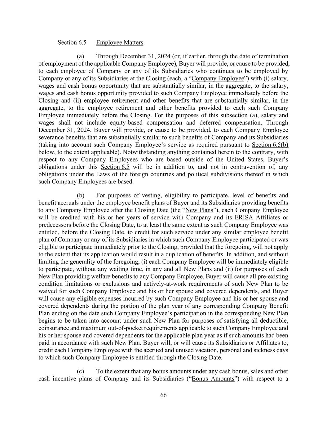 66 Section 6.5 Employee Matters. (a) Through December 31, 2024 (or, if earlier, through the date of termination of employment of the applicable Company Employee), Buyer will provide, or cause to be provided, to each employee of Company or any of its Subsidiaries who continues to be employed by Company or any of its Subsidiaries at the Closing (each, a “Company Employee”) with (i) salary, wages and cash bonus opportunity that are substantially similar, in the aggregate, to the salary, wages and cash bonus opportunity provided to such Company Employee immediately before the Closing and (ii) employee retirement and other benefits that are substantially similar, in the aggregate, to the employee retirement and other benefits provided to each such Company Employee immediately before the Closing. For the purposes of this subsection (a), salary and wages shall not include equity-based compensation and deferred compensation. Through December 31, 2024, Buyer will provide, or cause to be provided, to each Company Employee severance benefits that are substantially similar to such benefits of Company and its Subsidiaries (taking into account such Company Employee’s service as required pursuant to Section 6.5(b) below, to the extent applicable). Notwithstanding anything contained herein to the contrary, with respect to any Company Employees who are based outside of the United States, Buyer’s obligations under this Section 6.5 will be in addition to, and not in contravention of, any obligations under the Laws of the foreign countries and political subdivisions thereof in which such Company Employees are based. (b) For purposes of vesting, eligibility to participate, level of benefits and benefit accruals under the employee benefit plans of Buyer and its Subsidiaries providing benefits to any Company Employee after the Closing Date (the “New Plans”), each Company Employee will be credited with his or her years of service with Company and its ERISA Affiliates or predecessors before the Closing Date, to at least the same extent as such Company Employee was entitled, before the Closing Date, to credit for such service under any similar employee benefit plan of Company or any of its Subsidiaries in which such Company Employee participated or was eligible to participate immediately prior to the Closing, provided that the foregoing, will not apply to the extent that its application would result in a duplication of benefits. In addition, and without limiting the generality of the foregoing, (i) each Company Employee will be immediately eligible to participate, without any waiting time, in any and all New Plans and (ii) for purposes of each New Plan providing welfare benefits to any Company Employee, Buyer will cause all pre-existing condition limitations or exclusions and actively-at-work requirements of such New Plan to be waived for such Company Employee and his or her spouse and covered dependents, and Buyer will cause any eligible expenses incurred by such Company Employee and his or her spouse and covered dependents during the portion of the plan year of any corresponding Company Benefit Plan ending on the date such Company Employee’s participation in the corresponding New Plan begins to be taken into account under such New Plan for purposes of satisfying all deductible, coinsurance and maximum out-of-pocket requirements applicable to such Company Employee and his or her spouse and covered dependents for the applicable plan year as if such amounts had been paid in accordance with such New Plan. Buyer will, or will cause its Subsidiaries or Affiliates to, credit each Company Employee with the accrued and unused vacation, personal and sickness days to which such Company Employee is entitled through the Closing Date. (c) To the extent that any bonus amounts under any cash bonus, sales and other cash incentive plans of Company and its Subsidiaries (“Bonus Amounts”) with respect to a