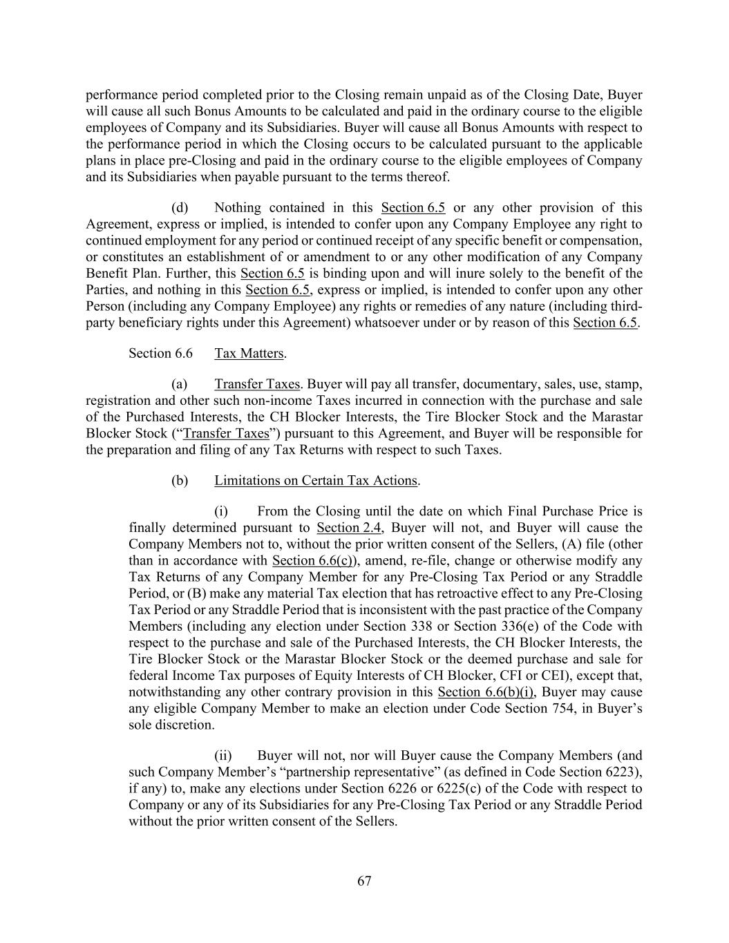 67 performance period completed prior to the Closing remain unpaid as of the Closing Date, Buyer will cause all such Bonus Amounts to be calculated and paid in the ordinary course to the eligible employees of Company and its Subsidiaries. Buyer will cause all Bonus Amounts with respect to the performance period in which the Closing occurs to be calculated pursuant to the applicable plans in place pre-Closing and paid in the ordinary course to the eligible employees of Company and its Subsidiaries when payable pursuant to the terms thereof. (d) Nothing contained in this Section 6.5 or any other provision of this Agreement, express or implied, is intended to confer upon any Company Employee any right to continued employment for any period or continued receipt of any specific benefit or compensation, or constitutes an establishment of or amendment to or any other modification of any Company Benefit Plan. Further, this Section 6.5 is binding upon and will inure solely to the benefit of the Parties, and nothing in this Section 6.5, express or implied, is intended to confer upon any other Person (including any Company Employee) any rights or remedies of any nature (including third- party beneficiary rights under this Agreement) whatsoever under or by reason of this Section 6.5. Section 6.6 Tax Matters. (a) Transfer Taxes. Buyer will pay all transfer, documentary, sales, use, stamp, registration and other such non-income Taxes incurred in connection with the purchase and sale of the Purchased Interests, the CH Blocker Interests, the Tire Blocker Stock and the Marastar Blocker Stock (“Transfer Taxes”) pursuant to this Agreement, and Buyer will be responsible for the preparation and filing of any Tax Returns with respect to such Taxes. (b) Limitations on Certain Tax Actions. (i) From the Closing until the date on which Final Purchase Price is finally determined pursuant to Section 2.4, Buyer will not, and Buyer will cause the Company Members not to, without the prior written consent of the Sellers, (A) file (other than in accordance with Section 6.6(c)), amend, re-file, change or otherwise modify any Tax Returns of any Company Member for any Pre-Closing Tax Period or any Straddle Period, or (B) make any material Tax election that has retroactive effect to any Pre-Closing Tax Period or any Straddle Period that is inconsistent with the past practice of the Company Members (including any election under Section 338 or Section 336(e) of the Code with respect to the purchase and sale of the Purchased Interests, the CH Blocker Interests, the Tire Blocker Stock or the Marastar Blocker Stock or the deemed purchase and sale for federal Income Tax purposes of Equity Interests of CH Blocker, CFI or CEI), except that, notwithstanding any other contrary provision in this Section 6.6(b)(i), Buyer may cause any eligible Company Member to make an election under Code Section 754, in Buyer’s sole discretion. (ii) Buyer will not, nor will Buyer cause the Company Members (and such Company Member’s “partnership representative” (as defined in Code Section 6223), if any) to, make any elections under Section 6226 or 6225(c) of the Code with respect to Company or any of its Subsidiaries for any Pre-Closing Tax Period or any Straddle Period without the prior written consent of the Sellers.