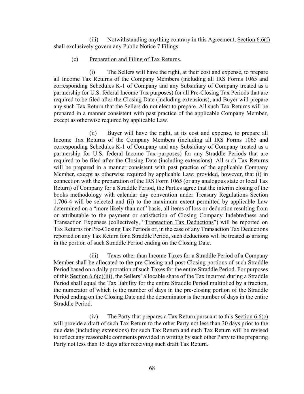 68 (iii) Notwithstanding anything contrary in this Agreement, Section 6.6(f) shall exclusively govern any Public Notice 7 Filings. (c) Preparation and Filing of Tax Returns. (i) The Sellers will have the right, at their cost and expense, to prepare all Income Tax Returns of the Company Members (including all IRS Forms 1065 and corresponding Schedules K-1 of Company and any Subsidiary of Company treated as a partnership for U.S. federal Income Tax purposes) for all Pre-Closing Tax Periods that are required to be filed after the Closing Date (including extensions), and Buyer will prepare any such Tax Return that the Sellers do not elect to prepare. All such Tax Returns will be prepared in a manner consistent with past practice of the applicable Company Member, except as otherwise required by applicable Law. (ii) Buyer will have the right, at its cost and expense, to prepare all Income Tax Returns of the Company Members (including all IRS Forms 1065 and corresponding Schedules K-1 of Company and any Subsidiary of Company treated as a partnership for U.S. federal Income Tax purposes) for any Straddle Periods that are required to be filed after the Closing Date (including extensions). All such Tax Returns will be prepared in a manner consistent with past practice of the applicable Company Member, except as otherwise required by applicable Law; provided, however, that (i) in connection with the preparation of the IRS Form 1065 (or any analogous state or local Tax Return) of Company for a Straddle Period, the Parties agree that the interim closing of the books methodology with calendar day convention under Treasury Regulations Section 1.706-4 will be selected and (ii) to the maximum extent permitted by applicable Law determined on a “more likely than not” basis, all items of loss or deduction resulting from or attributable to the payment or satisfaction of Closing Company Indebtedness and Transaction Expenses (collectively, “Transaction Tax Deductions”) will be reported on Tax Returns for Pre-Closing Tax Periods or, in the case of any Transaction Tax Deductions reported on any Tax Return for a Straddle Period, such deductions will be treated as arising in the portion of such Straddle Period ending on the Closing Date. (iii) Taxes other than Income Taxes for a Straddle Period of a Company Member shall be allocated to the pre-Closing and post-Closing portions of such Straddle Period based on a daily proration of such Taxes for the entire Straddle Period. For purposes of this Section 6.6(c)(iii), the Sellers’ allocable share of the Tax incurred during a Straddle Period shall equal the Tax liability for the entire Straddle Period multiplied by a fraction, the numerator of which is the number of days in the pre-closing portion of the Straddle Period ending on the Closing Date and the denominator is the number of days in the entire Straddle Period. (iv) The Party that prepares a Tax Return pursuant to this Section 6.6(c) will provide a draft of such Tax Return to the other Party not less than 30 days prior to the due date (including extensions) for such Tax Return and such Tax Return will be revised to reflect any reasonable comments provided in writing by such other Party to the preparing Party not less than 15 days after receiving such draft Tax Return.