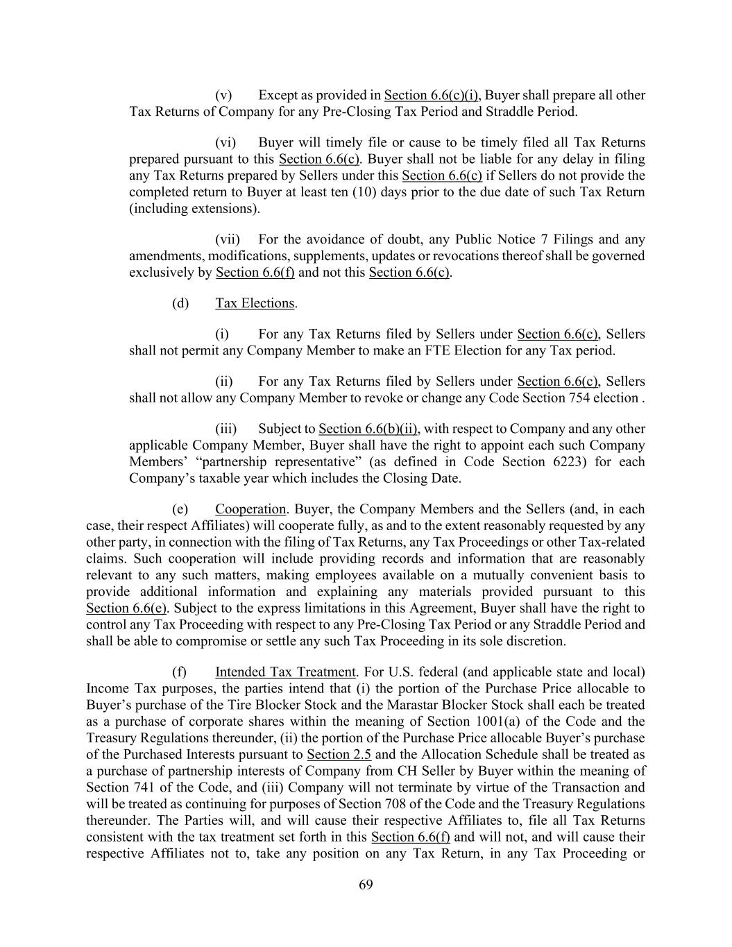 69 (v) Except as provided in Section 6.6(c)(i), Buyer shall prepare all other Tax Returns of Company for any Pre-Closing Tax Period and Straddle Period. (vi) Buyer will timely file or cause to be timely filed all Tax Returns prepared pursuant to this Section 6.6(c). Buyer shall not be liable for any delay in filing any Tax Returns prepared by Sellers under this Section 6.6(c) if Sellers do not provide the completed return to Buyer at least ten (10) days prior to the due date of such Tax Return (including extensions). (vii) For the avoidance of doubt, any Public Notice 7 Filings and any amendments, modifications, supplements, updates or revocations thereof shall be governed exclusively by Section 6.6(f) and not this Section 6.6(c). (d) Tax Elections. (i) For any Tax Returns filed by Sellers under Section 6.6(c), Sellers shall not permit any Company Member to make an FTE Election for any Tax period. (ii) For any Tax Returns filed by Sellers under Section 6.6(c), Sellers shall not allow any Company Member to revoke or change any Code Section 754 election . (iii) Subject to Section 6.6(b)(ii), with respect to Company and any other applicable Company Member, Buyer shall have the right to appoint each such Company Members’ “partnership representative” (as defined in Code Section 6223) for each Company’s taxable year which includes the Closing Date. (e) Cooperation. Buyer, the Company Members and the Sellers (and, in each case, their respect Affiliates) will cooperate fully, as and to the extent reasonably requested by any other party, in connection with the filing of Tax Returns, any Tax Proceedings or other Tax-related claims. Such cooperation will include providing records and information that are reasonably relevant to any such matters, making employees available on a mutually convenient basis to provide additional information and explaining any materials provided pursuant to this Section 6.6(e). Subject to the express limitations in this Agreement, Buyer shall have the right to control any Tax Proceeding with respect to any Pre-Closing Tax Period or any Straddle Period and shall be able to compromise or settle any such Tax Proceeding in its sole discretion. (f) Intended Tax Treatment. For U.S. federal (and applicable state and local) Income Tax purposes, the parties intend that (i) the portion of the Purchase Price allocable to Buyer’s purchase of the Tire Blocker Stock and the Marastar Blocker Stock shall each be treated as a purchase of corporate shares within the meaning of Section 1001(a) of the Code and the Treasury Regulations thereunder, (ii) the portion of the Purchase Price allocable Buyer’s purchase of the Purchased Interests pursuant to Section 2.5 and the Allocation Schedule shall be treated as a purchase of partnership interests of Company from CH Seller by Buyer within the meaning of Section 741 of the Code, and (iii) Company will not terminate by virtue of the Transaction and will be treated as continuing for purposes of Section 708 of the Code and the Treasury Regulations thereunder. The Parties will, and will cause their respective Affiliates to, file all Tax Returns consistent with the tax treatment set forth in this Section 6.6(f) and will not, and will cause their respective Affiliates not to, take any position on any Tax Return, in any Tax Proceeding or