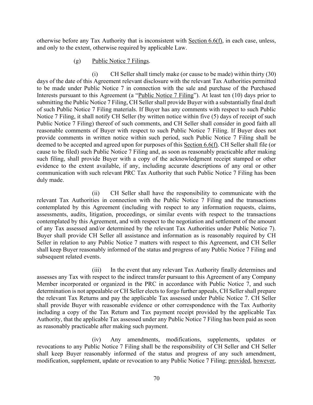 70 otherwise before any Tax Authority that is inconsistent with Section 6.6(f), in each case, unless, and only to the extent, otherwise required by applicable Law. (g) Public Notice 7 Filings. (i) CH Seller shall timely make (or cause to be made) within thirty (30) days of the date of this Agreement relevant disclosure with the relevant Tax Authorities permitted to be made under Public Notice 7 in connection with the sale and purchase of the Purchased Interests pursuant to this Agreement (a “Public Notice 7 Filing”). At least ten (10) days prior to submitting the Public Notice 7 Filing, CH Seller shall provide Buyer with a substantially final draft of such Public Notice 7 Filing materials. If Buyer has any comments with respect to such Public Notice 7 Filing, it shall notify CH Seller (by written notice within five (5) days of receipt of such Public Notice 7 Filing) thereof of such comments, and CH Seller shall consider in good faith all reasonable comments of Buyer with respect to such Public Notice 7 Filing. If Buyer does not provide comments in written notice within such period, such Public Notice 7 Filing shall be deemed to be accepted and agreed upon for purposes of this Section 6.6(f). CH Seller shall file (or cause to be filed) such Public Notice 7 Filing and, as soon as reasonably practicable after making such filing, shall provide Buyer with a copy of the acknowledgment receipt stamped or other evidence to the extent available, if any, including accurate descriptions of any oral or other communication with such relevant PRC Tax Authority that such Public Notice 7 Filing has been duly made. (ii) CH Seller shall have the responsibility to communicate with the relevant Tax Authorities in connection with the Public Notice 7 Filing and the transactions contemplated by this Agreement (including with respect to any information requests, claims, assessments, audits, litigation, proceedings, or similar events with respect to the transactions contemplated by this Agreement, and with respect to the negotiation and settlement of the amount of any Tax assessed and/or determined by the relevant Tax Authorities under Public Notice 7). Buyer shall provide CH Seller all assistance and information as is reasonably required by CH Seller in relation to any Public Notice 7 matters with respect to this Agreement, and CH Seller shall keep Buyer reasonably informed of the status and progress of any Public Notice 7 Filing and subsequent related events. (iii) In the event that any relevant Tax Authority finally determines and assesses any Tax with respect to the indirect transfer pursuant to this Agreement of any Company Member incorporated or organized in the PRC in accordance with Public Notice 7, and such determination is not appealable or CH Seller elects to forgo further appeals, CH Seller shall prepare the relevant Tax Returns and pay the applicable Tax assessed under Public Notice 7. CH Seller shall provide Buyer with reasonable evidence or other correspondence with the Tax Authority including a copy of the Tax Return and Tax payment receipt provided by the applicable Tax Authority, that the applicable Tax assessed under any Public Notice 7 Filing has been paid as soon as reasonably practicable after making such payment. (iv) Any amendments, modifications, supplements, updates or revocations to any Public Notice 7 Filing shall be the responsibility of CH Seller and CH Seller shall keep Buyer reasonably informed of the status and progress of any such amendment, modification, supplement, update or revocation to any Public Notice 7 Filing; provided, however,
