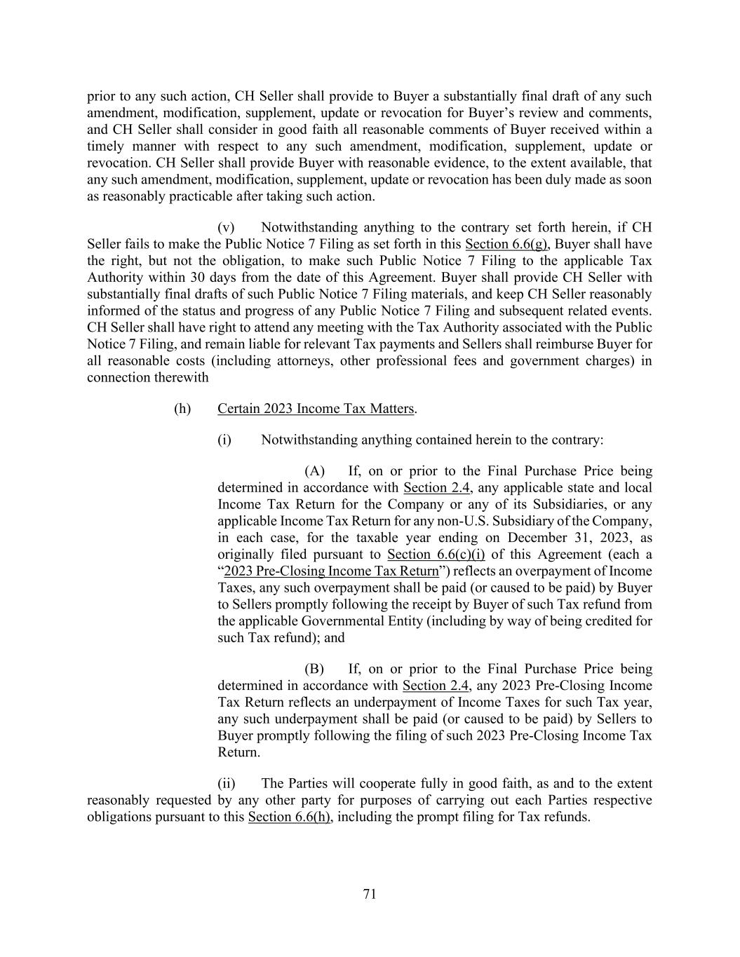 71 prior to any such action, CH Seller shall provide to Buyer a substantially final draft of any such amendment, modification, supplement, update or revocation for Buyer’s review and comments, and CH Seller shall consider in good faith all reasonable comments of Buyer received within a timely manner with respect to any such amendment, modification, supplement, update or revocation. CH Seller shall provide Buyer with reasonable evidence, to the extent available, that any such amendment, modification, supplement, update or revocation has been duly made as soon as reasonably practicable after taking such action. (v) Notwithstanding anything to the contrary set forth herein, if CH Seller fails to make the Public Notice 7 Filing as set forth in this Section 6.6(g), Buyer shall have the right, but not the obligation, to make such Public Notice 7 Filing to the applicable Tax Authority within 30 days from the date of this Agreement. Buyer shall provide CH Seller with substantially final drafts of such Public Notice 7 Filing materials, and keep CH Seller reasonably informed of the status and progress of any Public Notice 7 Filing and subsequent related events. CH Seller shall have right to attend any meeting with the Tax Authority associated with the Public Notice 7 Filing, and remain liable for relevant Tax payments and Sellers shall reimburse Buyer for all reasonable costs (including attorneys, other professional fees and government charges) in connection therewith (h) Certain 2023 Income Tax Matters. (i) Notwithstanding anything contained herein to the contrary: (A) If, on or prior to the Final Purchase Price being determined in accordance with Section 2.4, any applicable state and local Income Tax Return for the Company or any of its Subsidiaries, or any applicable Income Tax Return for any non-U.S. Subsidiary of the Company, in each case, for the taxable year ending on December 31, 2023, as originally filed pursuant to Section 6.6(c)(i) of this Agreement (each a “2023 Pre-Closing Income Tax Return”) reflects an overpayment of Income Taxes, any such overpayment shall be paid (or caused to be paid) by Buyer to Sellers promptly following the receipt by Buyer of such Tax refund from the applicable Governmental Entity (including by way of being credited for such Tax refund); and (B) If, on or prior to the Final Purchase Price being determined in accordance with Section 2.4, any 2023 Pre-Closing Income Tax Return reflects an underpayment of Income Taxes for such Tax year, any such underpayment shall be paid (or caused to be paid) by Sellers to Buyer promptly following the filing of such 2023 Pre-Closing Income Tax Return. (ii) The Parties will cooperate fully in good faith, as and to the extent reasonably requested by any other party for purposes of carrying out each Parties respective obligations pursuant to this Section 6.6(h), including the prompt filing for Tax refunds.