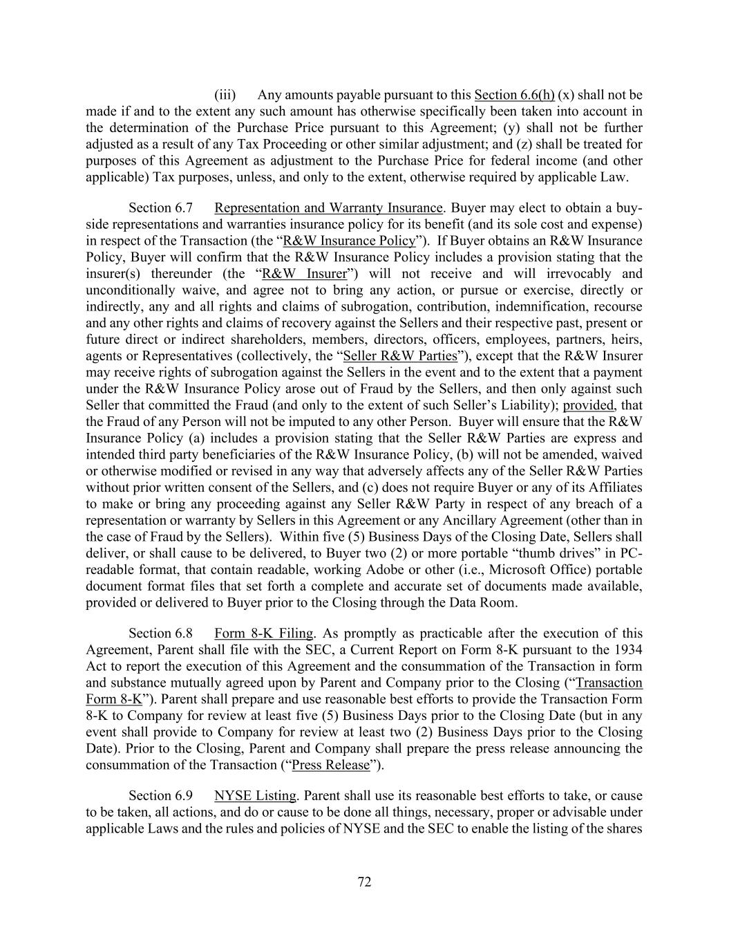 72 (iii) Any amounts payable pursuant to this Section 6.6(h) (x) shall not be made if and to the extent any such amount has otherwise specifically been taken into account in the determination of the Purchase Price pursuant to this Agreement; (y) shall not be further adjusted as a result of any Tax Proceeding or other similar adjustment; and (z) shall be treated for purposes of this Agreement as adjustment to the Purchase Price for federal income (and other applicable) Tax purposes, unless, and only to the extent, otherwise required by applicable Law. Section 6.7 Representation and Warranty Insurance. Buyer may elect to obtain a buy- side representations and warranties insurance policy for its benefit (and its sole cost and expense) in respect of the Transaction (the “R&W Insurance Policy”). If Buyer obtains an R&W Insurance Policy, Buyer will confirm that the R&W Insurance Policy includes a provision stating that the insurer(s) thereunder (the “R&W Insurer”) will not receive and will irrevocably and unconditionally waive, and agree not to bring any action, or pursue or exercise, directly or indirectly, any and all rights and claims of subrogation, contribution, indemnification, recourse and any other rights and claims of recovery against the Sellers and their respective past, present or future direct or indirect shareholders, members, directors, officers, employees, partners, heirs, agents or Representatives (collectively, the “Seller R&W Parties”), except that the R&W Insurer may receive rights of subrogation against the Sellers in the event and to the extent that a payment under the R&W Insurance Policy arose out of Fraud by the Sellers, and then only against such Seller that committed the Fraud (and only to the extent of such Seller’s Liability); provided, that the Fraud of any Person will not be imputed to any other Person. Buyer will ensure that the R&W Insurance Policy (a) includes a provision stating that the Seller R&W Parties are express and intended third party beneficiaries of the R&W Insurance Policy, (b) will not be amended, waived or otherwise modified or revised in any way that adversely affects any of the Seller R&W Parties without prior written consent of the Sellers, and (c) does not require Buyer or any of its Affiliates to make or bring any proceeding against any Seller R&W Party in respect of any breach of a representation or warranty by Sellers in this Agreement or any Ancillary Agreement (other than in the case of Fraud by the Sellers). Within five (5) Business Days of the Closing Date, Sellers shall deliver, or shall cause to be delivered, to Buyer two (2) or more portable “thumb drives” in PC- readable format, that contain readable, working Adobe or other (i.e., Microsoft Office) portable document format files that set forth a complete and accurate set of documents made available, provided or delivered to Buyer prior to the Closing through the Data Room. Section 6.8 Form 8-K Filing. As promptly as practicable after the execution of this Agreement, Parent shall file with the SEC, a Current Report on Form 8-K pursuant to the 1934 Act to report the execution of this Agreement and the consummation of the Transaction in form and substance mutually agreed upon by Parent and Company prior to the Closing (“Transaction Form 8-K”). Parent shall prepare and use reasonable best efforts to provide the Transaction Form 8-K to Company for review at least five (5) Business Days prior to the Closing Date (but in any event shall provide to Company for review at least two (2) Business Days prior to the Closing Date). Prior to the Closing, Parent and Company shall prepare the press release announcing the consummation of the Transaction (“Press Release”). Section 6.9 NYSE Listing. Parent shall use its reasonable best efforts to take, or cause to be taken, all actions, and do or cause to be done all things, necessary, proper or advisable under applicable Laws and the rules and policies of NYSE and the SEC to enable the listing of the shares