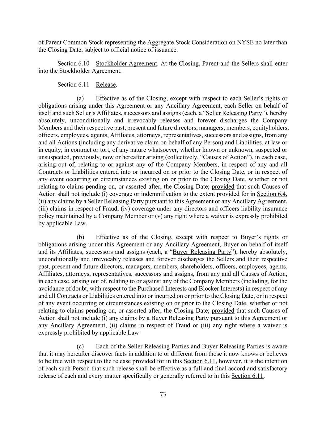 73 of Parent Common Stock representing the Aggregate Stock Consideration on NYSE no later than the Closing Date, subject to official notice of issuance. Section 6.10 Stockholder Agreement. At the Closing, Parent and the Sellers shall enter into the Stockholder Agreement. Section 6.11 Release. (a) Effective as of the Closing, except with respect to each Seller’s rights or obligations arising under this Agreement or any Ancillary Agreement, each Seller on behalf of itself and such Seller’s Affiliates, successors and assigns (each, a “Seller Releasing Party”), hereby absolutely, unconditionally and irrevocably releases and forever discharges the Company Members and their respective past, present and future directors, managers, members, equityholders, officers, employees, agents, Affiliates, attorneys, representatives, successors and assigns, from any and all Actions (including any derivative claim on behalf of any Person) and Liabilities, at law or in equity, in contract or tort, of any nature whatsoever, whether known or unknown, suspected or unsuspected, previously, now or hereafter arising (collectively, “Causes of Action”), in each case, arising out of, relating to or against any of the Company Members, in respect of any and all Contracts or Liabilities entered into or incurred on or prior to the Closing Date, or in respect of any event occurring or circumstances existing on or prior to the Closing Date, whether or not relating to claims pending on, or asserted after, the Closing Date; provided that such Causes of Action shall not include (i) coverage or indemnification to the extent provided for in Section 6.4, (ii) any claims by a Seller Releasing Party pursuant to this Agreement or any Ancillary Agreement, (iii) claims in respect of Fraud, (iv) coverage under any directors and officers liability insurance policy maintained by a Company Member or (v) any right where a waiver is expressly prohibited by applicable Law. (b) Effective as of the Closing, except with respect to Buyer’s rights or obligations arising under this Agreement or any Ancillary Agreement, Buyer on behalf of itself and its Affiliates, successors and assigns (each, a “Buyer Releasing Party”), hereby absolutely, unconditionally and irrevocably releases and forever discharges the Sellers and their respective past, present and future directors, managers, members, shareholders, officers, employees, agents, Affiliates, attorneys, representatives, successors and assigns, from any and all Causes of Action, in each case, arising out of, relating to or against any of the Company Members (including, for the avoidance of doubt, with respect to the Purchased Interests and Blocker Interests) in respect of any and all Contracts or Liabilities entered into or incurred on or prior to the Closing Date, or in respect of any event occurring or circumstances existing on or prior to the Closing Date, whether or not relating to claims pending on, or asserted after, the Closing Date; provided that such Causes of Action shall not include (i) any claims by a Buyer Releasing Party pursuant to this Agreement or any Ancillary Agreement, (ii) claims in respect of Fraud or (iii) any right where a waiver is expressly prohibited by applicable Law (c) Each of the Seller Releasing Parties and Buyer Releasing Parties is aware that it may hereafter discover facts in addition to or different from those it now knows or believes to be true with respect to the release provided for in this Section 6.11, however, it is the intention of each such Person that such release shall be effective as a full and final accord and satisfactory release of each and every matter specifically or generally referred to in this Section 6.11.
