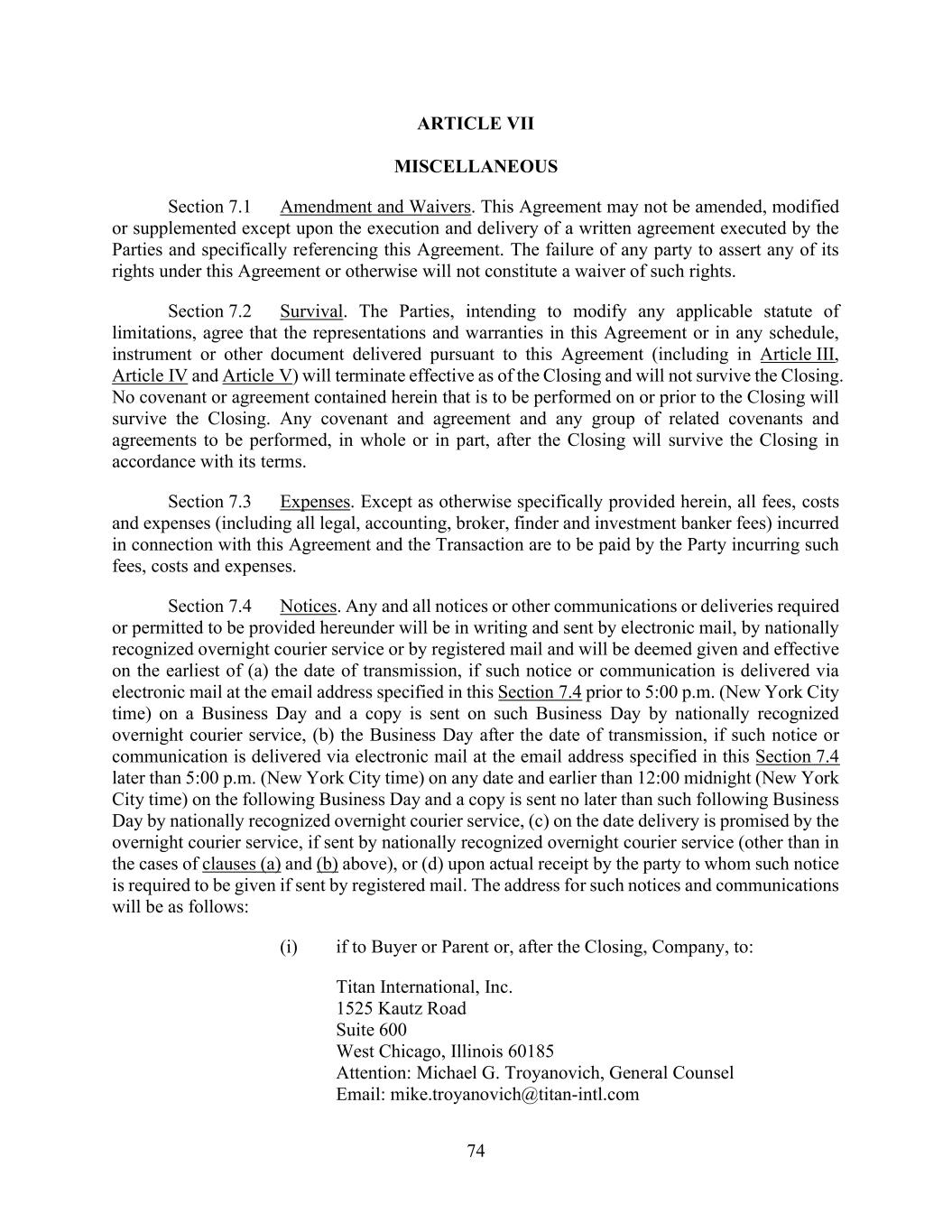 74 ARTICLE VII MISCELLANEOUS Section 7.1 Amendment and Waivers. This Agreement may not be amended, modified or supplemented except upon the execution and delivery of a written agreement executed by the Parties and specifically referencing this Agreement. The failure of any party to assert any of its rights under this Agreement or otherwise will not constitute a waiver of such rights. Section 7.2 Survival. The Parties, intending to modify any applicable statute of limitations, agree that the representations and warranties in this Agreement or in any schedule, instrument or other document delivered pursuant to this Agreement (including in Article III, Article IV and Article V) will terminate effective as of the Closing and will not survive the Closing. No covenant or agreement contained herein that is to be performed on or prior to the Closing will survive the Closing. Any covenant and agreement and any group of related covenants and agreements to be performed, in whole or in part, after the Closing will survive the Closing in accordance with its terms. Section 7.3 Expenses. Except as otherwise specifically provided herein, all fees, costs and expenses (including all legal, accounting, broker, finder and investment banker fees) incurred in connection with this Agreement and the Transaction are to be paid by the Party incurring such fees, costs and expenses. Section 7.4 Notices. Any and all notices or other communications or deliveries required or permitted to be provided hereunder will be in writing and sent by electronic mail, by nationally recognized overnight courier service or by registered mail and will be deemed given and effective on the earliest of (a) the date of transmission, if such notice or communication is delivered via electronic mail at the email address specified in this Section 7.4 prior to 5:00 p.m. (New York City time) on a Business Day and a copy is sent on such Business Day by nationally recognized overnight courier service, (b) the Business Day after the date of transmission, if such notice or communication is delivered via electronic mail at the email address specified in this Section 7.4 later than 5:00 p.m. (New York City time) on any date and earlier than 12:00 midnight (New York City time) on the following Business Day and a copy is sent no later than such following Business Day by nationally recognized overnight courier service, (c) on the date delivery is promised by the overnight courier service, if sent by nationally recognized overnight courier service (other than in the cases of clauses (a) and (b) above), or (d) upon actual receipt by the party to whom such notice is required to be given if sent by registered mail. The address for such notices and communications will be as follows: (i) if to Buyer or Parent or, after the Closing, Company, to: Titan International, Inc. 1525 Kautz Road Suite 600 West Chicago, Illinois 60185 Attention: Michael G. Troyanovich, General Counsel Email: mike.troyanovich@titan-intl.com