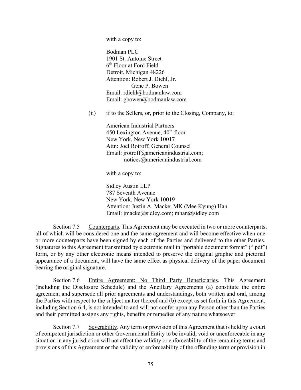 75 with a copy to: Bodman PLC 1901 St. Antoine Street 6th Floor at Ford Field Detroit, Michigan 48226 Attention: Robert J. Diehl, Jr. Gene P. Bowen Email: rdiehl@bodmanlaw.com Email: gbowen@bodmanlaw.com (ii) if to the Sellers, or, prior to the Closing, Company, to: American Industrial Partners 450 Lexington Avenue, 40th floor New York, New York 10017 Attn: Joel Rotroff; General Counsel Email: jrotroff@americanindustrial.com; notices@americanindustrial.com with a copy to: Sidley Austin LLP 787 Seventh Avenue New York, New York 10019 Attention: Justin A. Macke; MK (Mee Kyung) Han Email: jmacke@sidley.com; mhan@sidley.com Section 7.5 Counterparts. This Agreement may be executed in two or more counterparts, all of which will be considered one and the same agreement and will become effective when one or more counterparts have been signed by each of the Parties and delivered to the other Parties. Signatures to this Agreement transmitted by electronic mail in “portable document format” (“.pdf”) form, or by any other electronic means intended to preserve the original graphic and pictorial appearance of a document, will have the same effect as physical delivery of the paper document bearing the original signature. Section 7.6 Entire Agreement; No Third Party Beneficiaries. This Agreement (including the Disclosure Schedule) and the Ancillary Agreements (a) constitute the entire agreement and supersede all prior agreements and understandings, both written and oral, among the Parties with respect to the subject matter thereof and (b) except as set forth in this Agreement, including Section 6.4, is not intended to and will not confer upon any Person other than the Parties and their permitted assigns any rights, benefits or remedies of any nature whatsoever. Section 7.7 Severability. Any term or provision of this Agreement that is held by a court of competent jurisdiction or other Governmental Entity to be invalid, void or unenforceable in any situation in any jurisdiction will not affect the validity or enforceability of the remaining terms and provisions of this Agreement or the validity or enforceability of the offending term or provision in