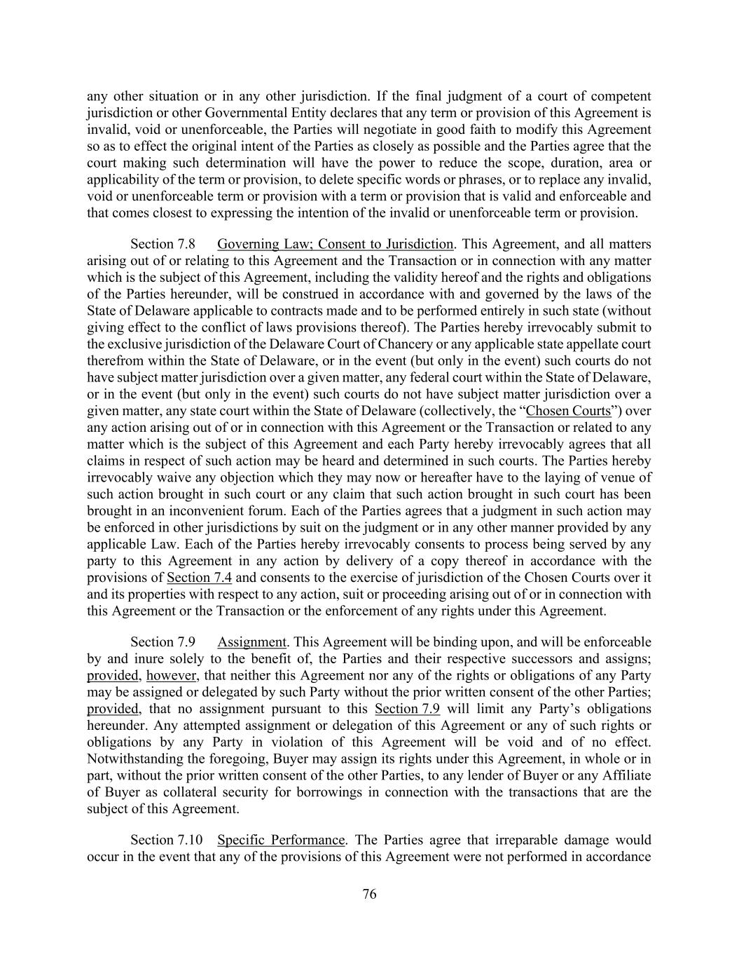 76 any other situation or in any other jurisdiction. If the final judgment of a court of competent jurisdiction or other Governmental Entity declares that any term or provision of this Agreement is invalid, void or unenforceable, the Parties will negotiate in good faith to modify this Agreement so as to effect the original intent of the Parties as closely as possible and the Parties agree that the court making such determination will have the power to reduce the scope, duration, area or applicability of the term or provision, to delete specific words or phrases, or to replace any invalid, void or unenforceable term or provision with a term or provision that is valid and enforceable and that comes closest to expressing the intention of the invalid or unenforceable term or provision. Section 7.8 Governing Law; Consent to Jurisdiction. This Agreement, and all matters arising out of or relating to this Agreement and the Transaction or in connection with any matter which is the subject of this Agreement, including the validity hereof and the rights and obligations of the Parties hereunder, will be construed in accordance with and governed by the laws of the State of Delaware applicable to contracts made and to be performed entirely in such state (without giving effect to the conflict of laws provisions thereof). The Parties hereby irrevocably submit to the exclusive jurisdiction of the Delaware Court of Chancery or any applicable state appellate court therefrom within the State of Delaware, or in the event (but only in the event) such courts do not have subject matter jurisdiction over a given matter, any federal court within the State of Delaware, or in the event (but only in the event) such courts do not have subject matter jurisdiction over a given matter, any state court within the State of Delaware (collectively, the “Chosen Courts”) over any action arising out of or in connection with this Agreement or the Transaction or related to any matter which is the subject of this Agreement and each Party hereby irrevocably agrees that all claims in respect of such action may be heard and determined in such courts. The Parties hereby irrevocably waive any objection which they may now or hereafter have to the laying of venue of such action brought in such court or any claim that such action brought in such court has been brought in an inconvenient forum. Each of the Parties agrees that a judgment in such action may be enforced in other jurisdictions by suit on the judgment or in any other manner provided by any applicable Law. Each of the Parties hereby irrevocably consents to process being served by any party to this Agreement in any action by delivery of a copy thereof in accordance with the provisions of Section 7.4 and consents to the exercise of jurisdiction of the Chosen Courts over it and its properties with respect to any action, suit or proceeding arising out of or in connection with this Agreement or the Transaction or the enforcement of any rights under this Agreement. Section 7.9 Assignment. This Agreement will be binding upon, and will be enforceable by and inure solely to the benefit of, the Parties and their respective successors and assigns; provided, however, that neither this Agreement nor any of the rights or obligations of any Party may be assigned or delegated by such Party without the prior written consent of the other Parties; provided, that no assignment pursuant to this Section 7.9 will limit any Party’s obligations hereunder. Any attempted assignment or delegation of this Agreement or any of such rights or obligations by any Party in violation of this Agreement will be void and of no effect. Notwithstanding the foregoing, Buyer may assign its rights under this Agreement, in whole or in part, without the prior written consent of the other Parties, to any lender of Buyer or any Affiliate of Buyer as collateral security for borrowings in connection with the transactions that are the subject of this Agreement. Section 7.10 Specific Performance. The Parties agree that irreparable damage would occur in the event that any of the provisions of this Agreement were not performed in accordance