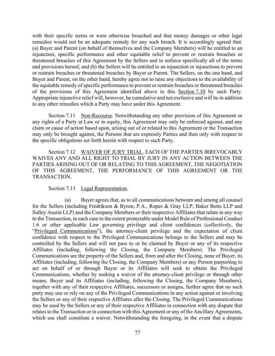 77 with their specific terms or were otherwise breached and that money damages or other legal remedies would not be an adequate remedy for any such breach. It is accordingly agreed that: (a) Buyer and Parent (on behalf of themselves and the Company Members) will be entitled to an injunction, specific performance and other equitable relief to prevent or restrain breaches or threatened breaches of this Agreement by the Sellers and to enforce specifically all of the terms and provisions hereof, and (b) the Sellers will be entitled to an injunction or injunctions to prevent or restrain breaches or threatened breaches by Buyer or Parent. The Sellers, on the one hand, and Buyer and Parent, on the other hand, hereby agree not to raise any objections to the availability of the equitable remedy of specific performance to prevent or restrain breaches or threatened breaches of the provisions of this Agreement identified above in this Section 7.10 by such Party. Appropriate injunctive relief will, however, be cumulative and not exclusive and will be in addition to any other remedies which a Party may have under this Agreement. Section 7.11 Non-Recourse. Notwithstanding any other provision of this Agreement or any rights of a Party at Law or in equity, this Agreement may only be enforced against, and any claim or cause of action based upon, arising out of or related to this Agreement or the Transaction may only be brought against, the Persons that are expressly Parties and then only with respect to the specific obligations set forth herein with respect to such Party. Section 7.12 WAIVER OF JURY TRIAL. EACH OF THE PARTIES IRREVOCABLY WAIVES ANY AND ALL RIGHT TO TRIAL BY JURY IN ANY ACTION BETWEEN THE PARTIES ARISING OUT OF OR RELATING TO THIS AGREEMENT, THE NEGOTIATION OF THIS AGREEMENT, THE PERFORMANCE OF THIS AGREEMENT OR THE TRANSACTION. Section 7.13 Legal Representation. (a) Buyer agrees that, as to all communications between and among all counsel for the Sellers (including Fredrikson & Byron, P.A., Ropes & Gray LLP, Baker Botts LLP and Sidley Austin LLP) and the Company Members or their respective Affiliates that relate in any way to the Transaction, in each case to the extent protectable under Model Rule of Professional Conduct 1.6 or other applicable Law governing privilege and client confidences (collectively, the “Privileged Communications”), the attorney-client privilege and the expectation of client confidence with respect to the Privileged Communications belongs to the Sellers and may be controlled by the Sellers and will not pass to or be claimed by Buyer or any of its respective Affiliates (including, following the Closing, the Company Members). The Privileged Communications are the property of the Sellers and, from and after the Closing, none of Buyer, its Affiliates (including, following the Closing, the Company Members) or any Person purporting to act on behalf of or through Buyer or its Affiliates will seek to obtain the Privileged Communications, whether by seeking a waiver of the attorney-client privilege or through other means. Buyer and its Affiliates (including, following the Closing, the Company Members), together with any of their respective Affiliates, successors or assigns, further agree that no such party may use or rely on any of the Privileged Communications in any action against or involving the Sellers or any of their respective Affiliates after the Closing. The Privileged Communications may be used by the Sellers or any of their respective Affiliates in connection with any dispute that relates to the Transaction or in connection with this Agreement or any of the Ancillary Agreements, which use shall constitute a waiver. Notwithstanding the foregoing, in the event that a dispute